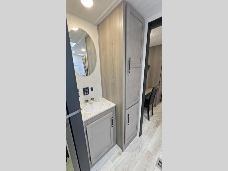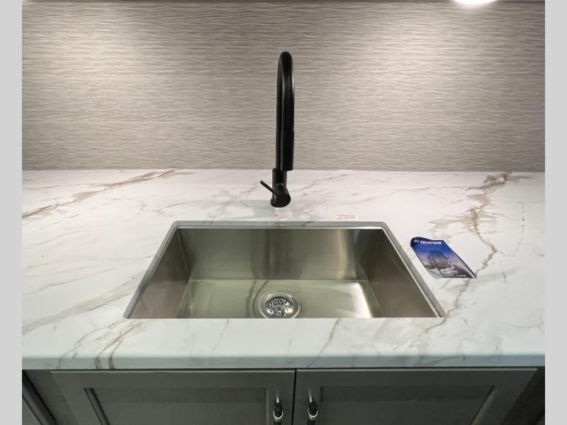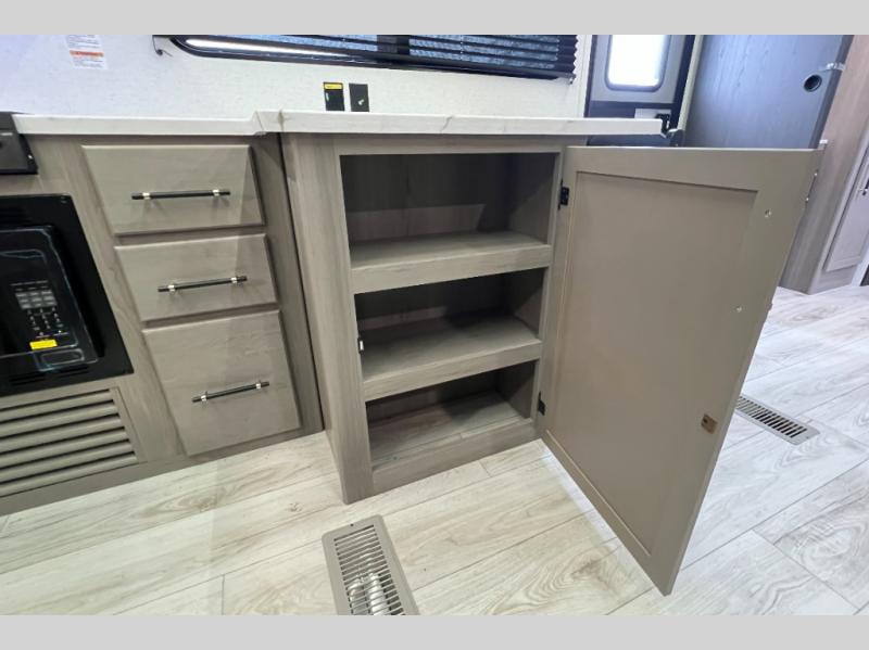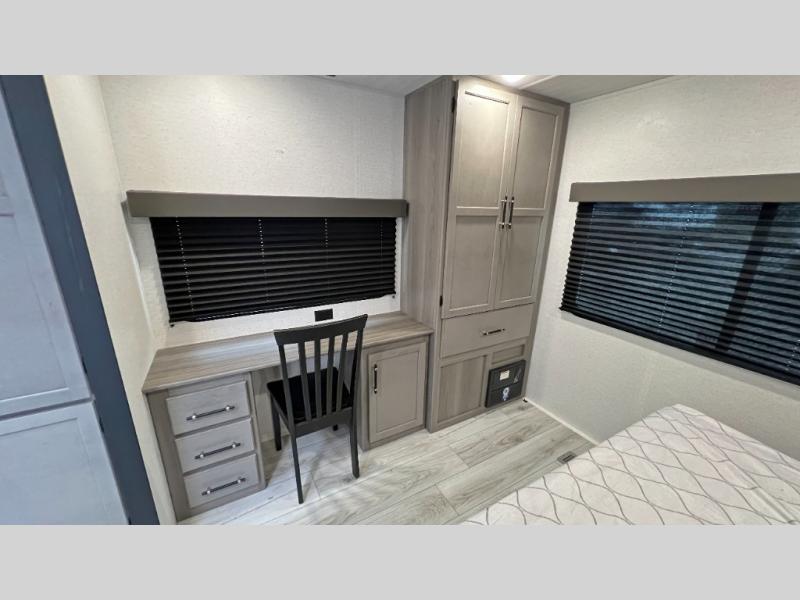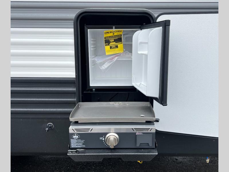 Will you choose to take this travel trailer to the lake or woods? Wherever you choose, you will be met with many comforts. The rear private bedroom includes a queen bed slide out for more floor space plus a desk with a chair if you need to get some work done. A walk-through bath will be easily accessible, and there is a spacious linen closet to keep towels clean. Head to main living room to relax on the tri-fold sofa or make dinner in the front kitchen. The counter with two chairs provides a place to eat breakfast each morning, and the lower pantry will be perfect for extra snacks. This model also includes an outdoor kitchen under the 18' power awning; how convenient!