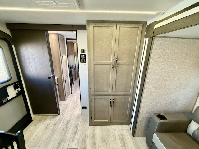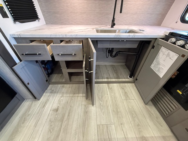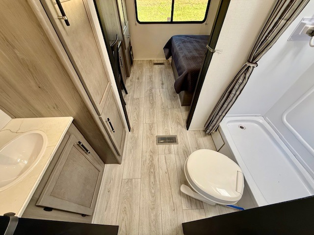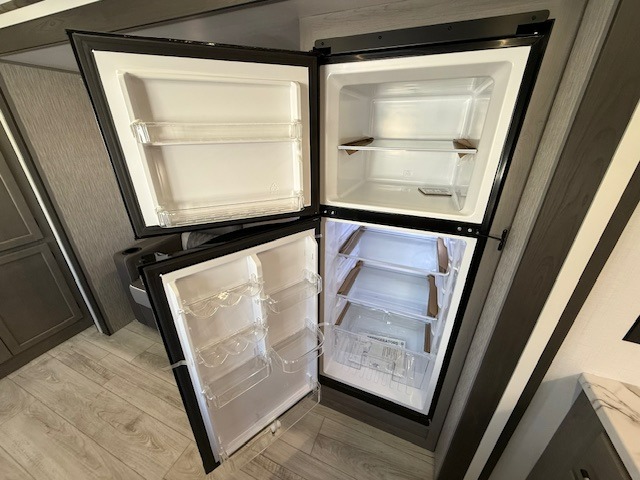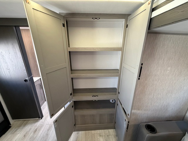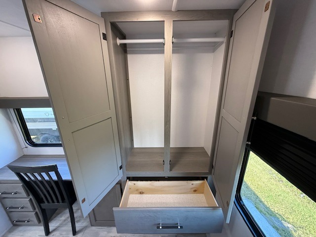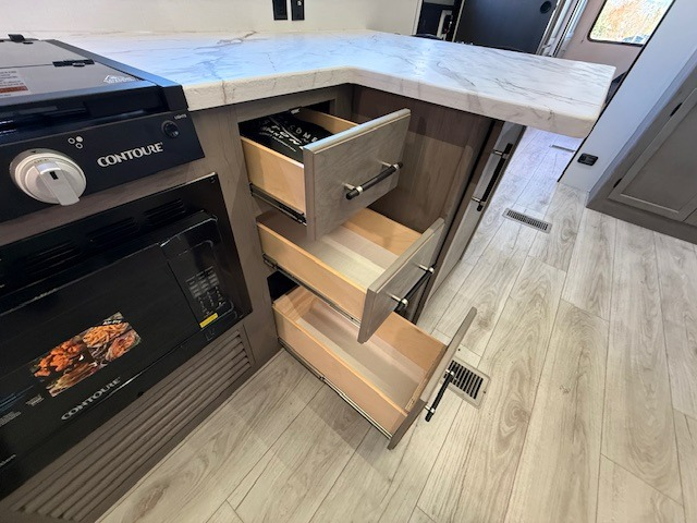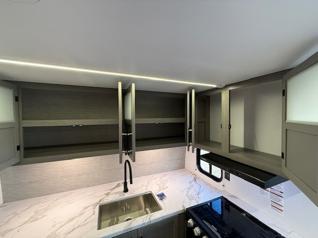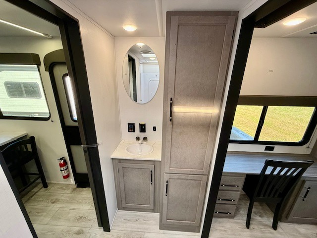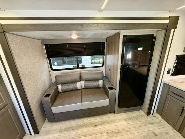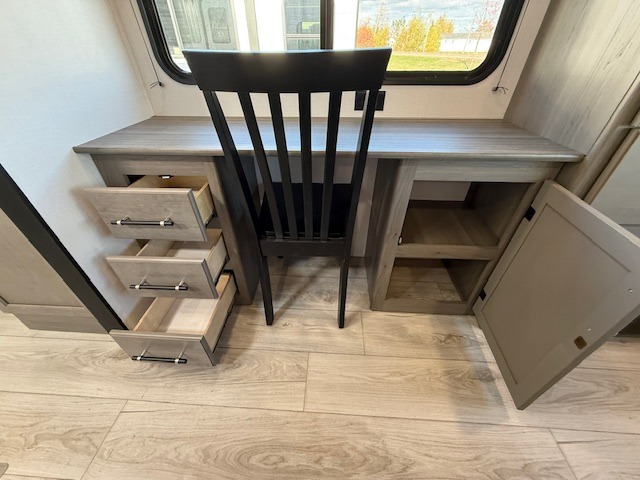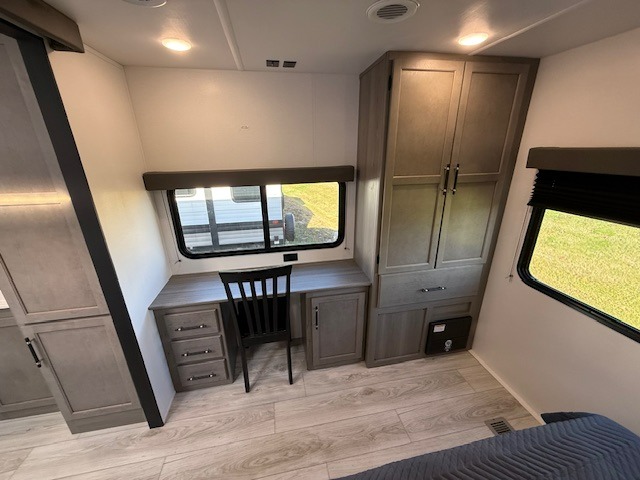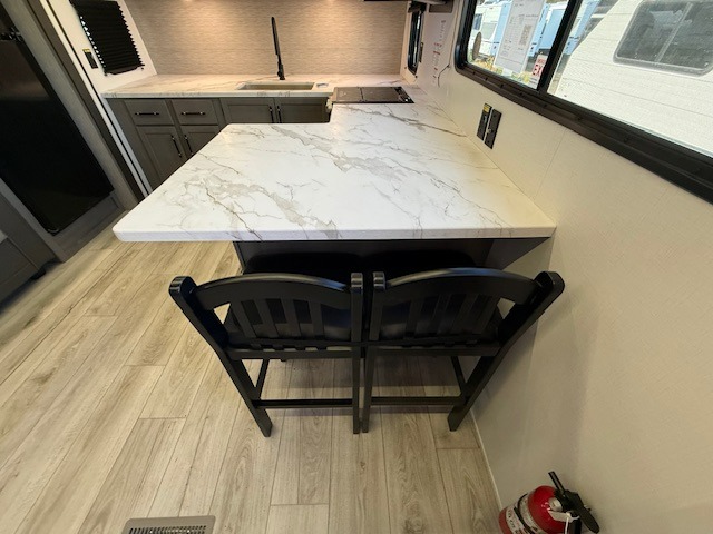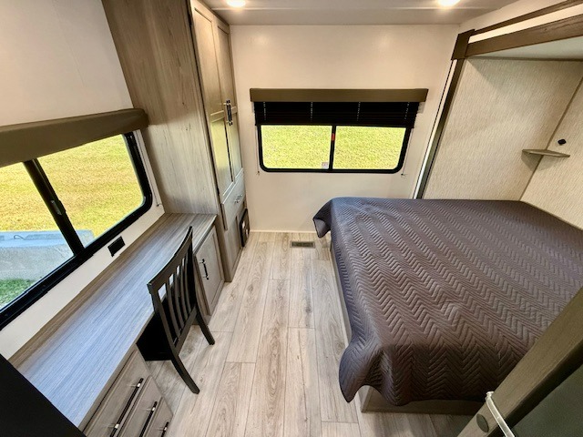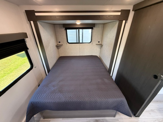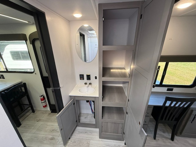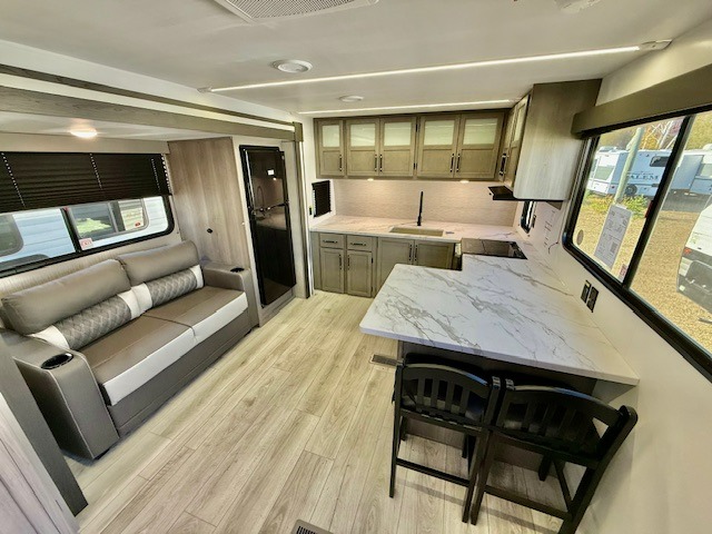 Will you choose to take this travel trailer to the lake or woods? Wherever you choose, you will be met with many comforts. The rear private bedroom includes a queen bed slide out for more floor space plus a desk with a chair if you need to get some work done. A walk-through bath will be easily accessible, and there is a spacious linen closet to keep towels clean. Head to main living room to relax on the tri-fold sofa or make dinner in the front kitchen. The counter with two chairs provides a place to eat breakfast each morning, and the lower pantry will be perfect for extra snacks. This model also includes an outdoor kitchen under the 18' power awning; how convenient!
