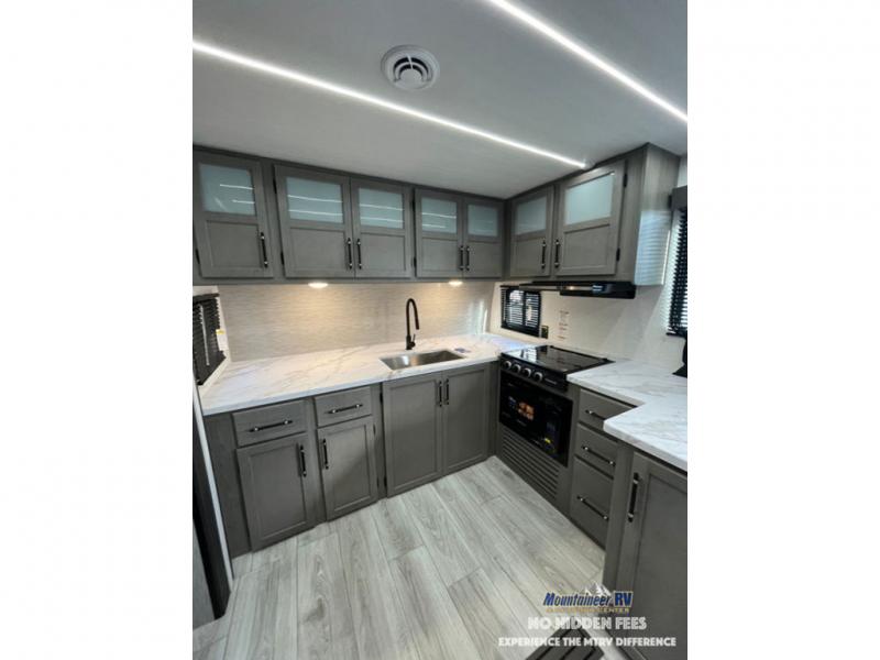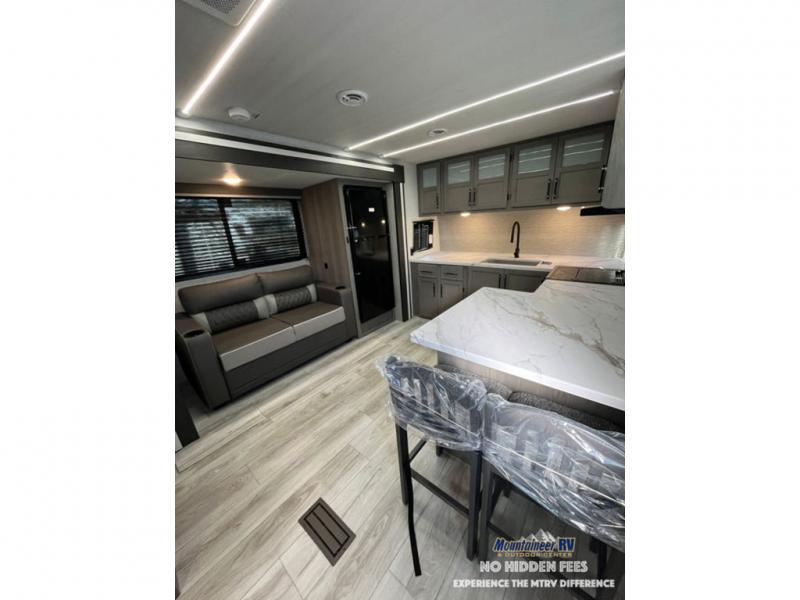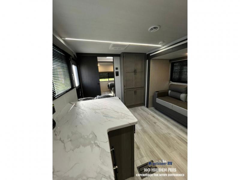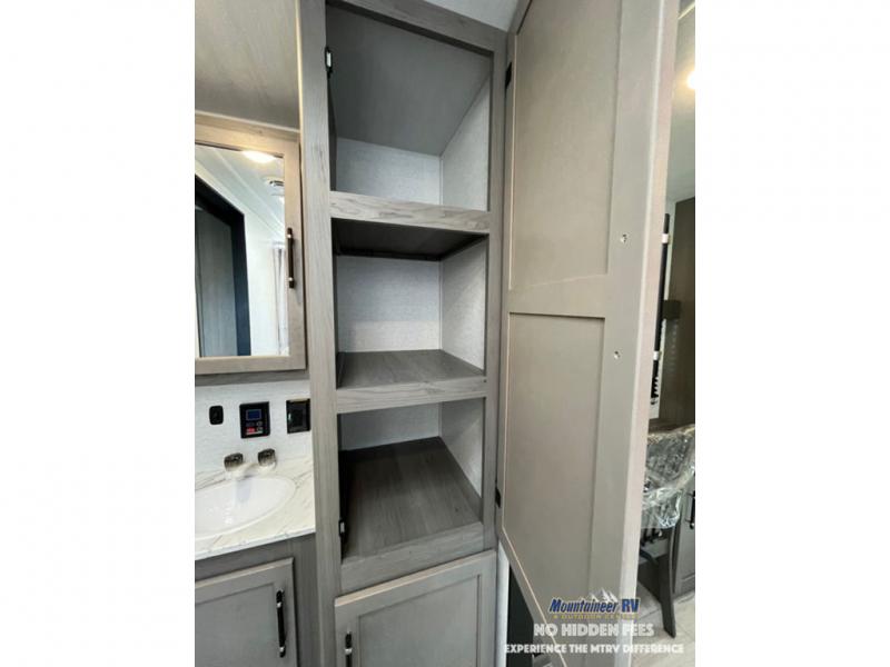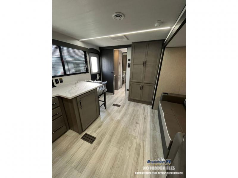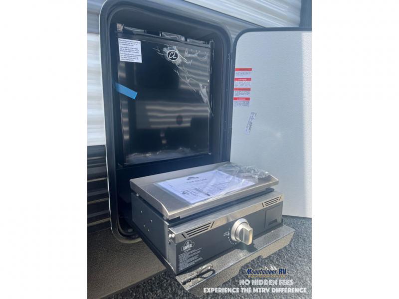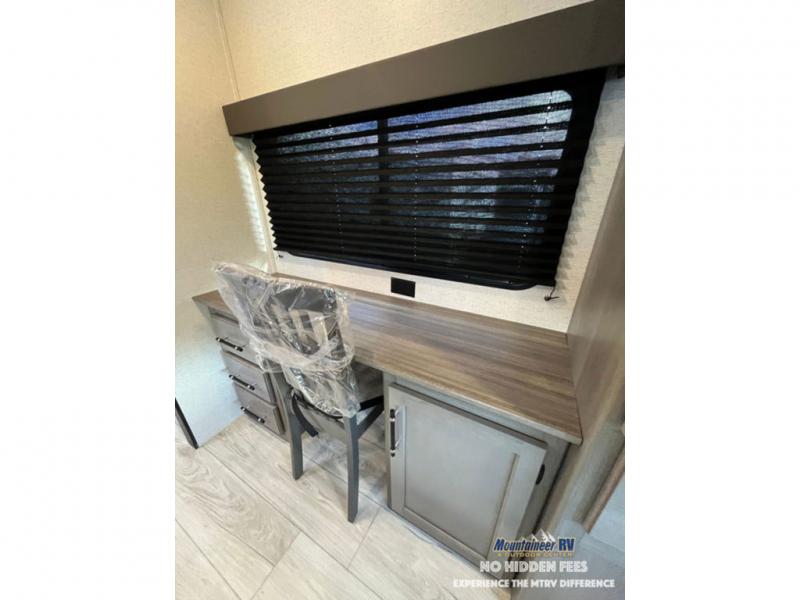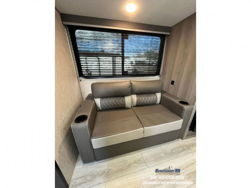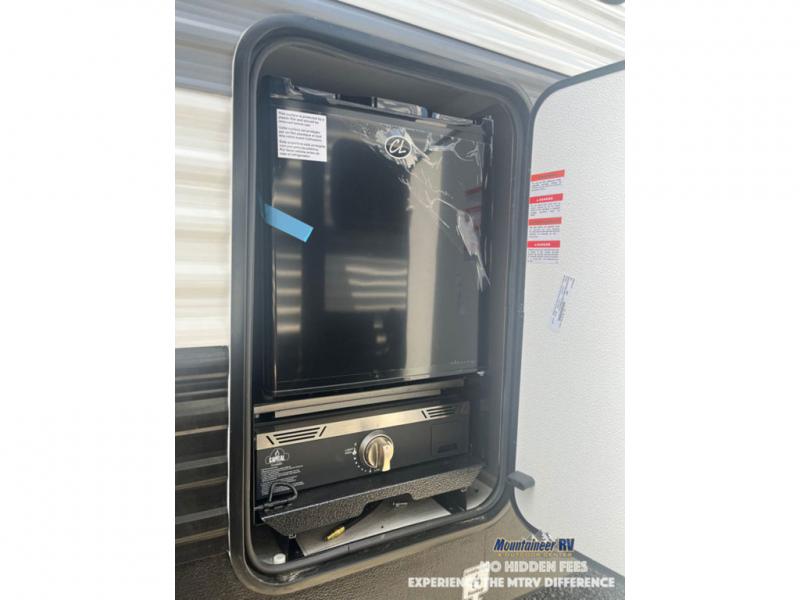 Will you choose to take this travel trailer to the lake or woods? Wherever you choose, you will be met with many comforts. The rear private bedroom includes a queen bed slide out for more floor space plus a desk with a chair if you need to get some work done. A walk-through bath will be easily accessible, and there is a spacious linen closet to keep towels clean. Head to main living room to relax on the tri-fold sofa or make dinner in the front kitchen. The counter with two chairs provides a place to eat breakfast each morning, and the lower pantry will be perfect for extra snacks. This model also includes an outdoor kitchen under the 18' power awning; how convenient!
