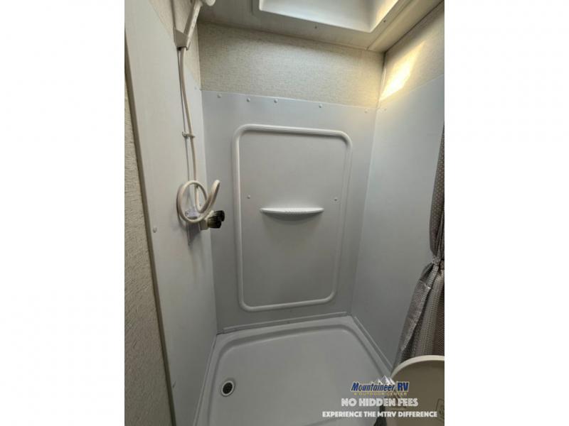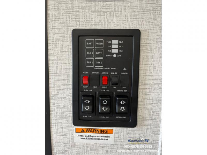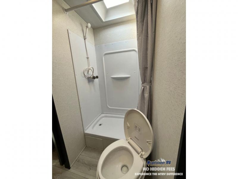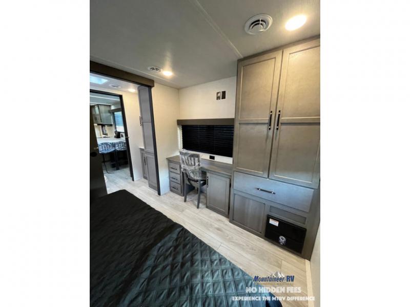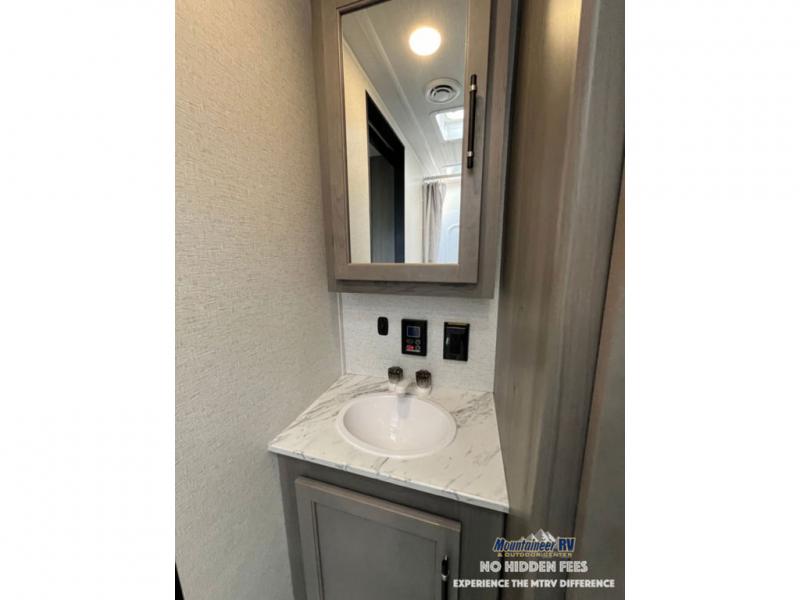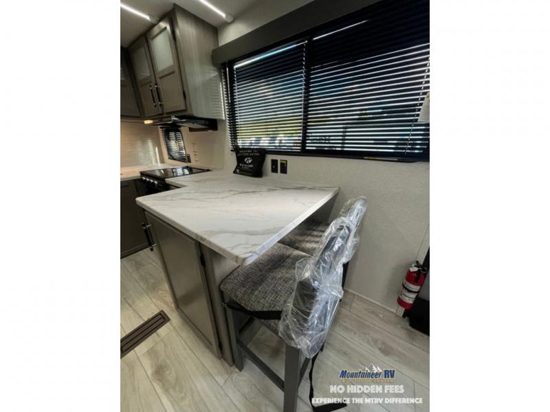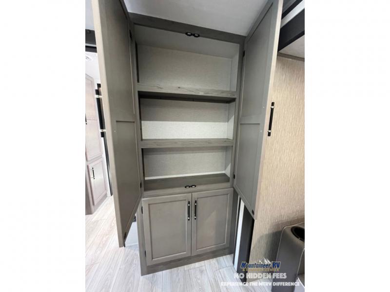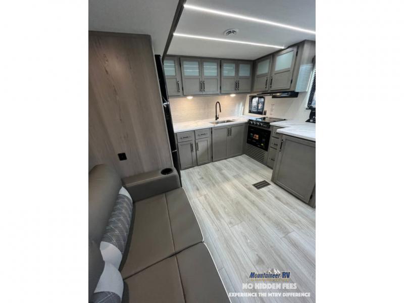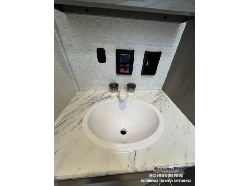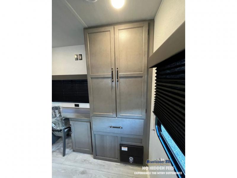 Will you choose to take this travel trailer to the lake or woods? Wherever you choose, you will be met with many comforts. The rear private bedroom includes a queen bed slide out for more floor space plus a desk with a chair if you need to get some work done. A walk-through bath will be easily accessible, and there is a spacious linen closet to keep towels clean. Head to main living room to relax on the tri-fold sofa or make dinner in the front kitchen. The counter with two chairs provides a place to eat breakfast each morning, and the lower pantry will be perfect for extra snacks. This model also includes an outdoor kitchen under the 18' power awning; how convenient!