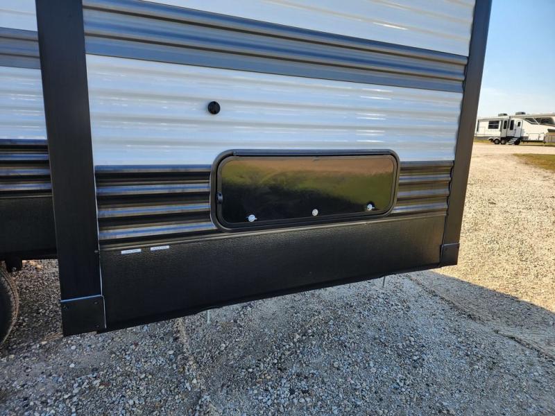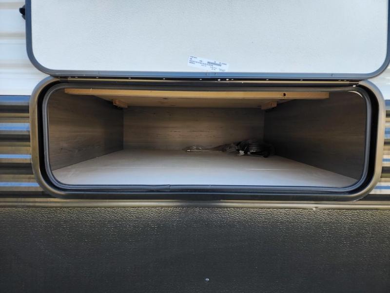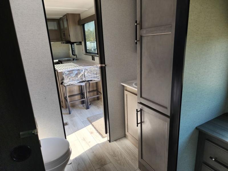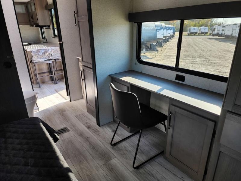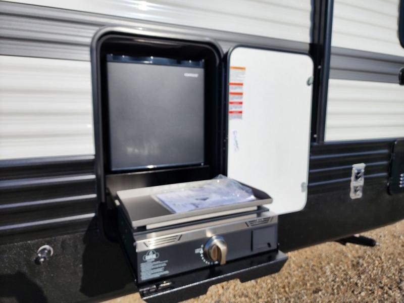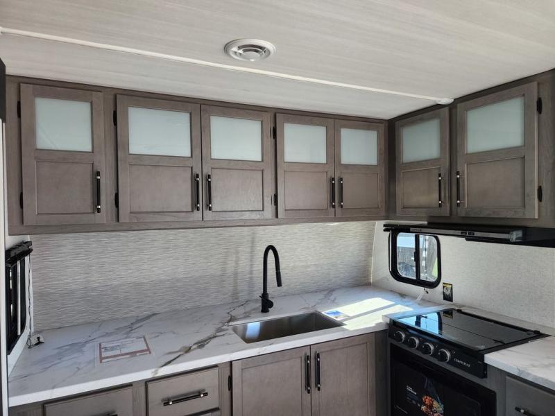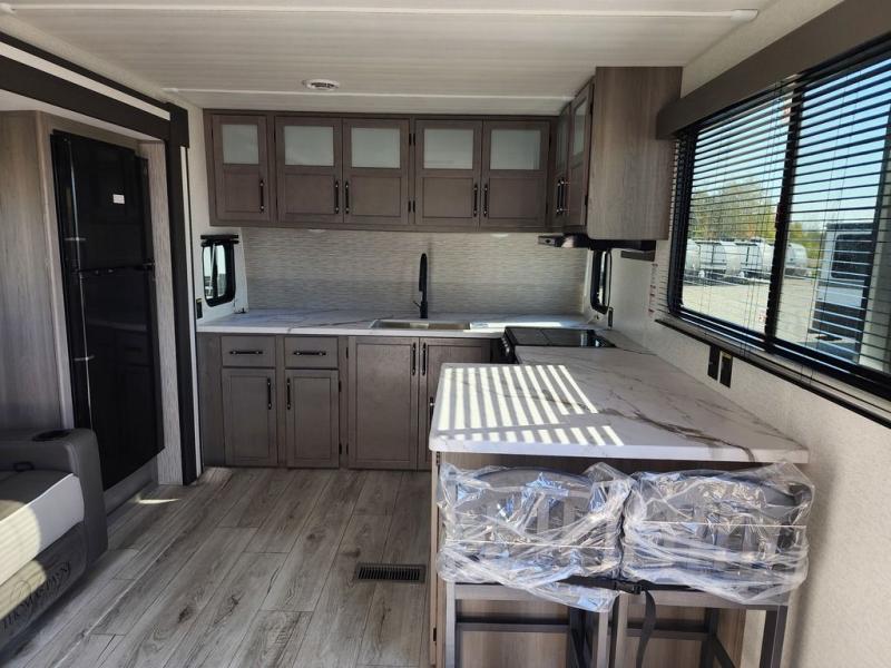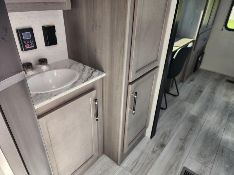 Will you choose to take this travel trailer to the lake or woods? Wherever you choose, you will be met with many comforts. The rear private bedroom includes a queen bed slide out for more floor space plus a desk with a chair if you need to get some work done. A walk-through bath will be easily accessible, and there is a spacious linen closet to keep towels clean. Head to main living room to relax on the tri-fold sofa or make dinner in the front kitchen. The counter with two chairs provides a place to eat breakfast each morning, and the lower pantry will be perfect for extra snacks. This model also includes an outdoor kitchen under the 18' power awning; how convenient!