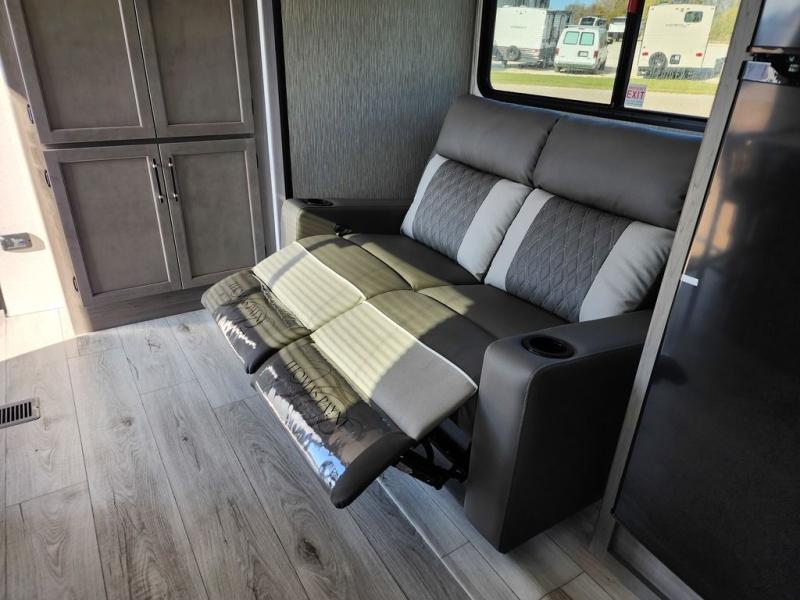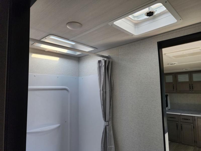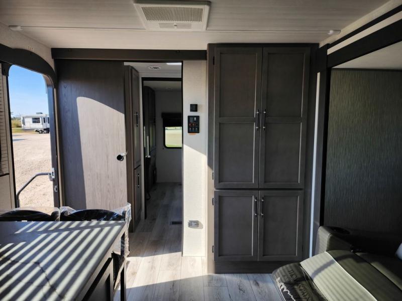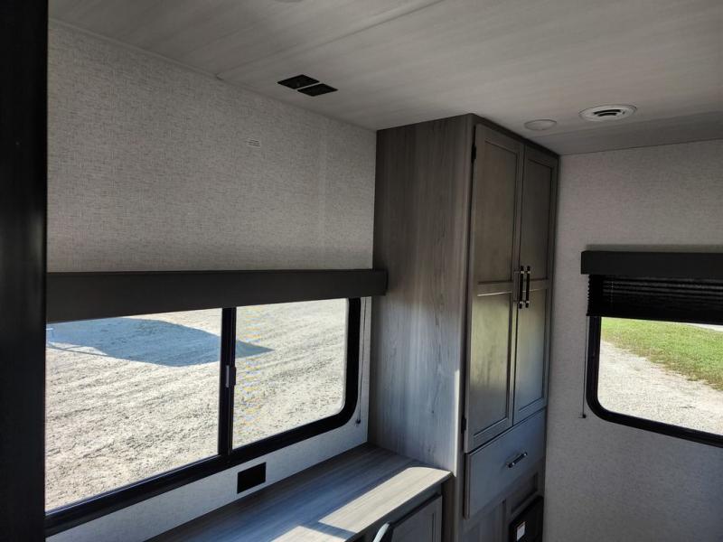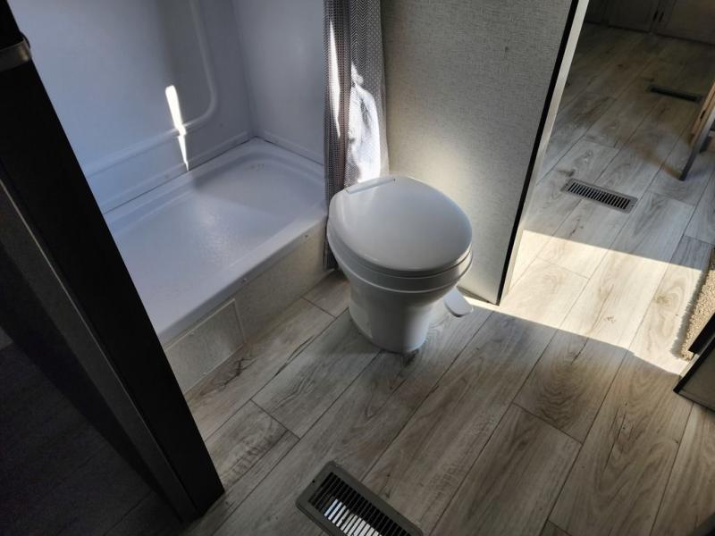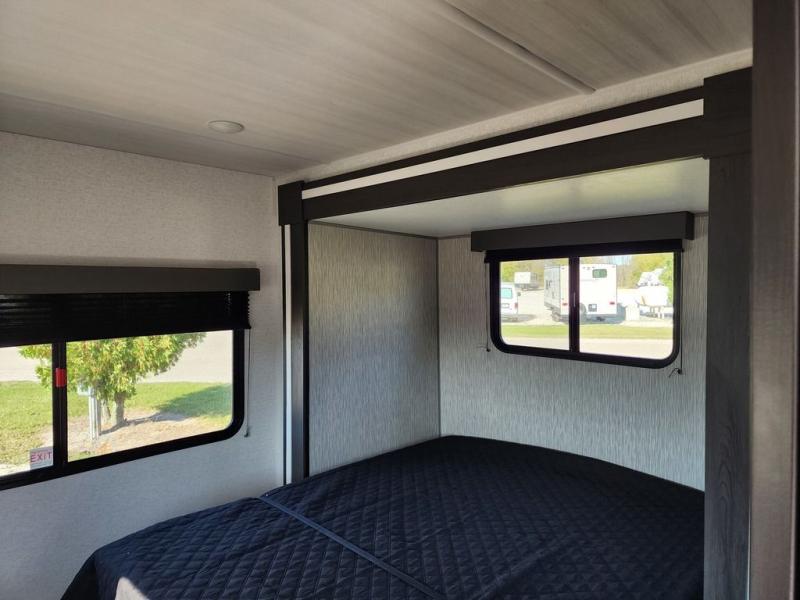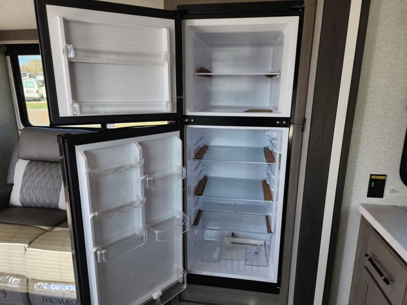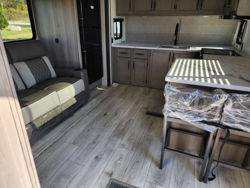 Will you choose to take this travel trailer to the lake or woods? Wherever you choose, you will be met with many comforts. The rear private bedroom includes a queen bed slide out for more floor space plus a desk with a chair if you need to get some work done. A walk-through bath will be easily accessible, and there is a spacious linen closet to keep towels clean. Head to main living room to relax on the tri-fold sofa or make dinner in the front kitchen. The counter with two chairs provides a place to eat breakfast each morning, and the lower pantry will be perfect for extra snacks. This model also includes an outdoor kitchen under the 18' power awning; how convenient!
