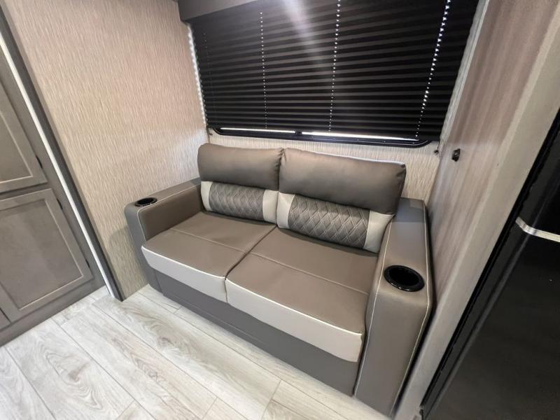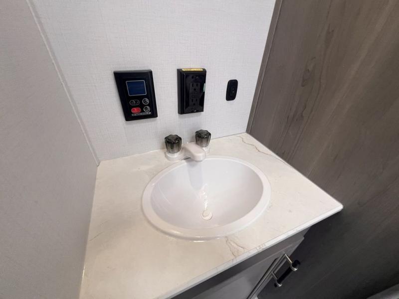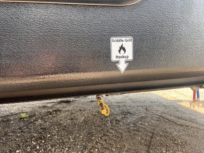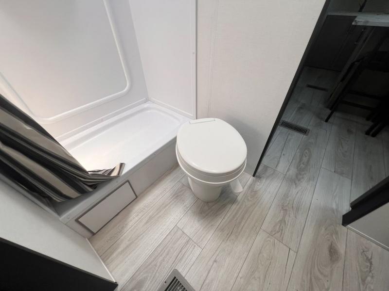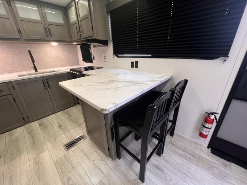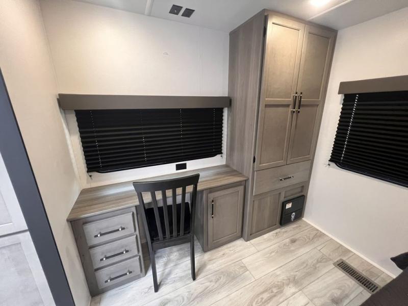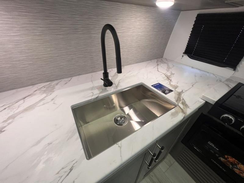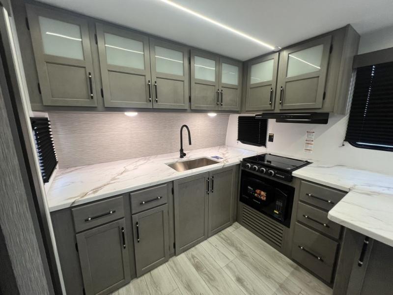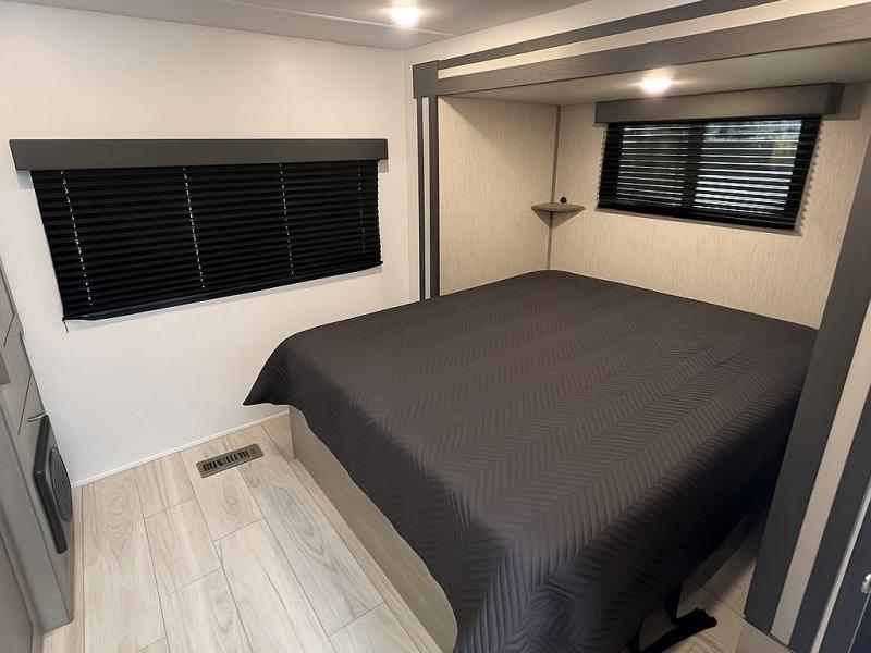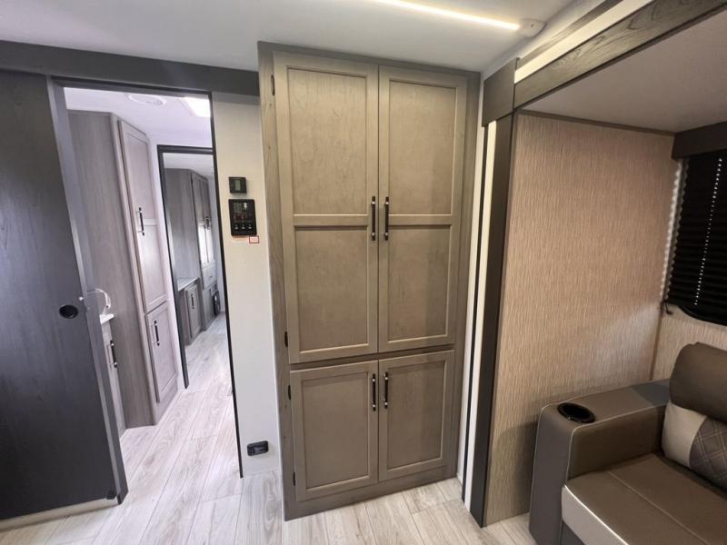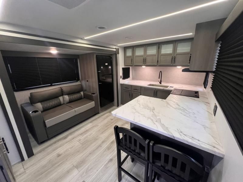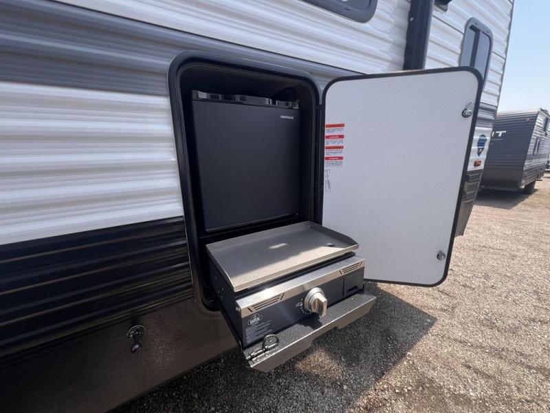Will you choose to take this travel trailer to the lake or woods? Wherever you choose, you will be met with many comforts. The rear private bedroom includes a queen bed slide out for more floor space plus a desk with a chair if you need to get some work done. A walk-through bath will be easily accessible, and there is a spacious linen closet to keep towels clean. Head to main living room to relax on the tri-fold sofa or make dinner in the front kitchen. The counter with two chairs provides a place to eat breakfast each morning, and the lower pantry will be perfect for extra snacks. This model also includes an outdoor kitchen under the 18' power awning; how convenient!