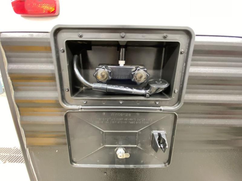 You can hide out for days at a time with this Hideout travel trailer! There is a slide out for extra living space, and here you'll find the booth dinette and tri-fold sofa. The rear bathroom is large and accommodating with its large countertop, spacious shower, and linen closet. The front private bedroom has a queen-size bed with a laundry chute right next to it for keeping your dirty laundry hidden. You will also enjoy the 16' awning outdoors where you can visit in the shade!