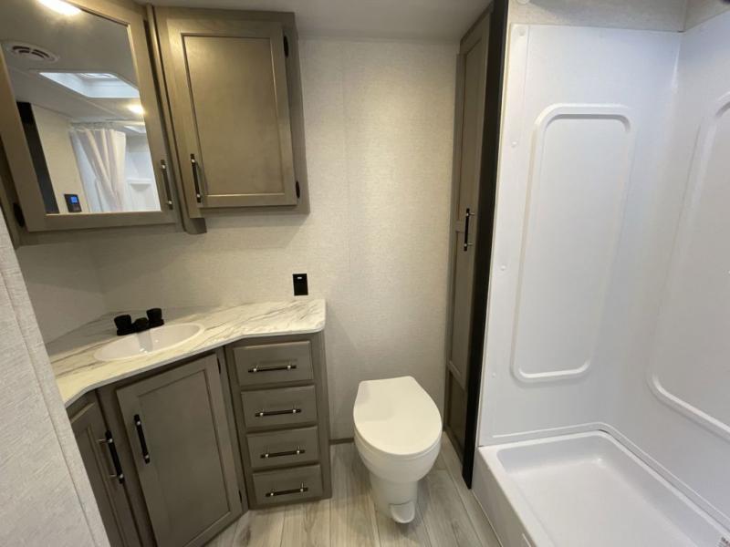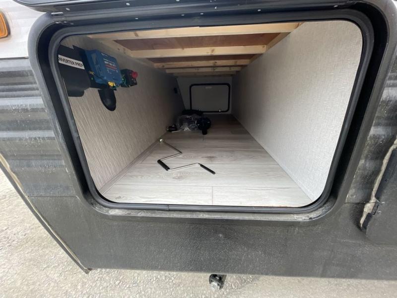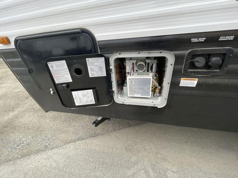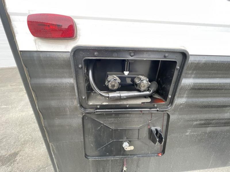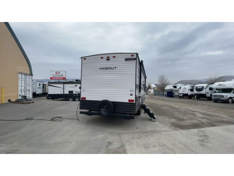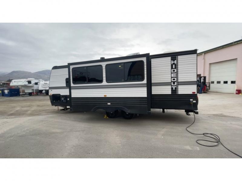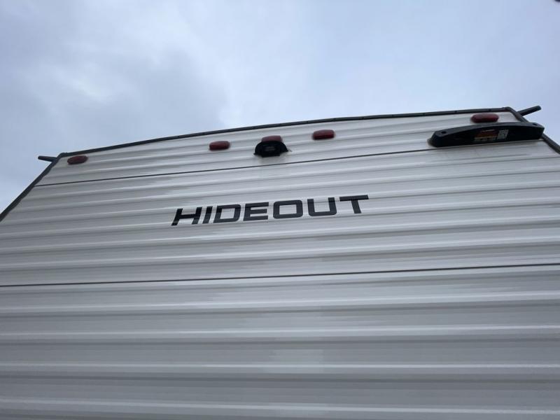 You can hide out for days at a time with this Hideout travel trailer! There is a slide out for extra living space, and here you'll find the booth dinette and tri-fold sofa. The rear bathroom is large and accommodating with its large countertop, spacious shower, and linen closet. The front private bedroom has a queen-size bed with a laundry chute right next to it for keeping your dirty laundry hidden. You will also enjoy the 16' awning outdoors where you can visit in the shade!