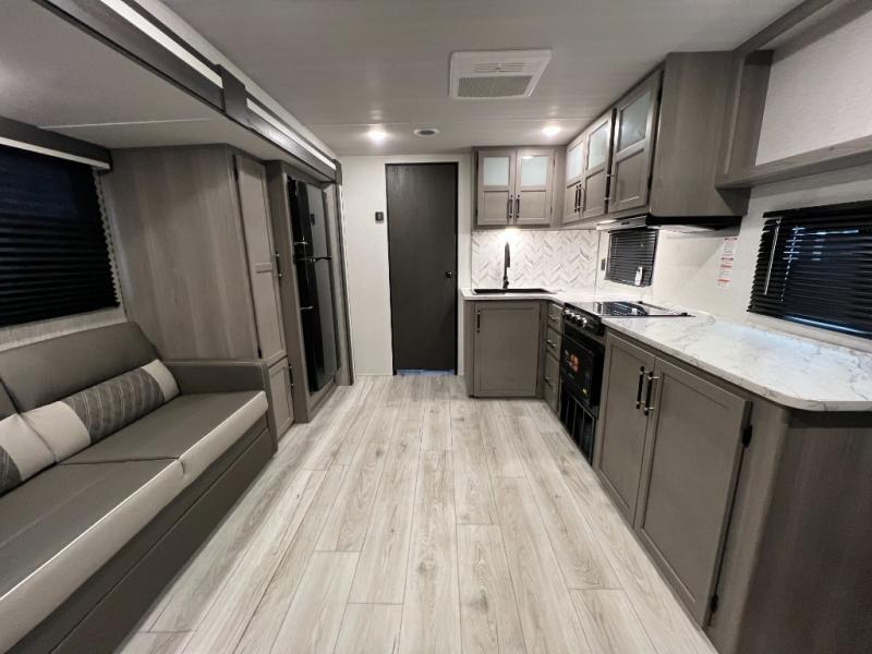 Enjoy every camping trip in this spacious dual entry travel trailer for six. You will love the rear U-dinette and the tri-fold sofa within the large slide out, and there is TV prep in the living area if you plan to bring along your television. Home cooked meals can be whipped up in a hurry on the three burner range, and there is plenty of counter space to cut up fresh veggies. The walk-through bath is convenient for everyone to access, and here you'll find a spacious shower and a linen closet for clean towels. Head to the master bedroom where you'll be met with a queen bed, dual nightstands and closets, a laundry chute, plus your own exterior entry door; how convenient. The exterior even has an outdoor refrigerator for cold drinks under the awning!