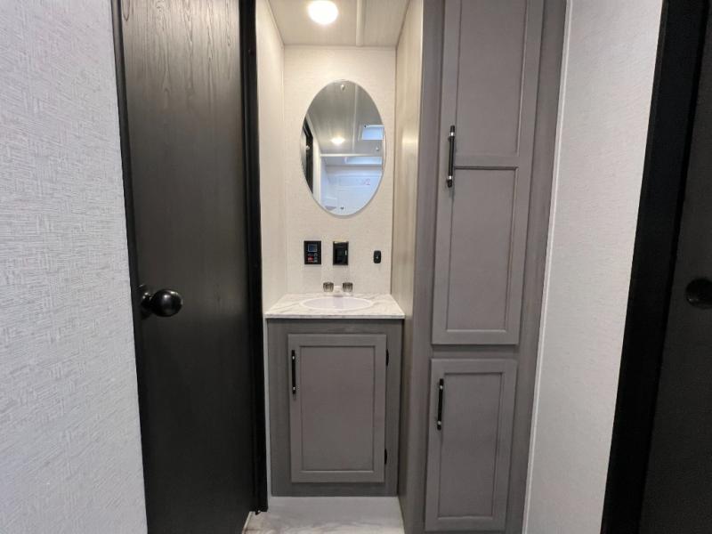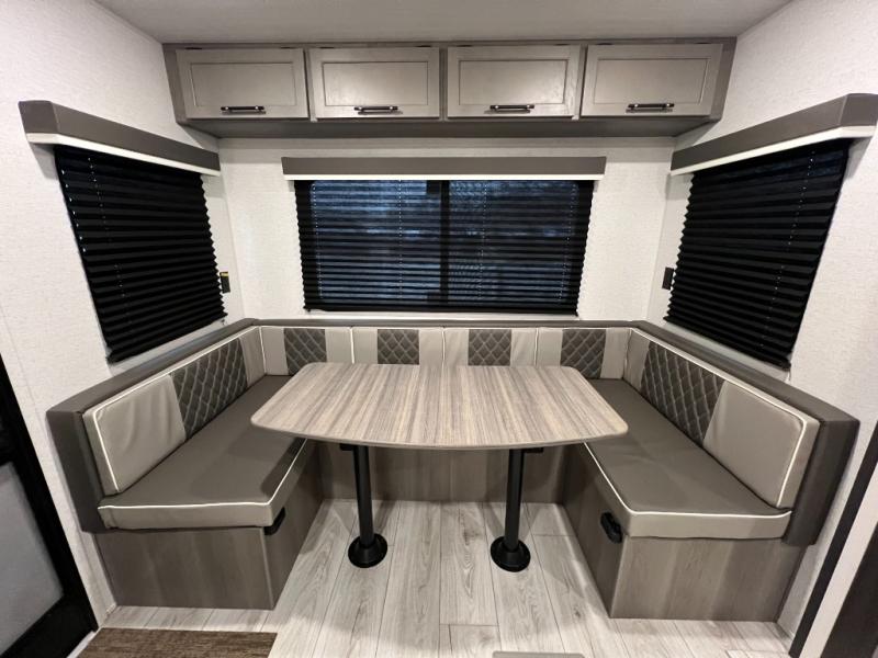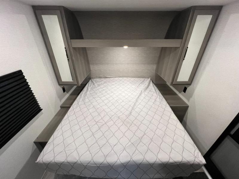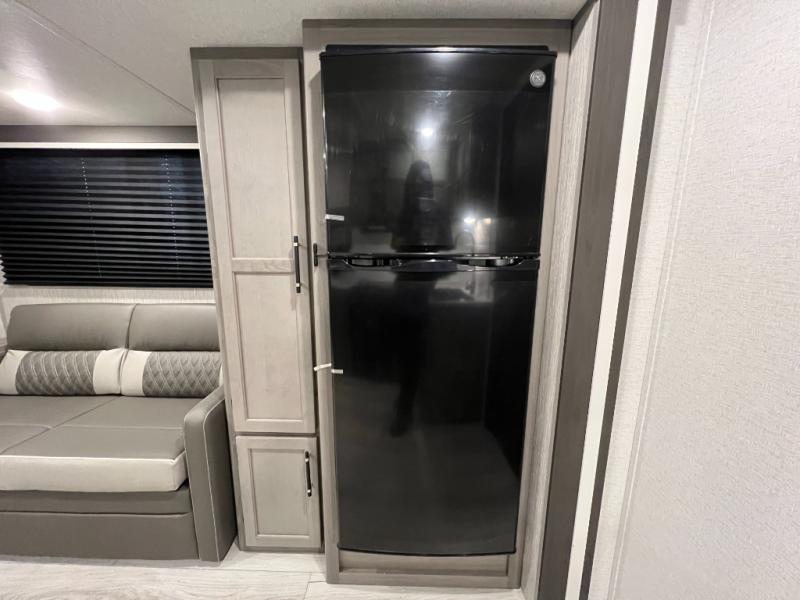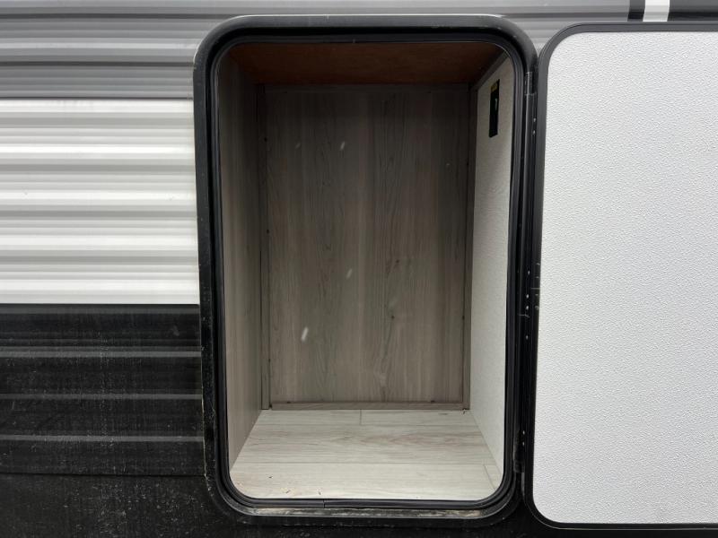 Enjoy every camping trip in this spacious dual entry travel trailer for six. You will love the rear U-dinette and the tri-fold sofa within the large slide out, and there is TV prep in the living area if you plan to bring along your television. Home cooked meals can be whipped up in a hurry on the three burner range, and there is plenty of counter space to cut up fresh veggies. The walk-through bath is convenient for everyone to access, and here you'll find a spacious shower and a linen closet for clean towels. Head to the master bedroom where you'll be met with a queen bed, dual nightstands and closets, a laundry chute, plus your own exterior entry door; how convenient. The exterior even has an outdoor refrigerator for cold drinks under the awning!