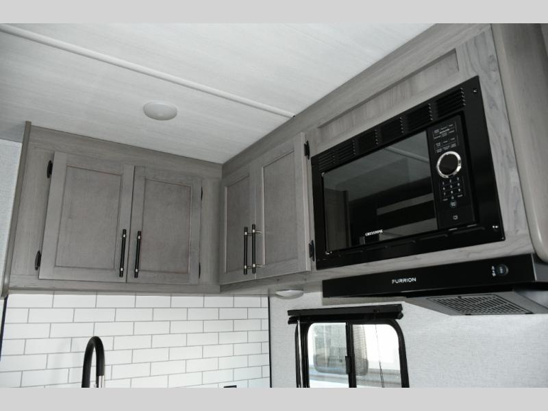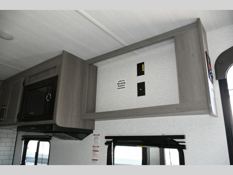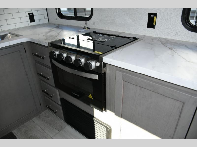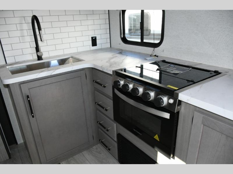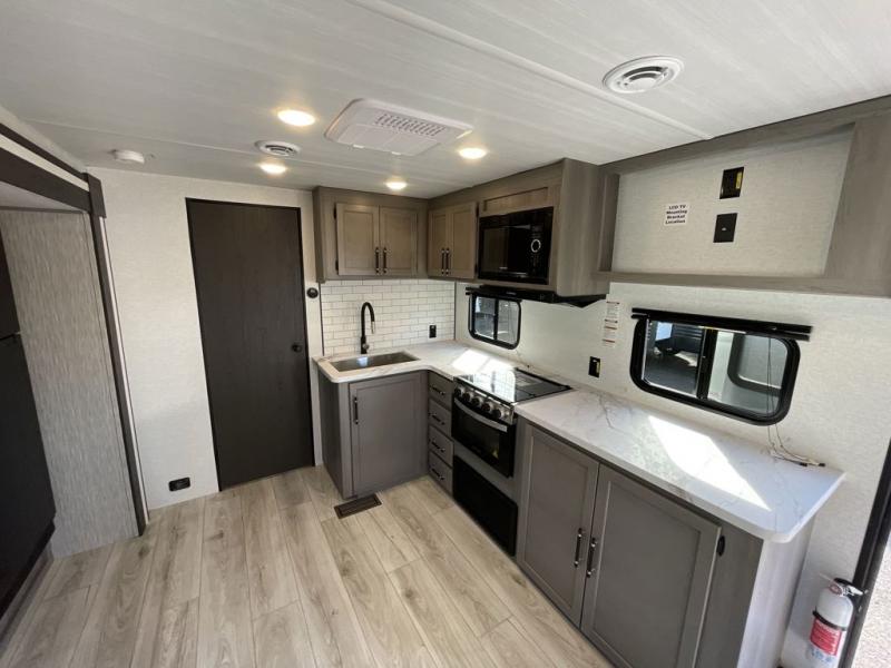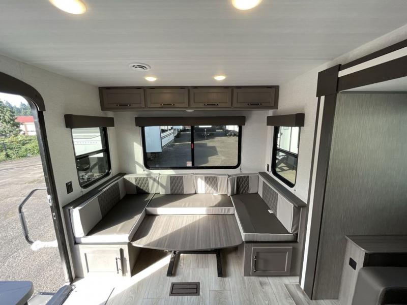 Step inside the rear living area to find a U-shaped dinette and sofa within a large slide out, providing a welcoming spot to gather for meals, games, or movie nights. TV prep is included so you can bring your entertainment along, while the kitchen features a three-burner range, generous counter space, pantry, and an outdoor refrigerator—perfect for meal prep whether you’re inside or enjoying the fresh air outdoors.