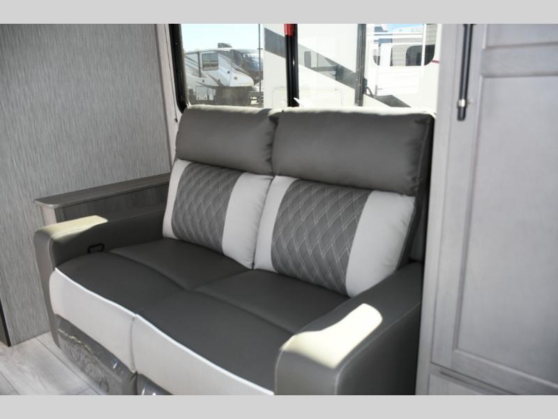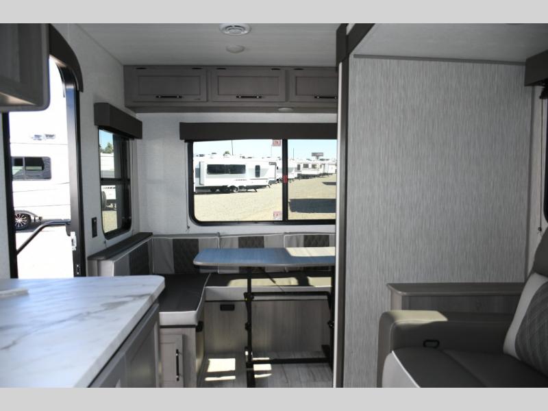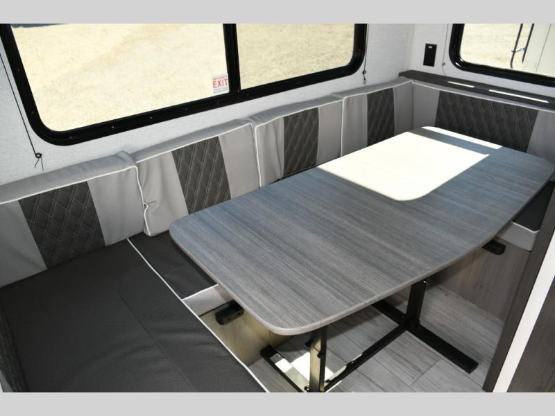 Step inside the rear living area to find a U-shaped dinette and sofa within a large slide out.