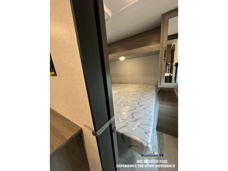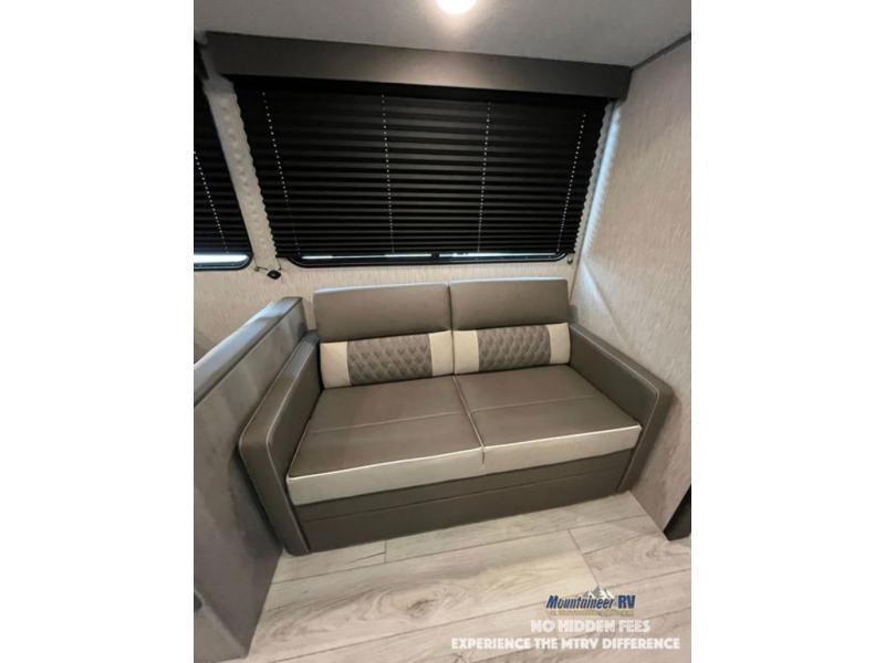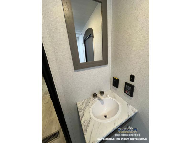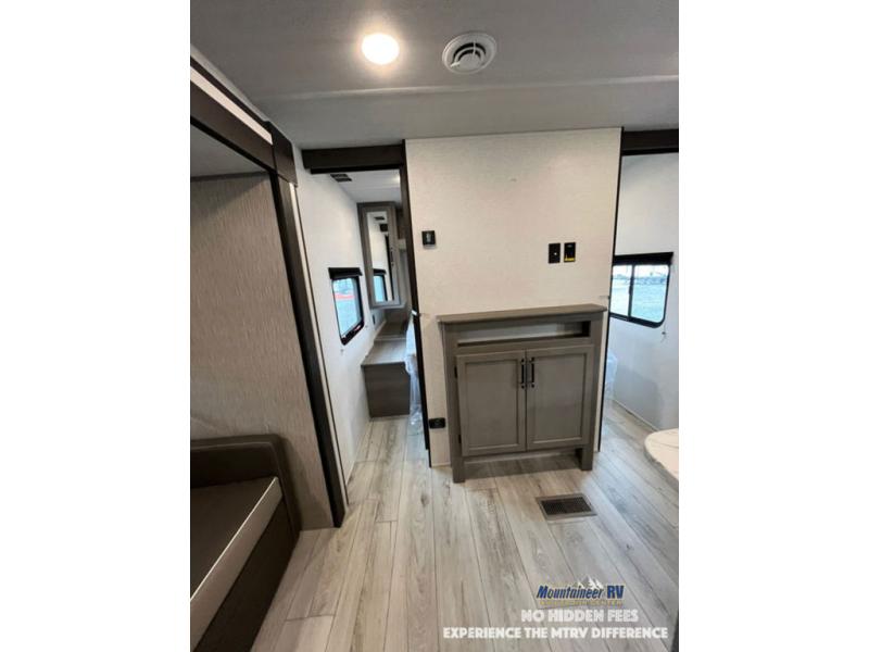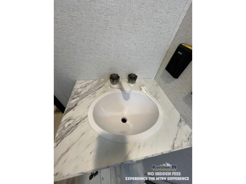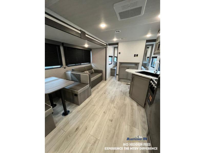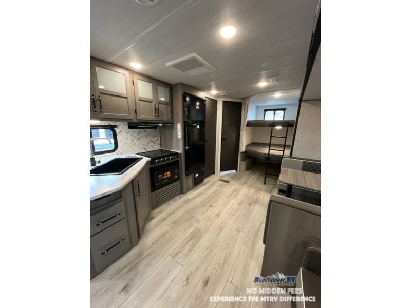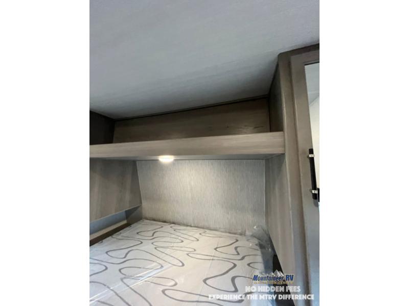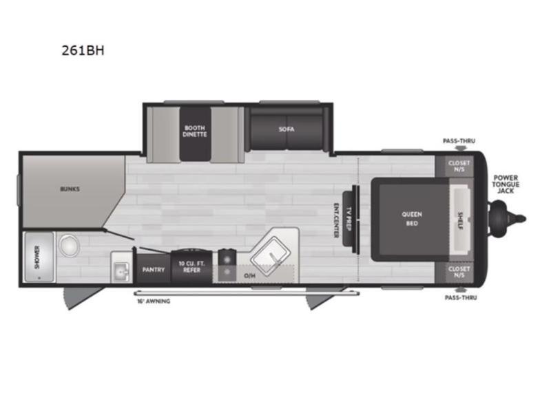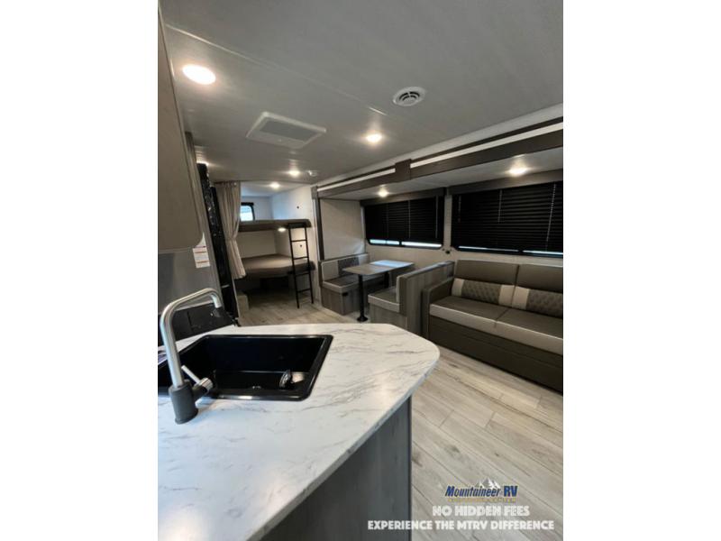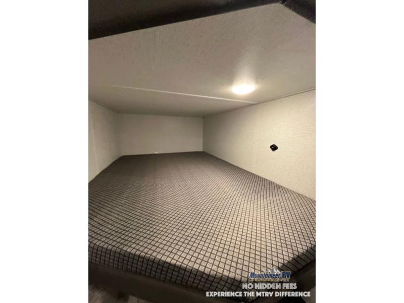 Pack your bags and head for the lake or woods in this spacious trailer! You can comfortably sleep nine to ten with the double-size bunks and the queen bed in the front private bedroom, plus the booth dinette and sofa in the main living area. There is even TV prep here if you want to add a television to the entertainment center for movie nights. The kitchen includes a 10 cu. ft. 12V refrigerator and an extra large pantry for food storage, plus a cooktop to prepare meals each day. The full bath included will let you clean up after a day of exploring outdoors, and you'll find the second entry door here for convenience!