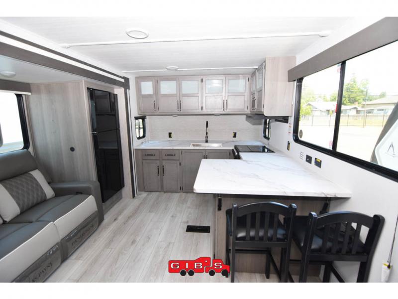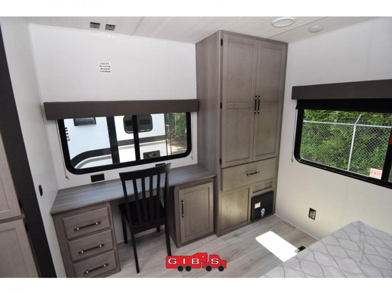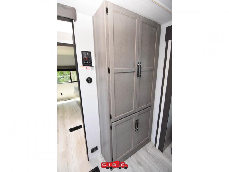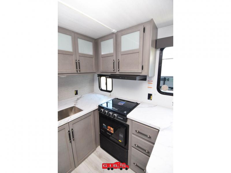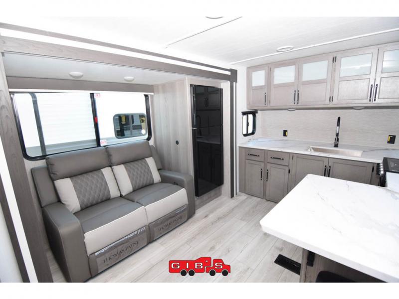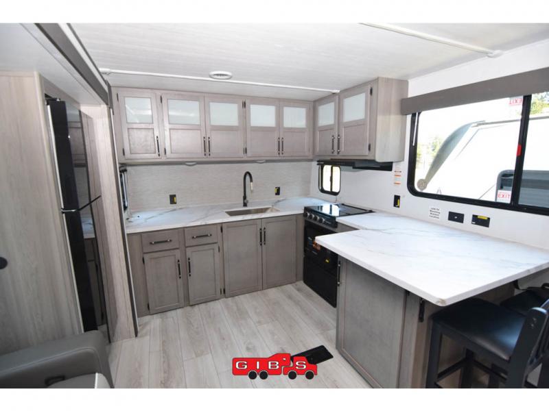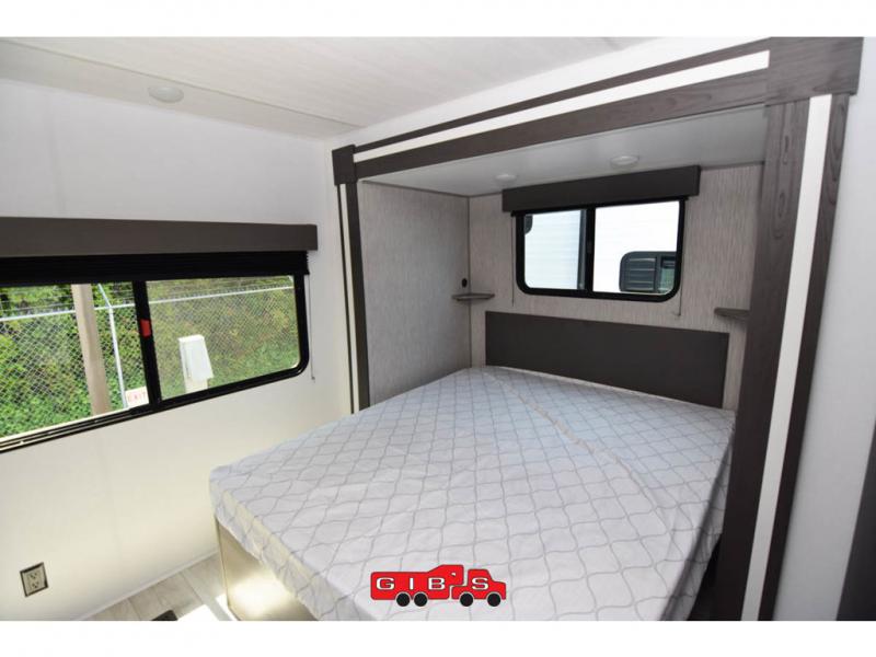 This dual entry, front kitchen travel trailer will be perfect for your crew of seven to eight! There is a rear private bedroom with its own exterior entry door and a walk-around queen bed for added convenience. The little ones will love the hidden bunk beds, which are close by the walk-through bath for easy nighttime use, and any other guests can sleep on the sofa or booth dinette within the large slide out. This model includes ample storage space, including an exterior pass-through compartment, a spacious kitchen pantry, a dual linen closet in the bath, and even convenient shoe storage by the main entry door!