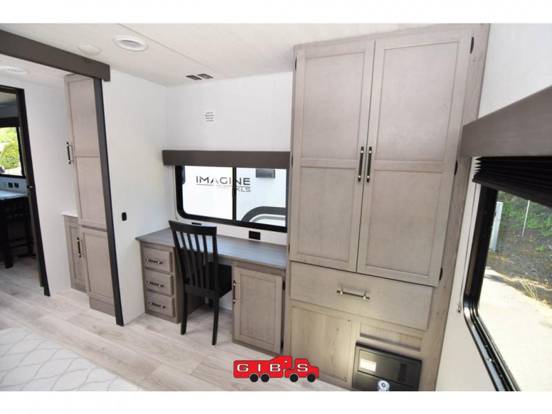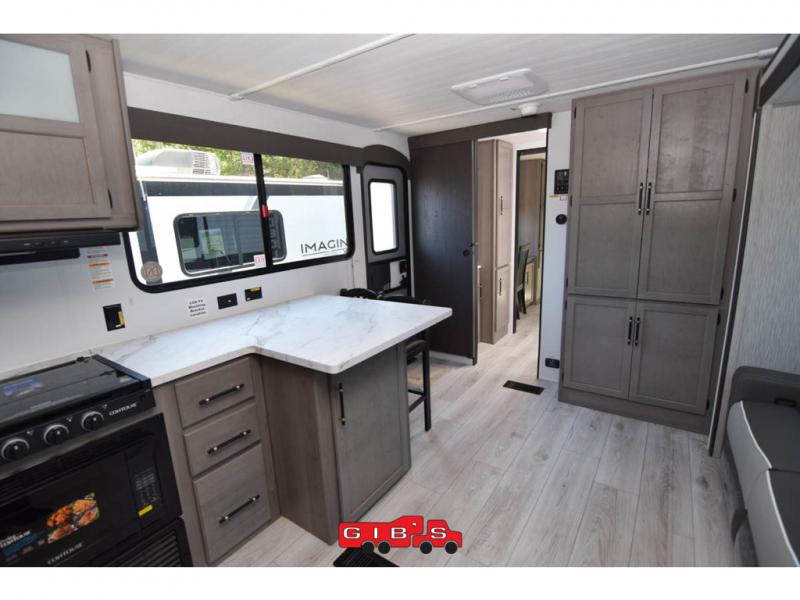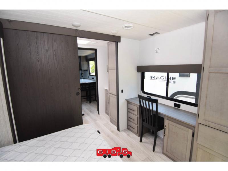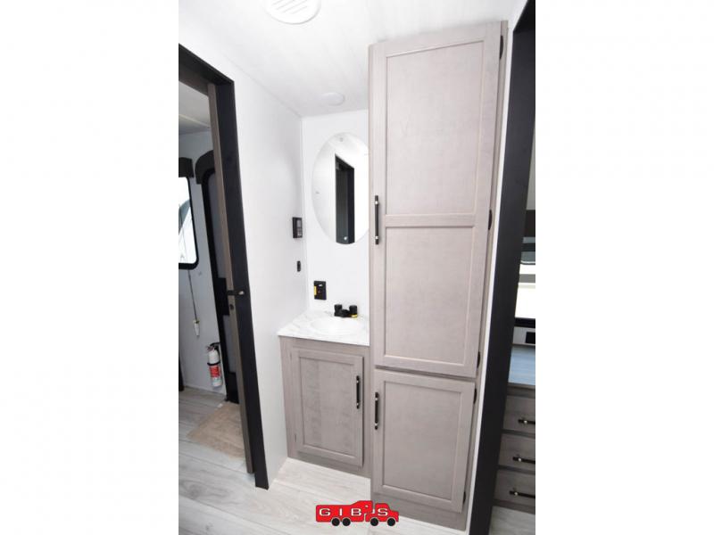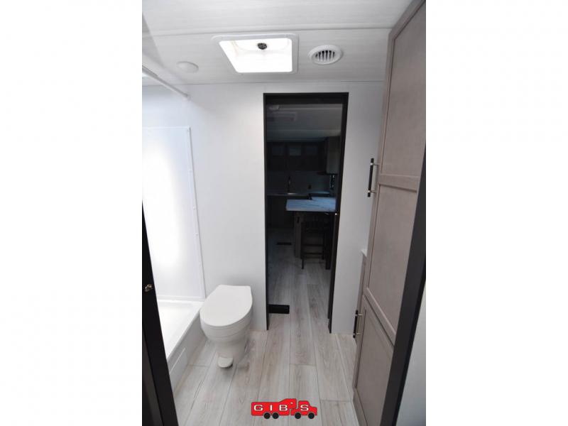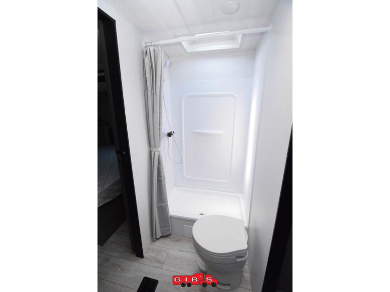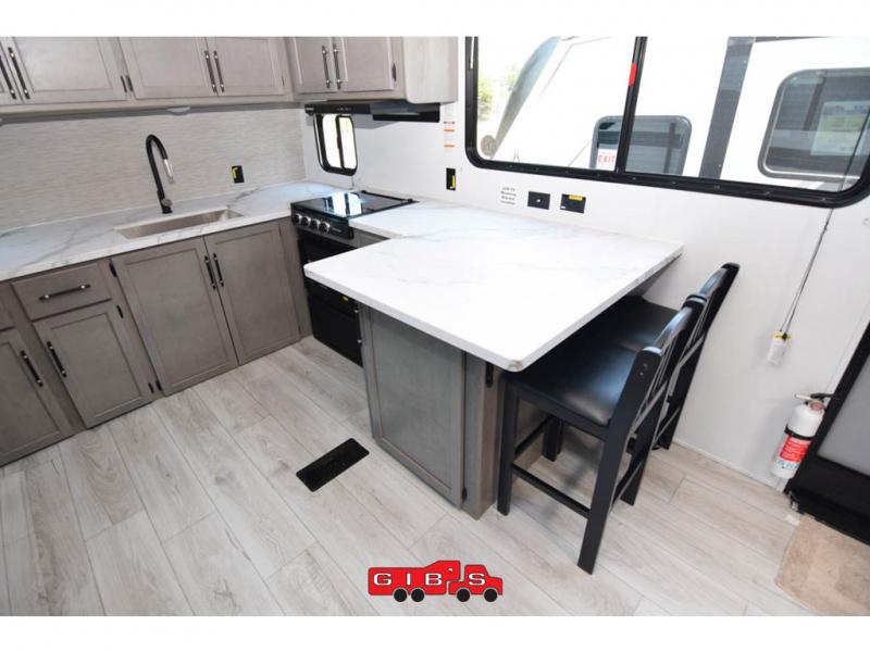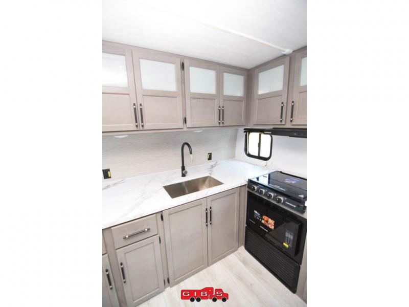 This dual entry, front kitchen travel trailer will be perfect for your crew of seven to eight! There is a rear private bedroom with its own exterior entry door and a walk-around queen bed for added convenience. The little ones will love the hidden bunk beds, which are close by the walk-through bath for easy nighttime use, and any other guests can sleep on the sofa or booth dinette within the large slide out. This model includes ample storage space, including an exterior pass-through compartment, a spacious kitchen pantry, a dual linen closet in the bath, and even convenient shoe storage by the main entry door!