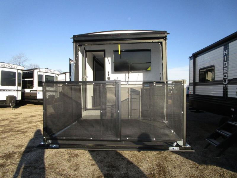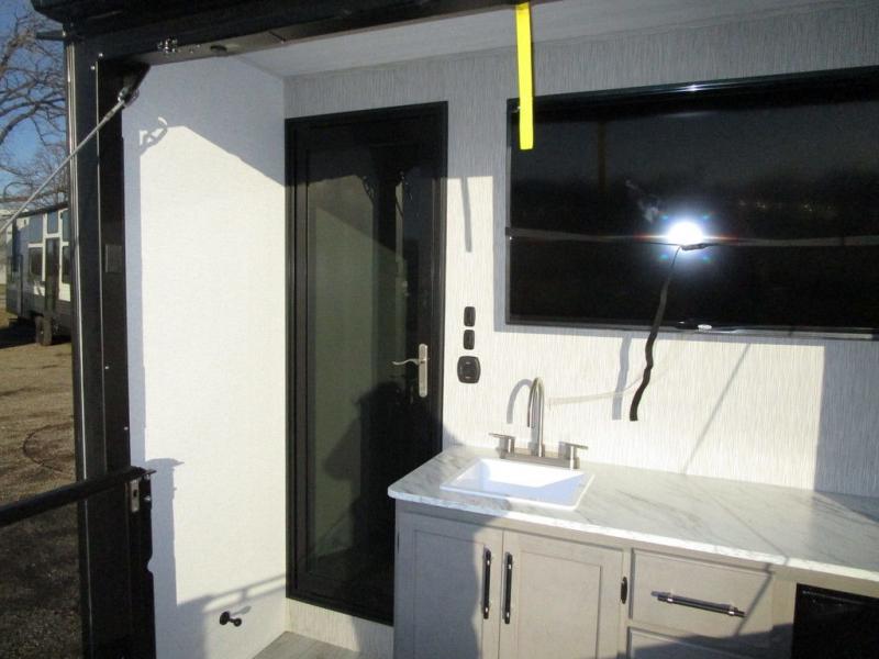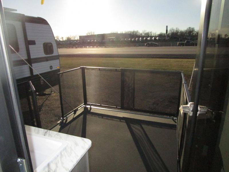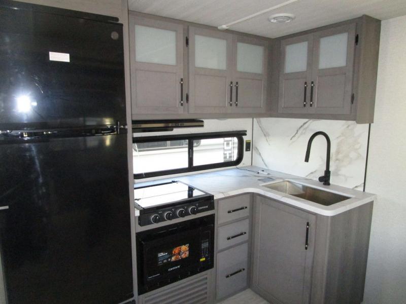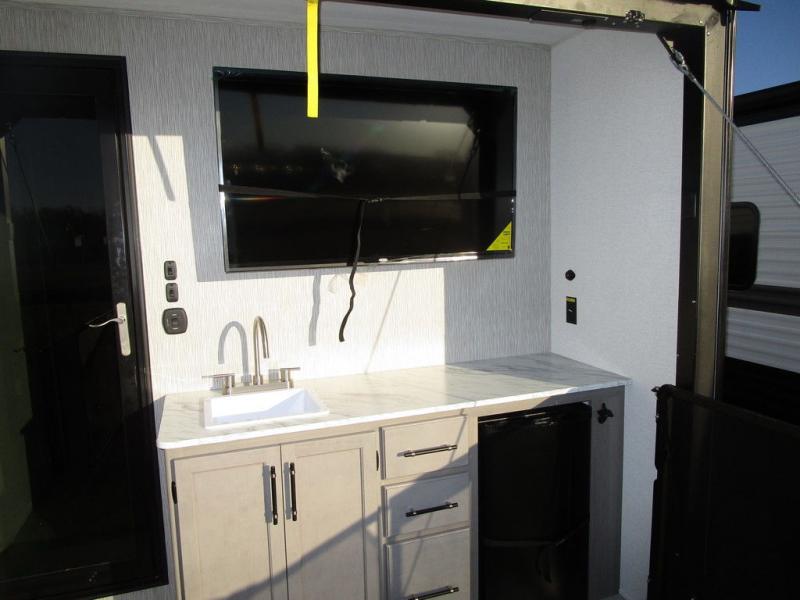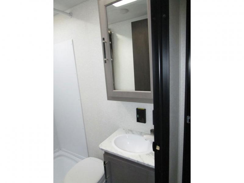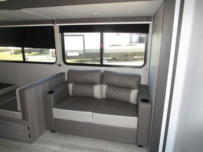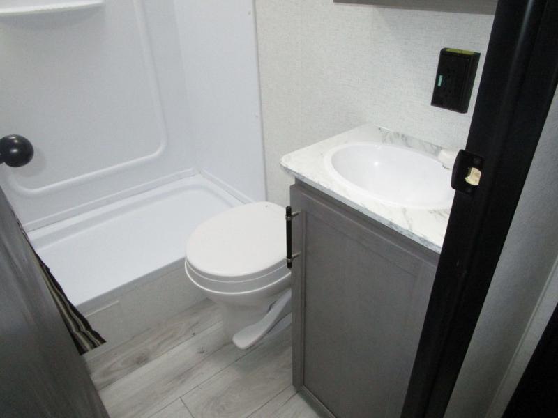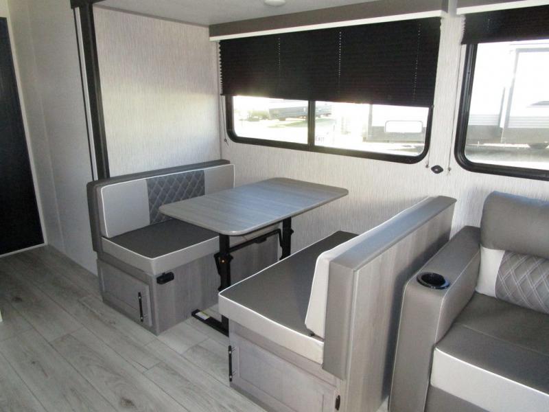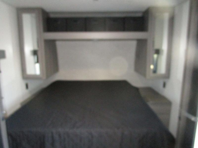 You'll love spending time at the campground in this cozy travel trailer for four to five. The rear fold down entertainment patio area includes a countertop with a sink that will allow you to wash your hands before making sandwiches for lunch plus a mini refrigerator to keep drinks cold. You can eat on the patio, under the 21' side awning, or at the booth dinette inside. There is also a sofa here and a large slide out to provide ample space to move about. A full bath onboard means you won't have to use the camp's facilities in the middle of the night, and the front queen bed is sure to bring a great night's rest. There are also dual bedside closets and nightstands to keep your things organized, and the exterior pass-thru storage will be perfect for larger camp gear!