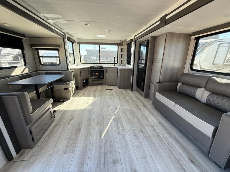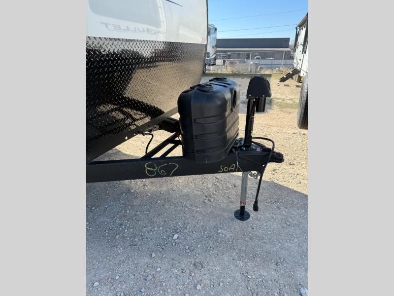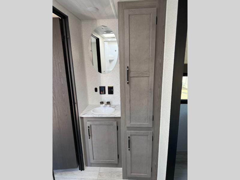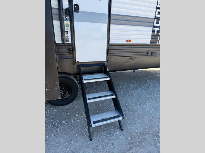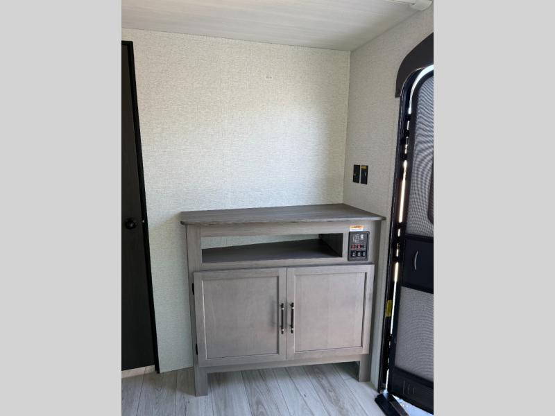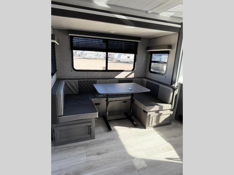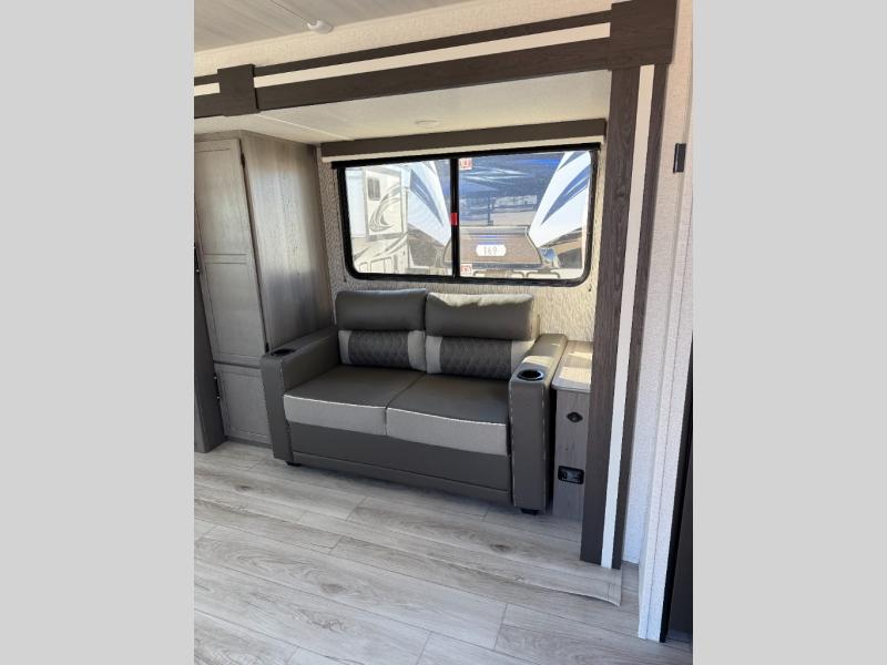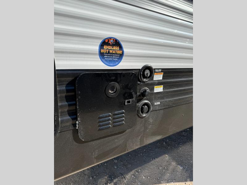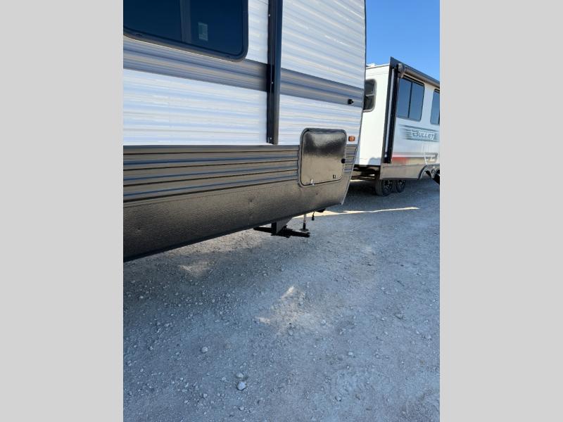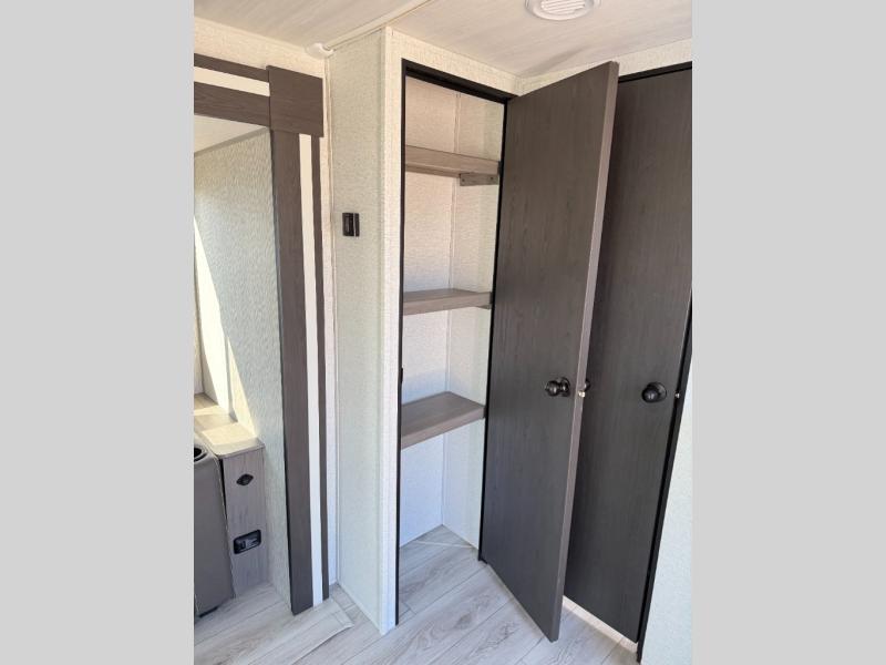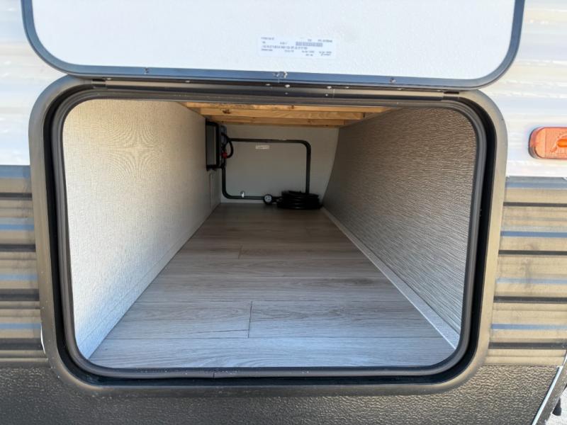 If extra space is what you're wanting, extra space is what you'll get with this travel trailer! There are dual opposing slides in the middle living area, a rear kitchen with tons of counter space, and a walk-through bath for easy access. Whether you're dining around the U-shaped dinette, relaxing on the sofa across from the entertainment center, or sitting under the 12' power awning, you're sure to have a great time. The front master bedroom will have you feeling right at home with its walk-around queen bed, dual closets, and laundry chute that goes straight to the pass-through storage!