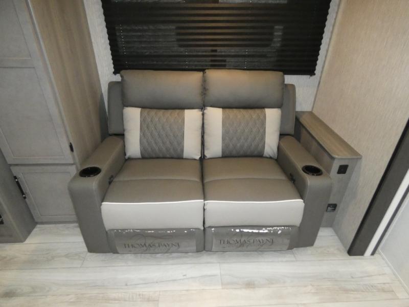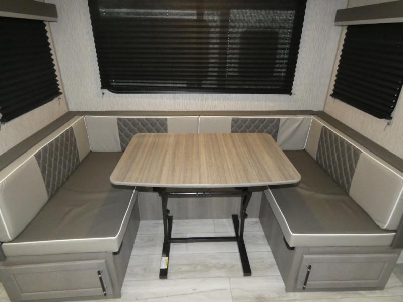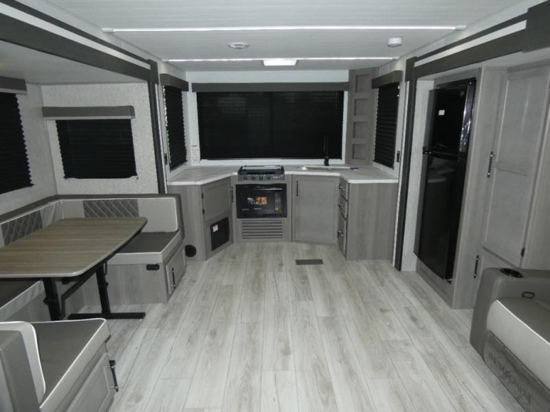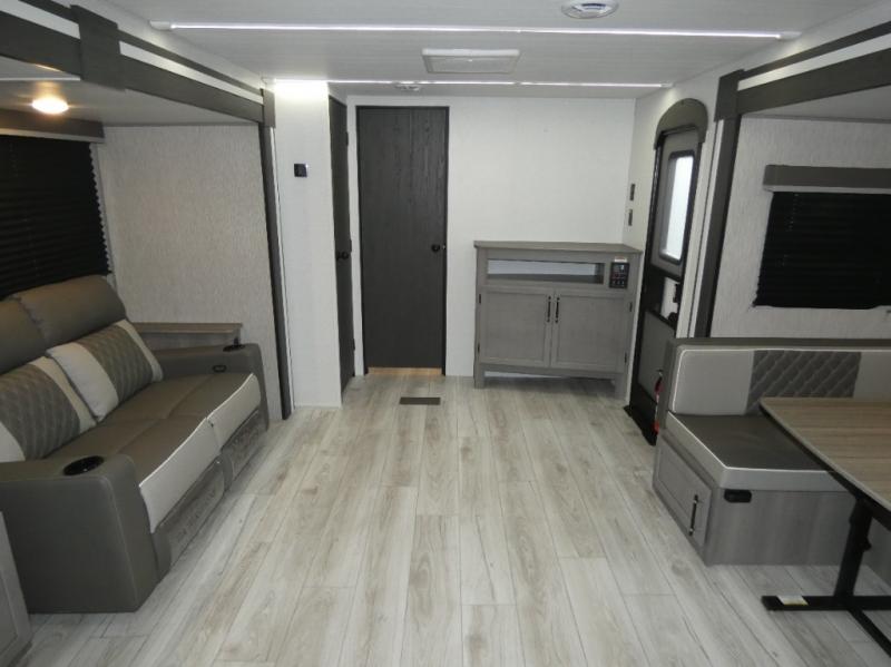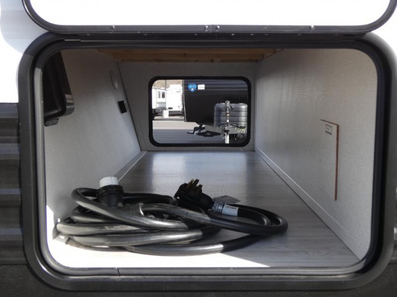 If extra space is what you're wanting, extra space is what you'll get with this travel trailer! There are dual opposing slides in the middle living area, a rear kitchen with tons of counter space, and a walk-through bath for easy access. Whether you're dining around the U-shaped dinette, relaxing on the sofa across from the entertainment center, or sitting under the 12' power awning, you're sure to have a great time. The front master bedroom will have you feeling right at home with its walk-around queen bed, dual closets, and laundry chute that goes straight to the pass-through storage!