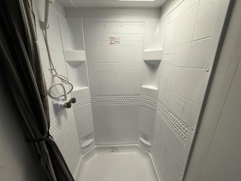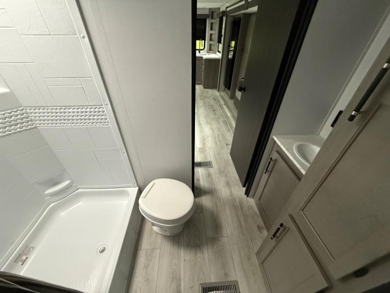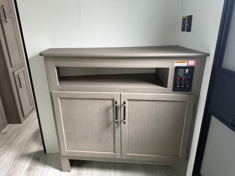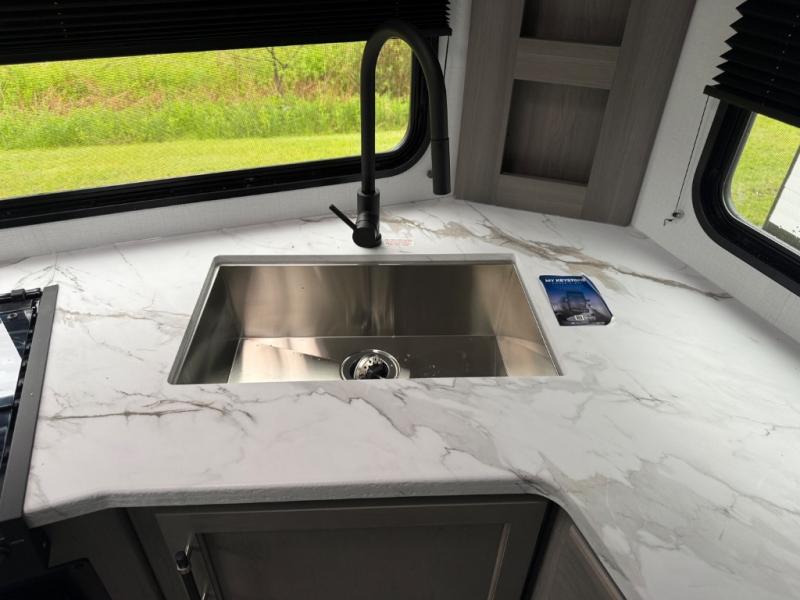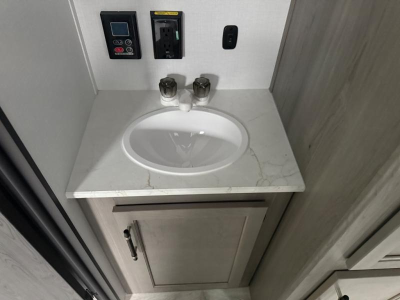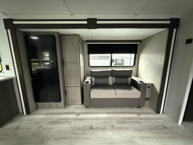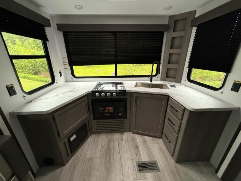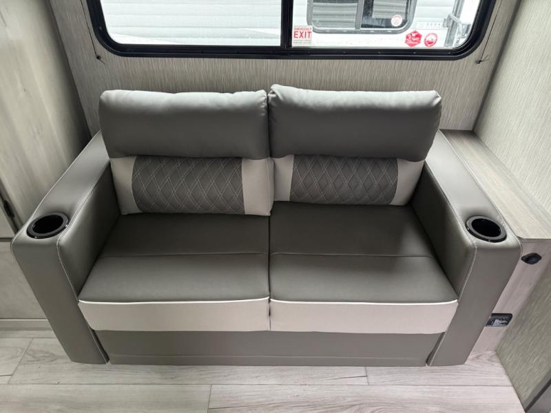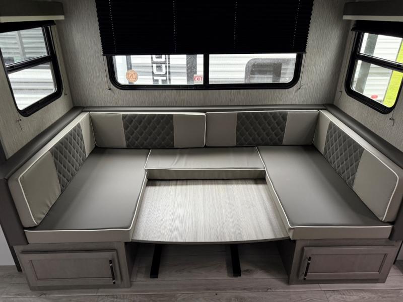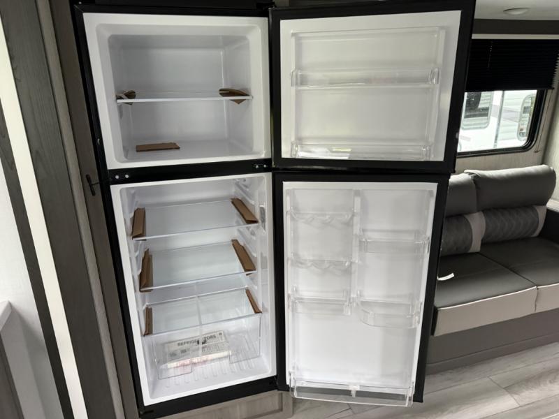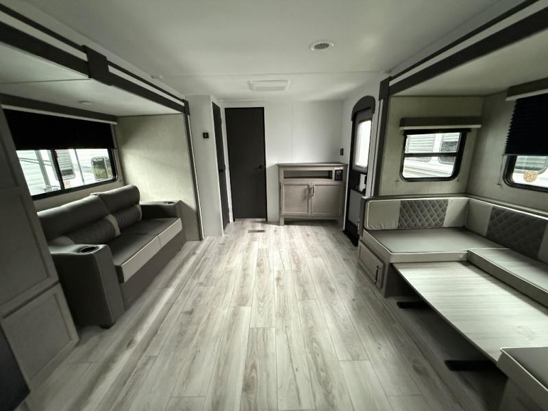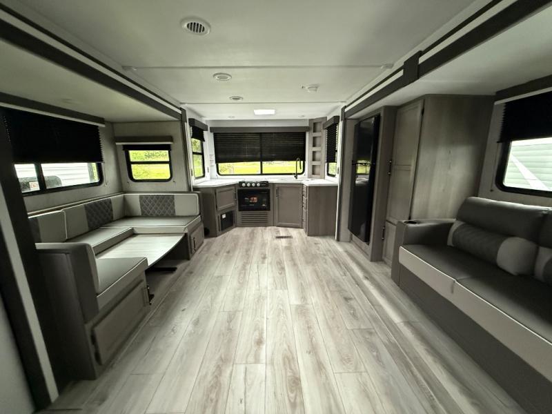 If extra space is what you're wanting, extra space is what you'll get with this travel trailer! There are dual opposing slides in the middle living area, a rear kitchen with tons of counter space, and a walk-through bath for easy access. Whether you're dining around the U-shaped dinette, relaxing on the sofa across from the entertainment center, or sitting under the 12' power awning, you're sure to have a great time. The front master bedroom will have you feeling right at home with its walk-around queen bed, dual closets, and laundry chute that goes straight to the pass-through storage!
