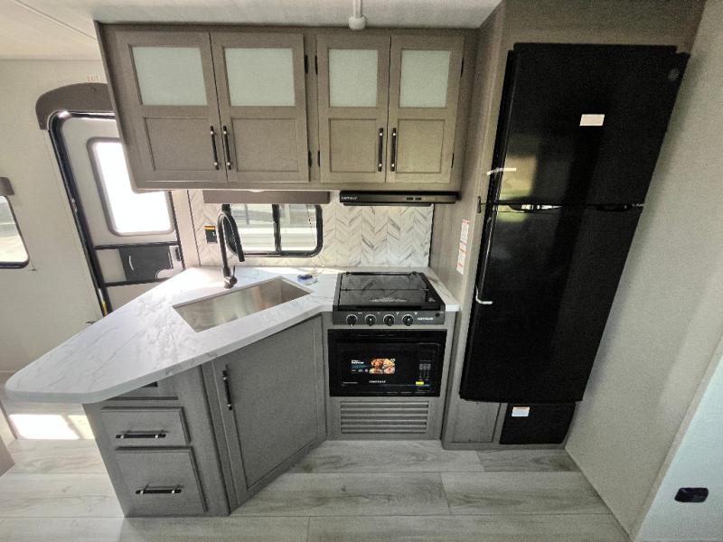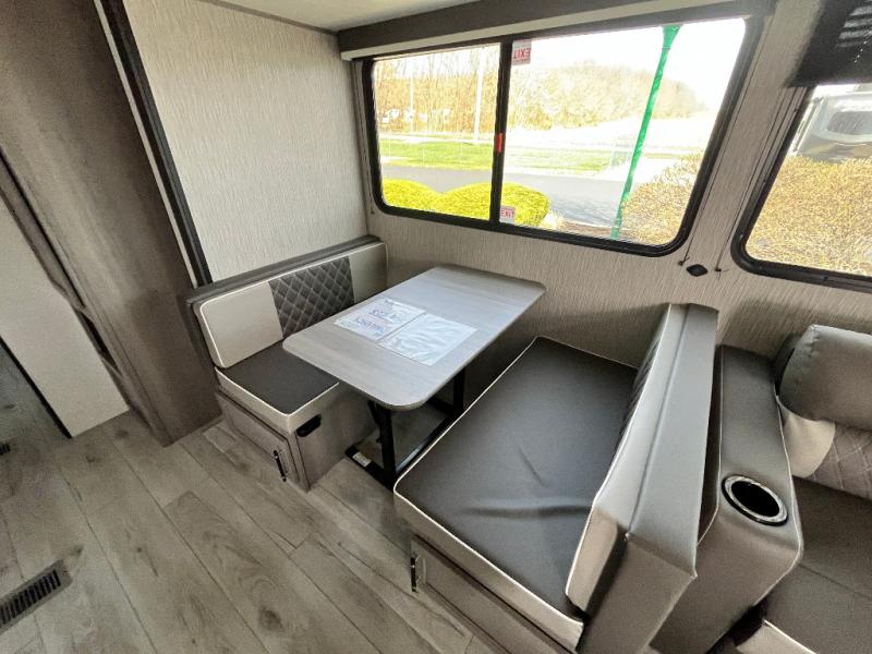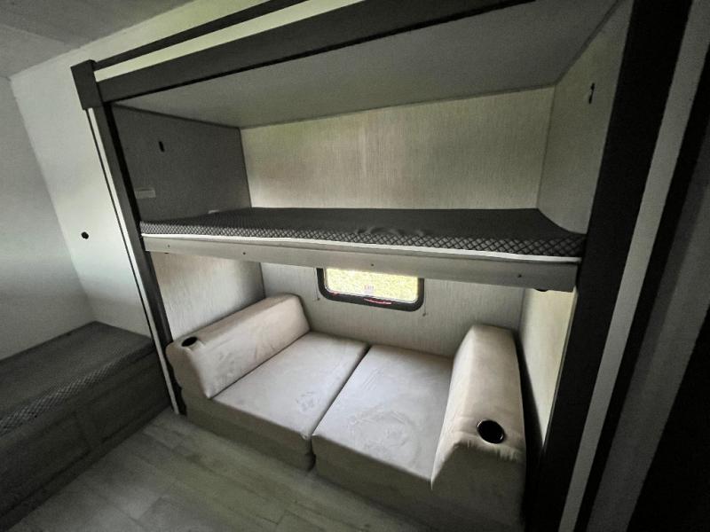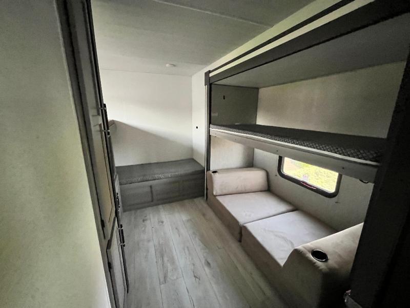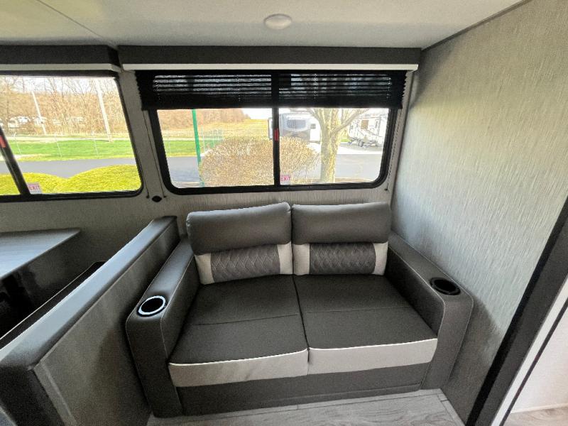 You will be quite impressed by the large private bunkhouse on this Hideout travel trailer! This bunkhouse has a slide out for more space, two bunks, a flip-up bunk, plus a toy chest to keep everything tidy. Now your kids can play all day and store their toys when it's time for bed. The full bathroom is located right next to the bunkhouse for easy access at night, and the bathroom also contains the second exterior entry door. The main living area is full of great features as well with a large slide, a standard sofa, and a booth dinette. And you can choose the optional tri-fold sofa or optional theater seating in place of the standard sofa, depending on your needs.