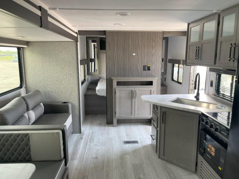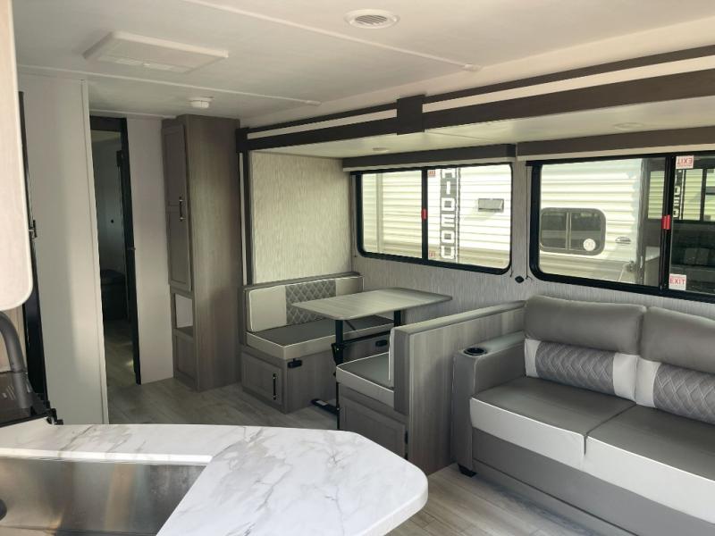 You will be quite impressed by the large private bunkhouse on this Hideout travel trailer! This bunkhouse has a slide out for more space, two bunks, a flip-up bunk, plus a toy chest to keep everything tidy. Now your kids can play all day and store their toys when it's time for bed. The full bathroom is located right next to the bunkhouse for easy access at night, and the bathroom also contains the second exterior entry door. The main living area is full of great features as well with a large slide, a standard sofa, and a booth dinette. And you can choose the optional tri-fold sofa or optional theater seating in place of the standard sofa, depending on your needs.