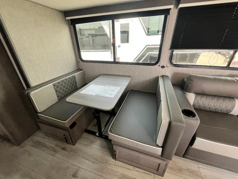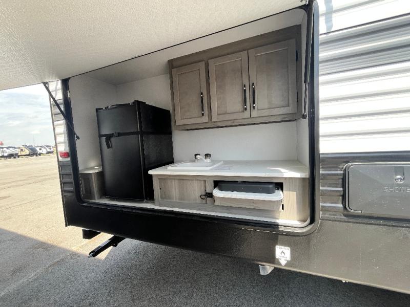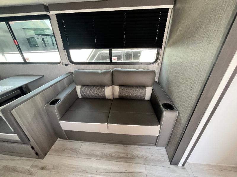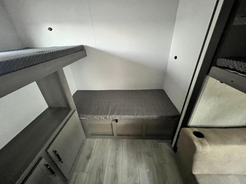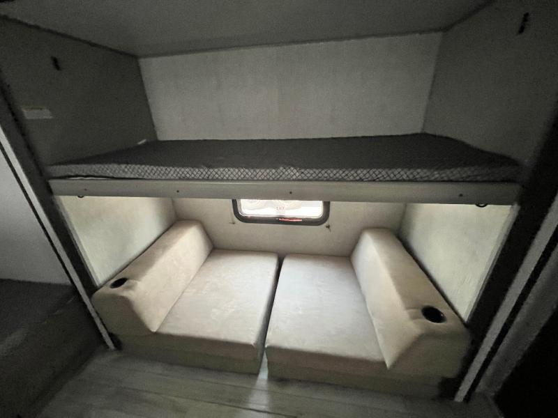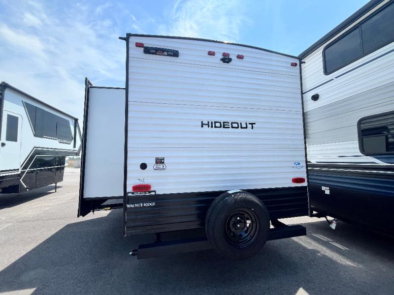 You will be quite impressed by the large private bunkhouse on this Hideout travel trailer! This bunkhouse has a slide out for more space, two bunks, a flip-up bunk, plus a toy chest to keep everything tidy. Now your kids can play all day and store their toys when it's time for bed. The full bathroom is located right next to the bunkhouse for easy access at night, and the bathroom also contains the second exterior entry door. The main living area is full of great features as well with a large slide, a standard sofa, and a booth dinette. And you can choose the optional tri-fold sofa or optional theater seating in place of the standard sofa, depending on your needs.