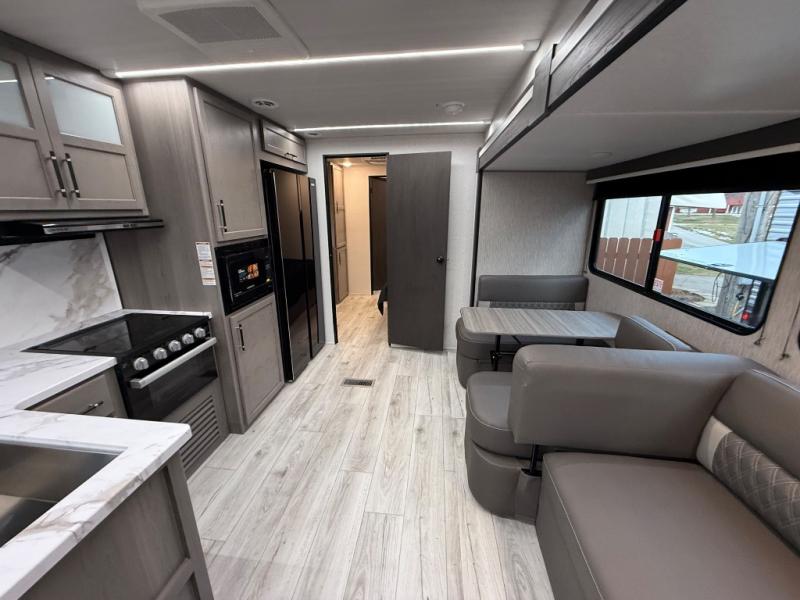 Extended stays are easy in this spacious destination trailer. Since there are two private bedrooms and two full baths, you can camp with family and friends, plus there are triple slides for more space! The front bedroom includes a king bed slide out, a closet, dresser, plus washer and dryer prep if you choose to add those appliances. The master bedroom towards the back features a queen bed slide, dual closets, and a full rear bath, and both bathrooms includes a shower with a seat for more comfort! Everyone can meet in the combined kitchen and living area to relax on the tri-fold sofa, play a game at the flex lounge, or just enjoy the 50" TV and fireplace. And the full kitchen is sure to impress with its three burner gas oven, air fryer microwave, and 16 cu. ft. refrigerator!