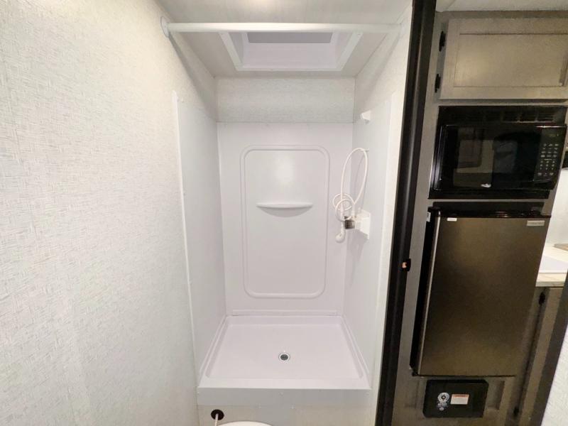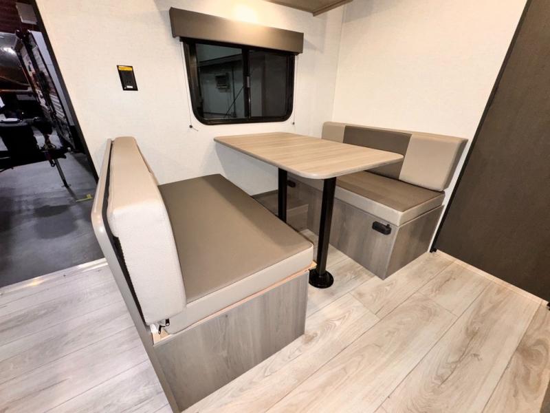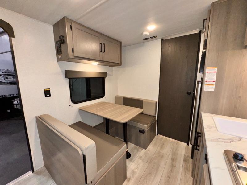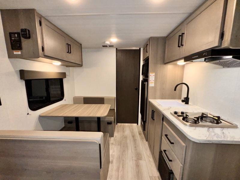 It's time to enjoy the great outdoors with family and friends at the campgrounds you like to meet everyone at! This trailer will allow three to four to camp comfortability with amenities such as a two burner cooktop, a 3.3 cu. ft. refrigerator, and a spacious rear full bathroom. The booth dinette offers a place to dine, read a book and even house an overnight guest. This model also includes a walk-around queen bed that will make your space feel a little more like home!