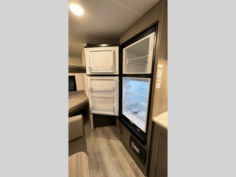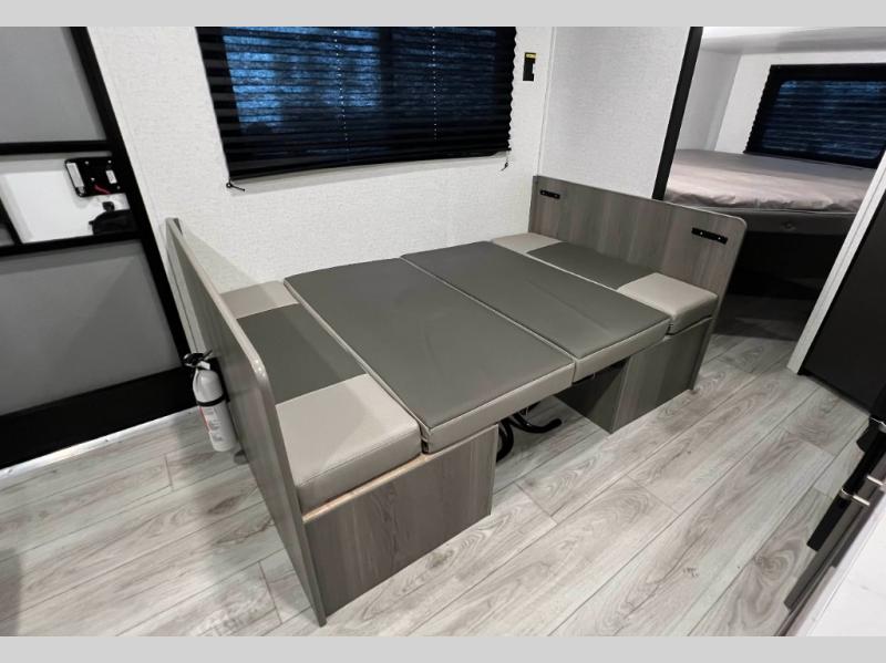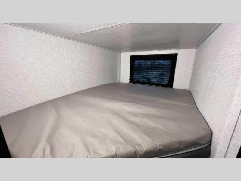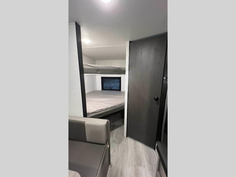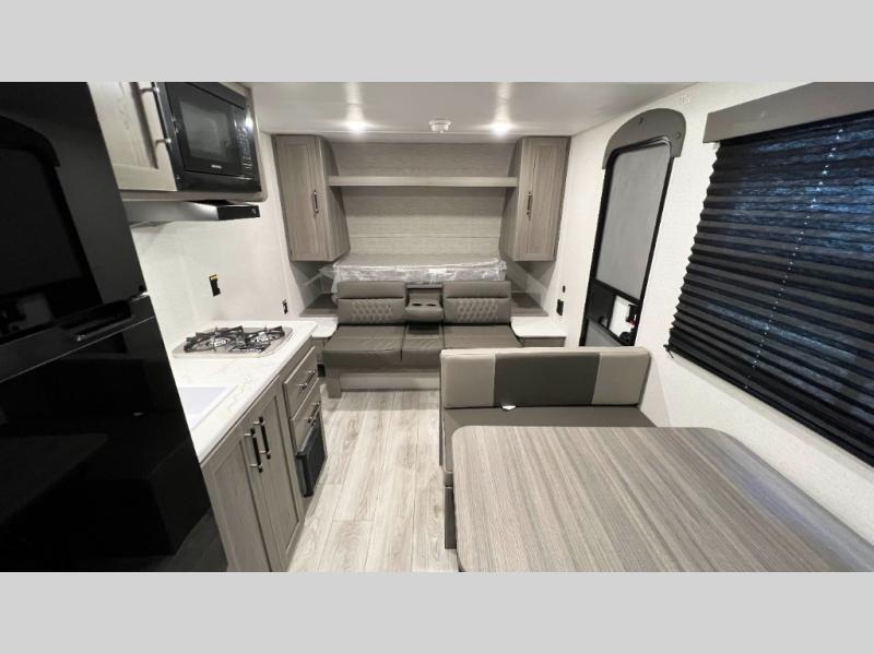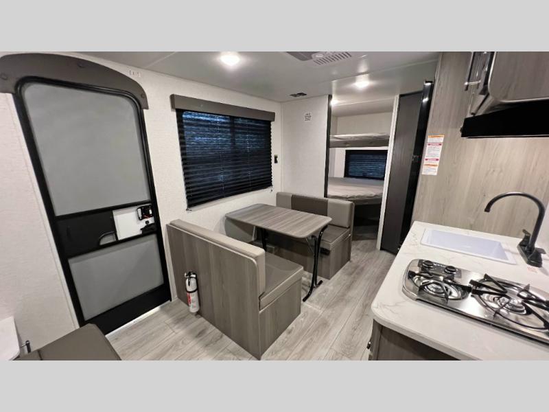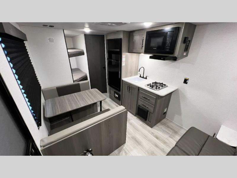 You'll love how versatile this travel trailer is since you can sleep on the Murphy bed at night and enjoy the fold-down sofa during the day! There are dual wardrobes and nightstands on either side of the bed for your things, and larger camp gear can go outside in the pass-thru storage. A full kitchen with a two burner cooktop and 7.7 cu. ft. 12V refrigerator will let the chef whip up their best meals, and the booth dinette will provide a place to dine at. This model also includes double-size bunks and and a full bath right next to the bunks for easy nighttime use!