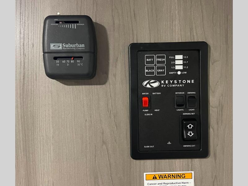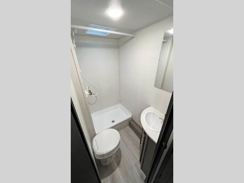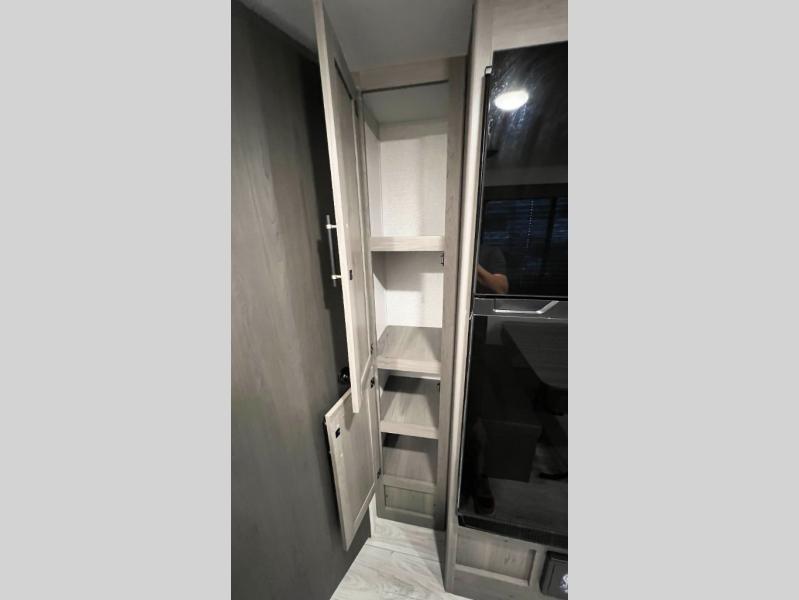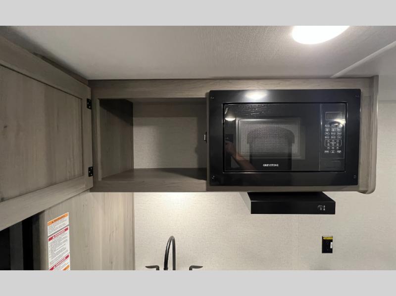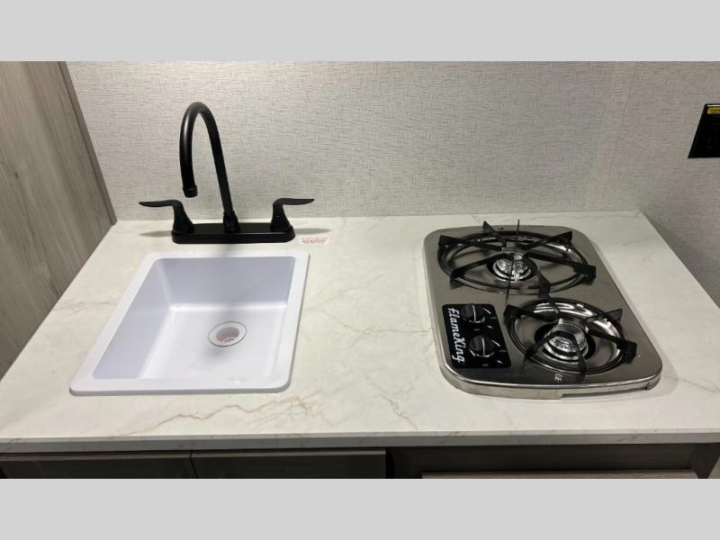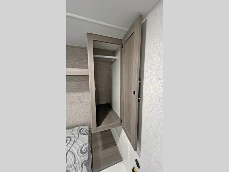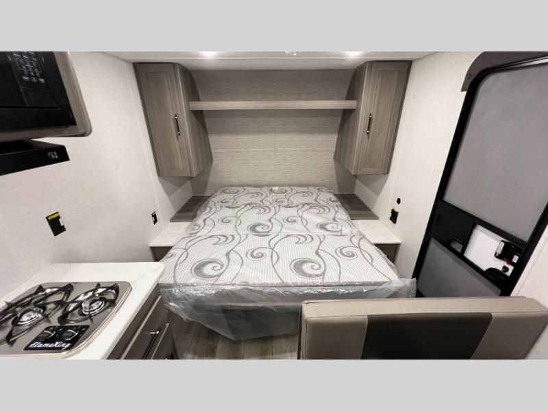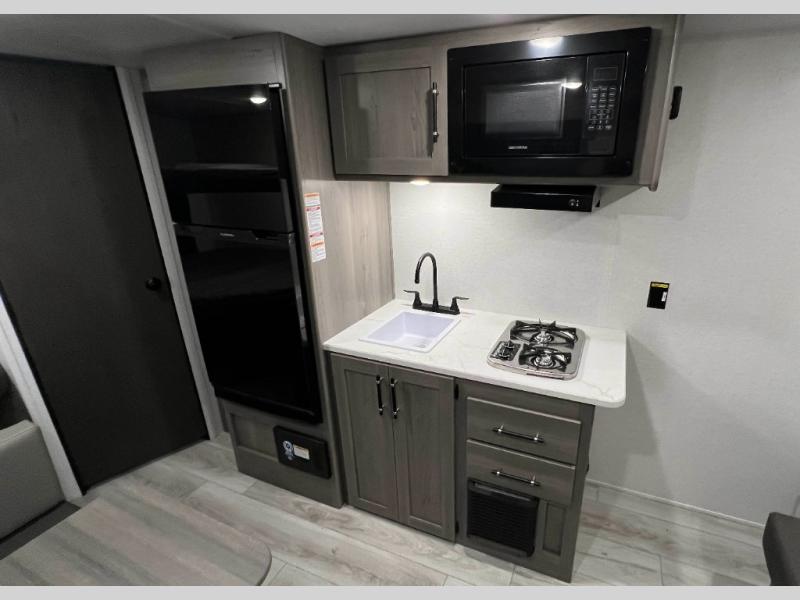 You'll love how versatile this travel trailer is since you can sleep on the Murphy bed at night and enjoy the fold-down sofa during the day! There are dual wardrobes and nightstands on either side of the bed for your things, and larger camp gear can go outside in the pass-thru storage. A full kitchen with a two burner cooktop and 7.7 cu. ft. 12V refrigerator will let the chef whip up their best meals, and the booth dinette will provide a place to dine at. This model also includes double-size bunks and and a full bath right next to the bunks for easy nighttime use!