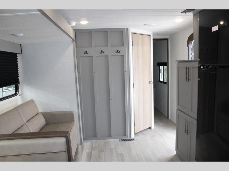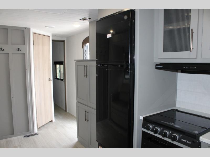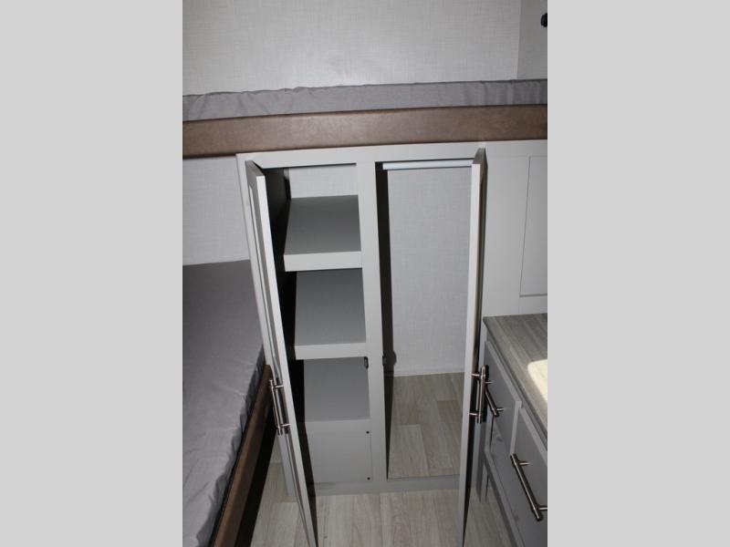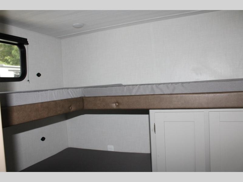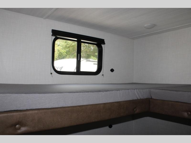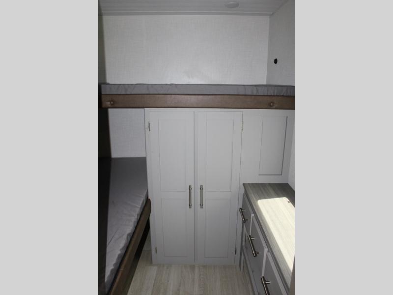 If you enjoy camping with extra friends and family, this travel trailer will be perfect for you! There is a rear bunkhouse with triple bunks, a dresser, plus a closet, making this room perfect for guests. Up front you'll find the private bedroom with a queen bed, dual nightstands and dual closets for your things, and the full bath is close by for convenience. The chef of your group will have a cooktop to prepare meals, ample counter space, plus a pantry for dry goods and snacks. Your crew can play a game at the booth dinette or relax on the sofa while dinner is being made, or they can relax outdoors under the 16' power awning!