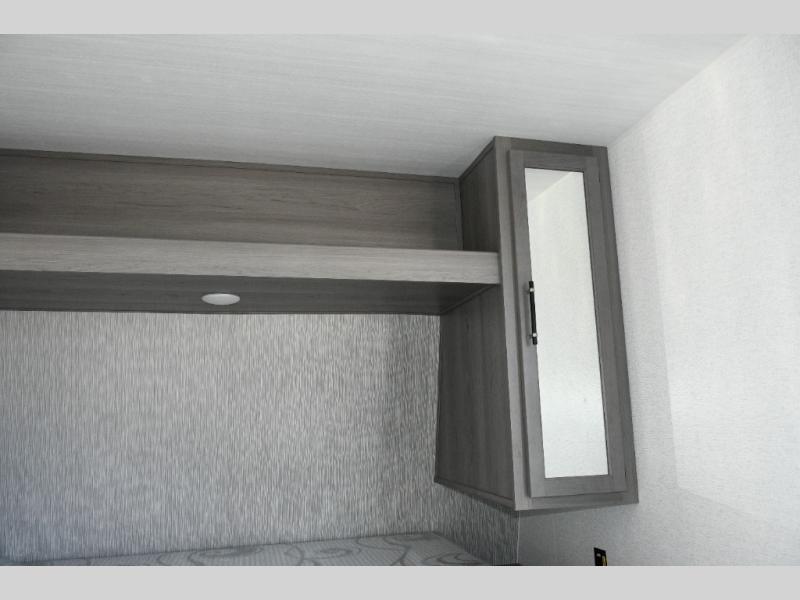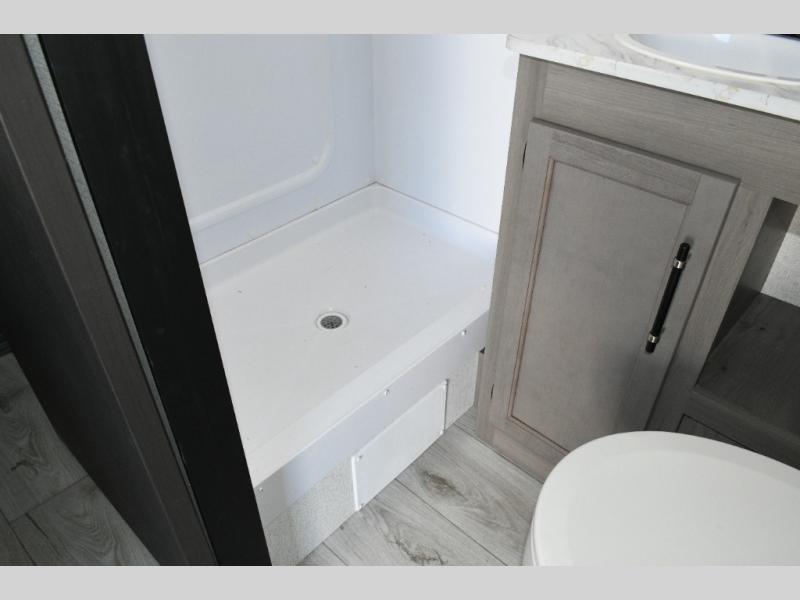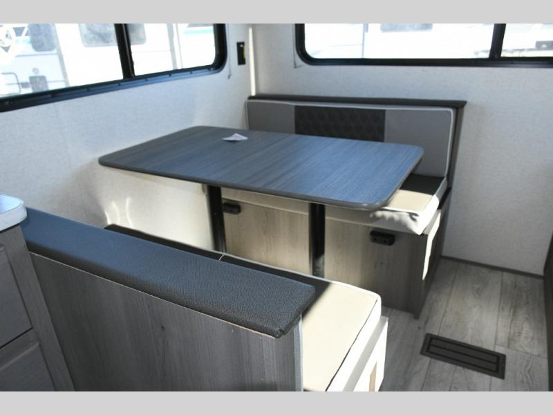 Step inside to find a front private bedroom with a queen bed, under-bed storage, dual nightstands, and dual bedroom closets to keep your gear organized. The full bathroom ensures everyone can freshen up with ease, eliminating the need to rely on campground facilities. In the back, the booth dinette provides a spot for meals, games, or planning your next outdoor adventure, while the sofa offers a cozy spot to relax at the end of the day. Both pieces of furniture also double as sleeping space, giving the trailer the flexibility to sleep four comfortably.