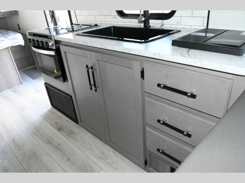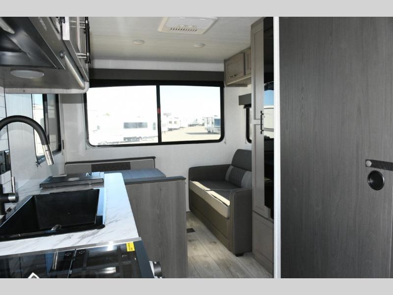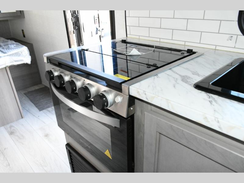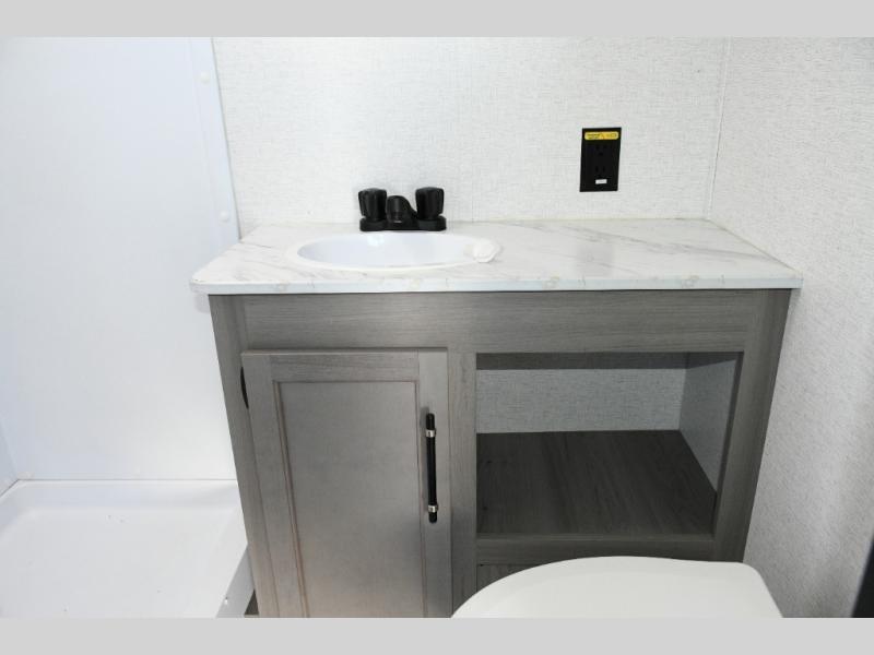 The kitchen area comes ready for daily meal prep with a cooktop, 10 cu. ft. 12V refrigerator, and pantry for all your essentials. Whether you’re fueling up before a hike or making a quick lunch between adventures, this space has what you need to cook in comfort.