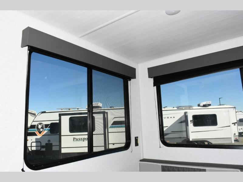 The Hideout Sport Double Axle series is designed for durability and ease of use. Each unit is built with a sturdy aluminum exterior, tinted safety glass windows, a walkable roof, and an I-beam frame for added strength. Power tongue jacks and heavy-duty stabilizer jacks make setup simple, and an XL entry assist handle ensures safety and convenience. Inside, stylish décor, blackout night shades, and comfortable living spaces make it feel like home, while the lightweight design ensures easy towing without sacrificing quality.