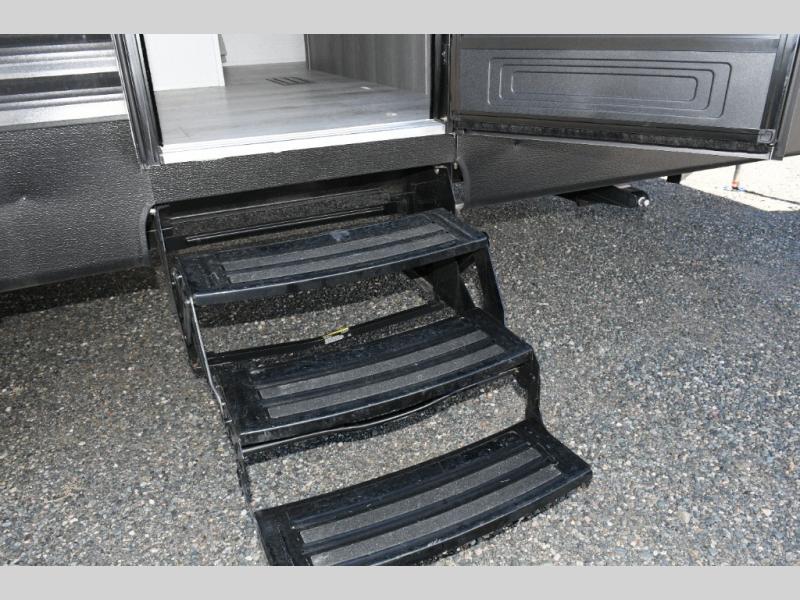 Outside, the power awning creates a shaded retreat for morning coffee, outdoor dining, or simply lounging with friends and family. The pass-through storage adds room for chairs, gear, and all your camping necessities, keeping your trailer organized and your adventures hassle-free.