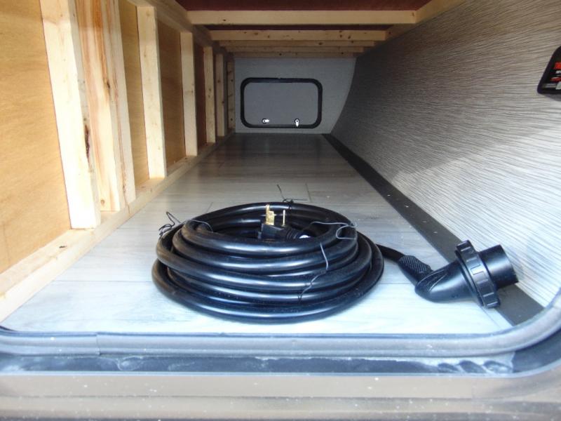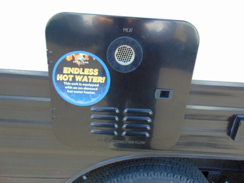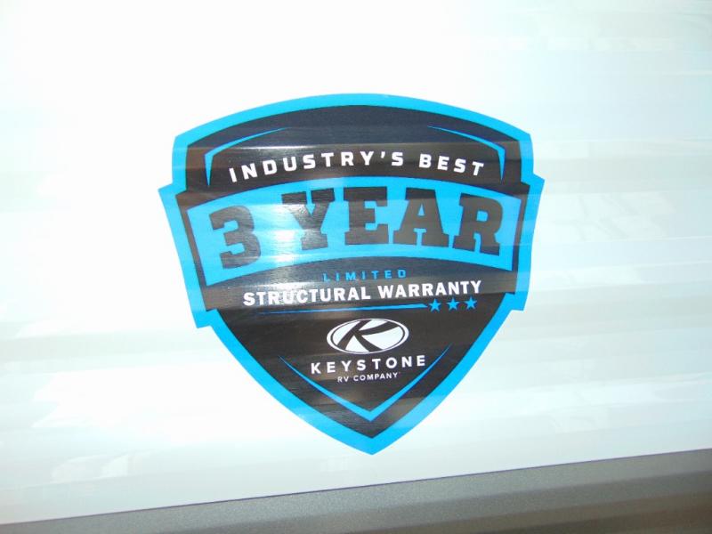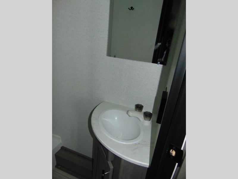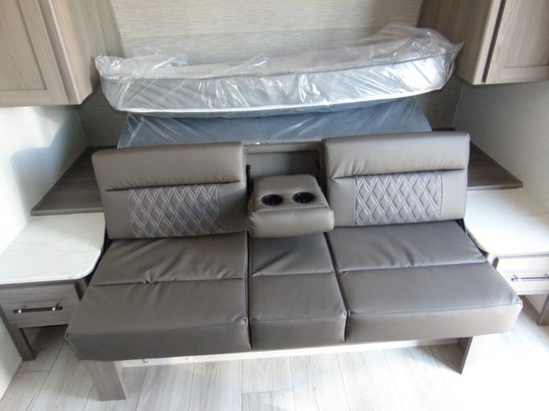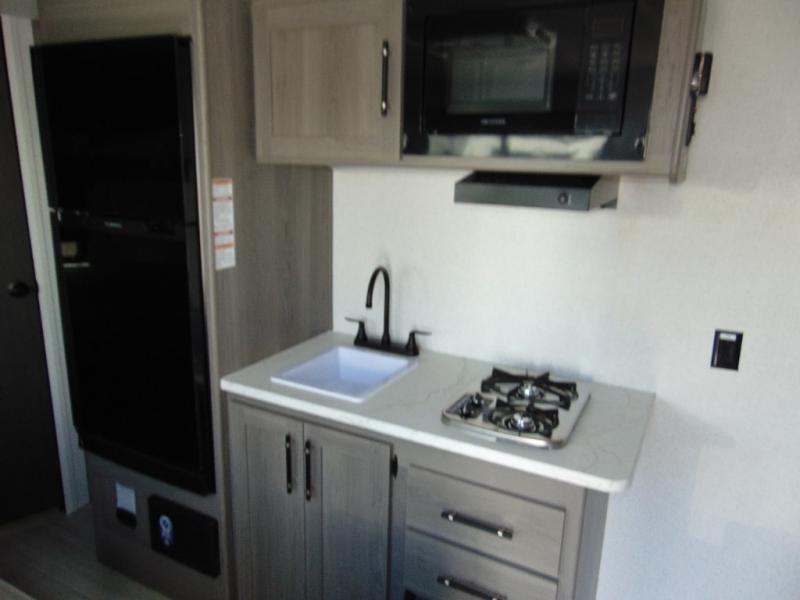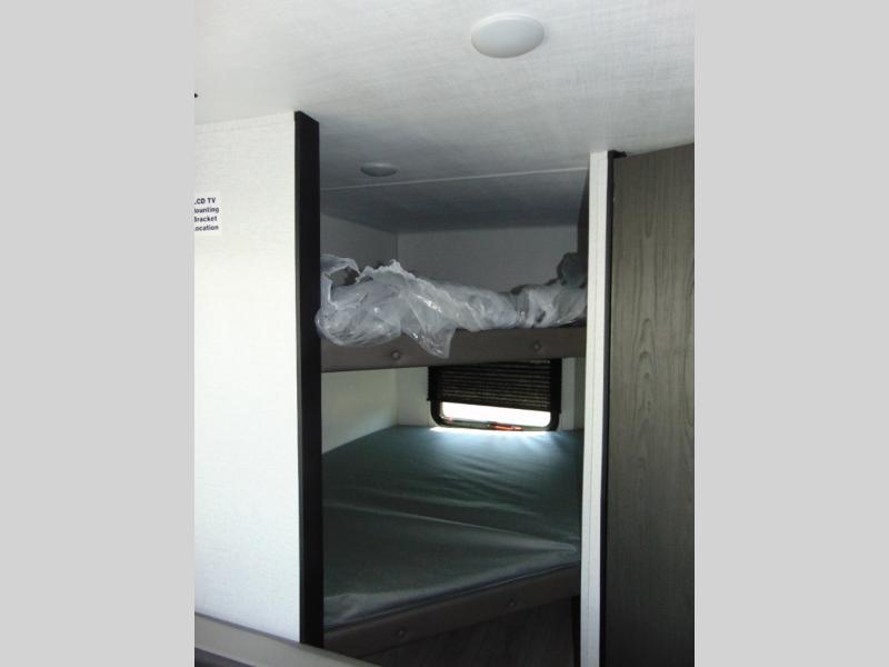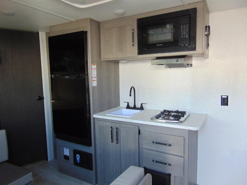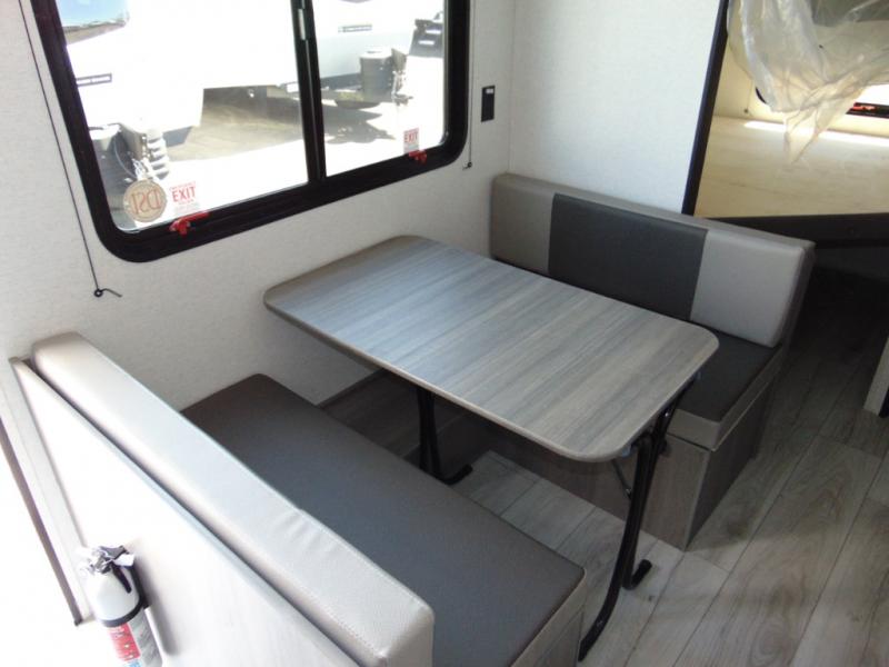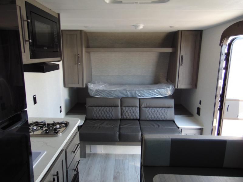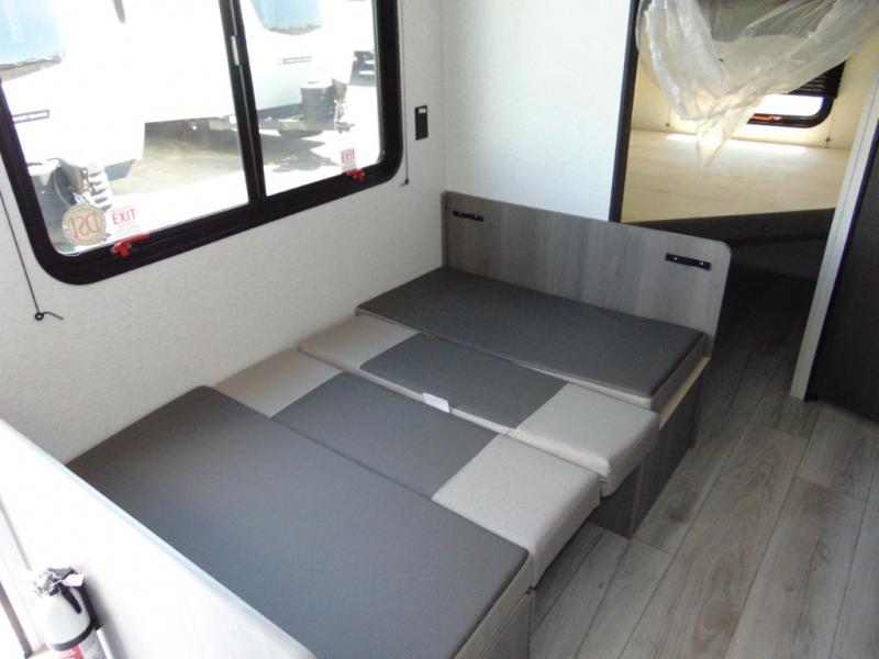 You'll love how versatile this travel trailer is since you can sleep on the Murphy bed at night and enjoy the fold-down sofa during the day! There are dual wardrobes and nightstands on either side of the bed for your things, and larger camp gear can go outside in the pass-thru storage. A full kitchen with a two burner cooktop and 7.7 cu. ft. 12V refrigerator will let the chef whip up their best meals, and the booth dinette will provide a place to dine at. This model also includes double-size bunks and and a full bath right next to the bunks for easy nighttime use!