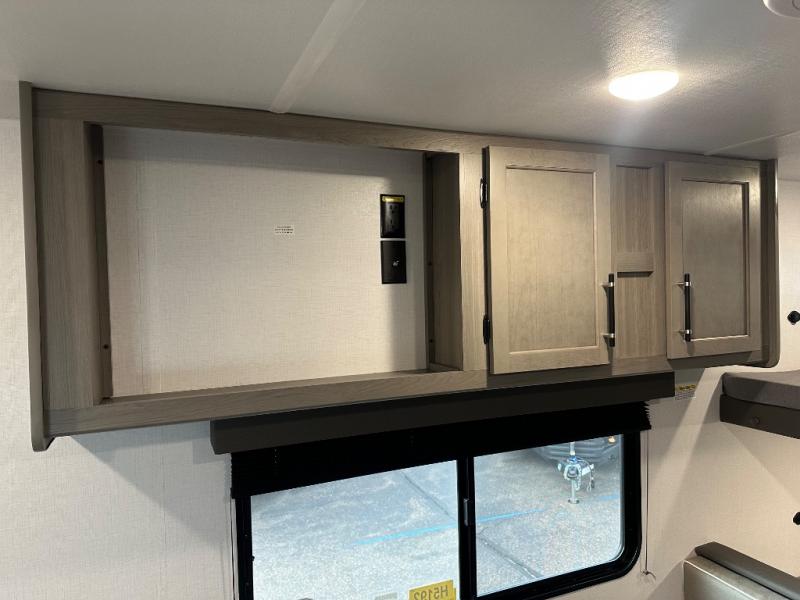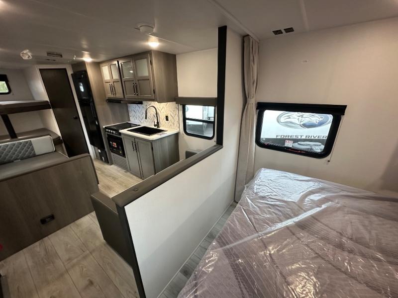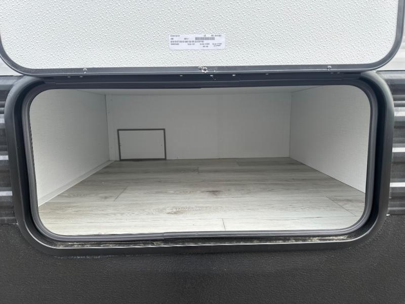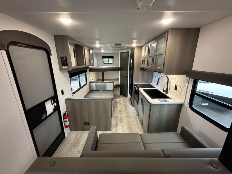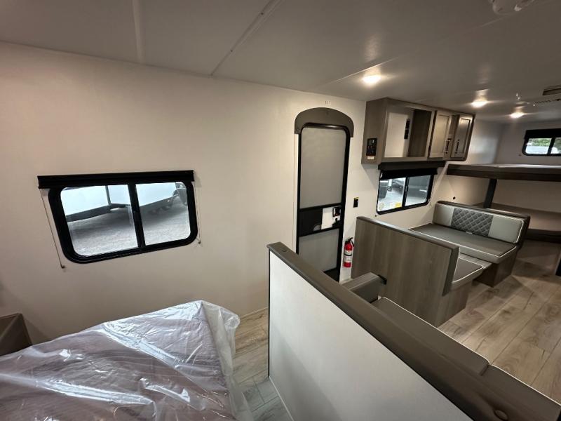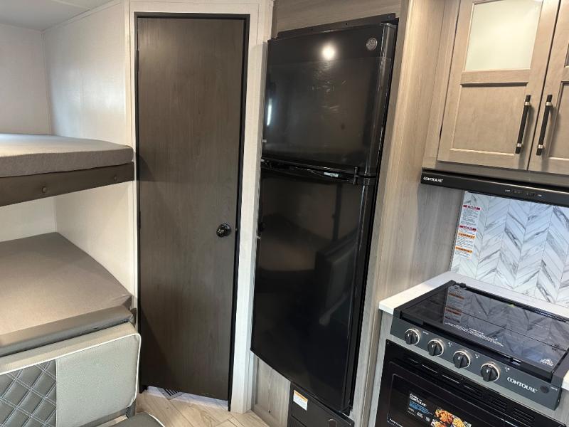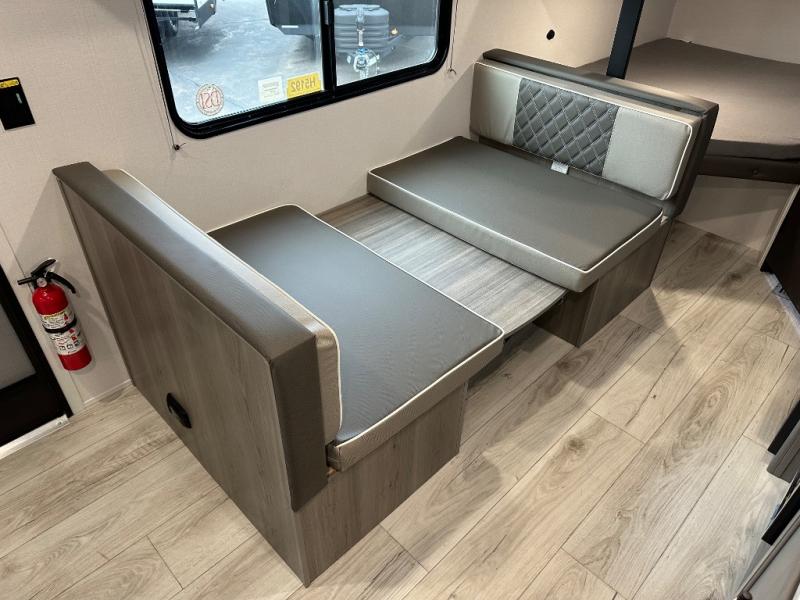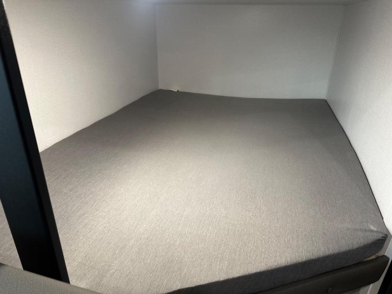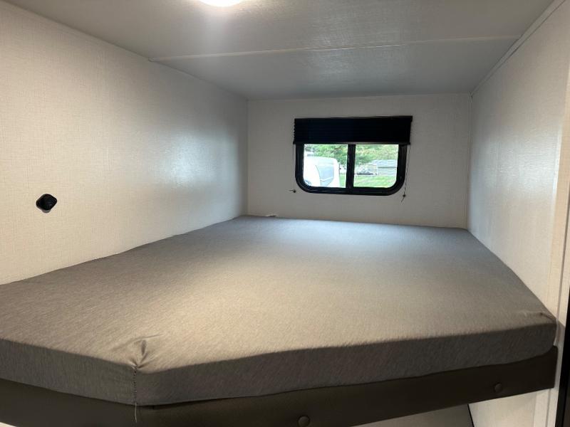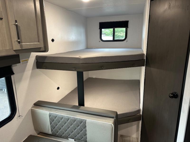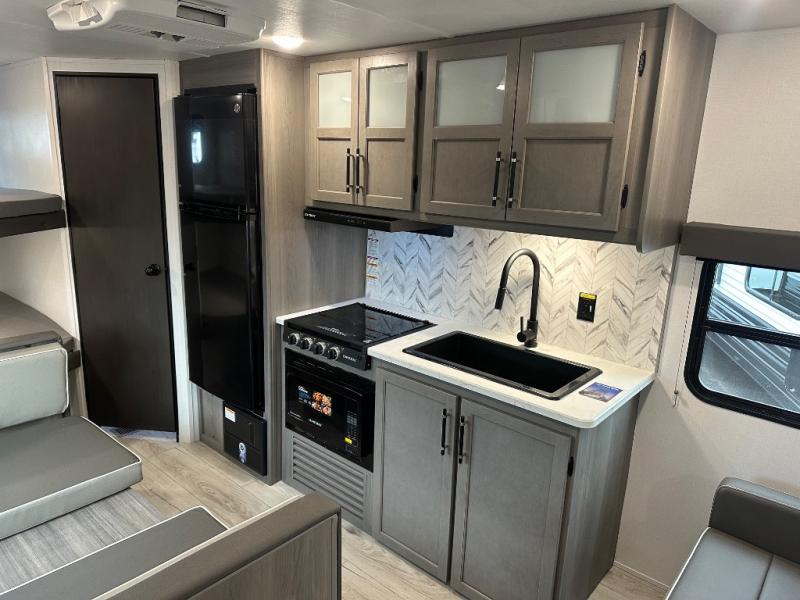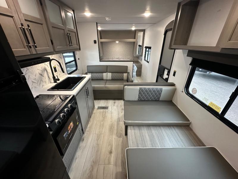 If you're looking for a travel trailer with a little more sleeping space, look no further than this unit! There are double-size bunks with inside and outside storage, a walk-around queen bed in the front bedroom, plus a sofa and booth dinette for even more sleeping space. The kitchen comes with a cooktop to cook meals on, a sink for clean up, and a 10 cu. ft. 12V refrigerator to store the milk and eggs. You will also find TV prep in this model if you enjoy movie nights while at the campground.