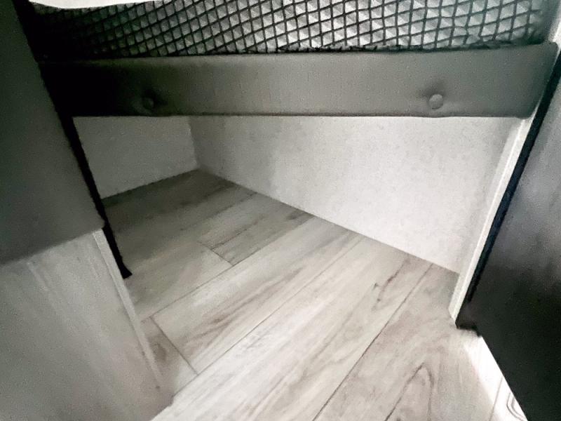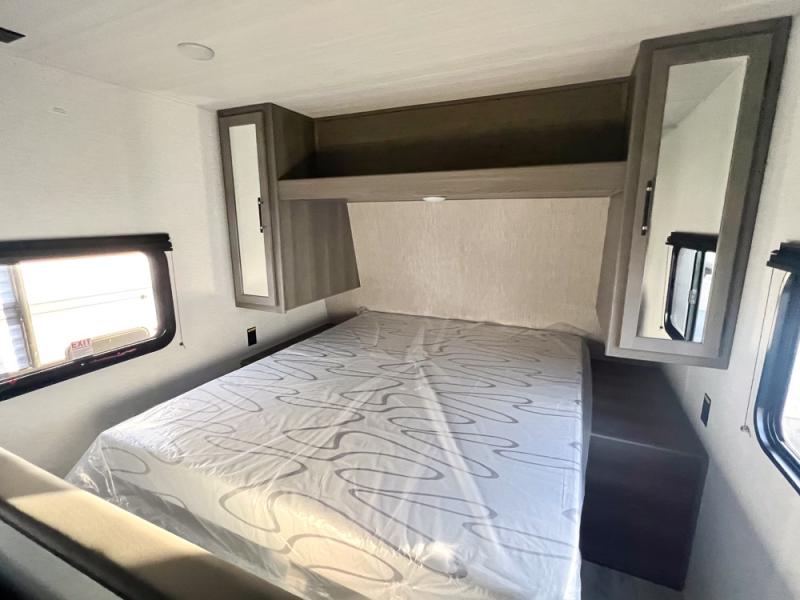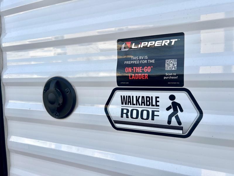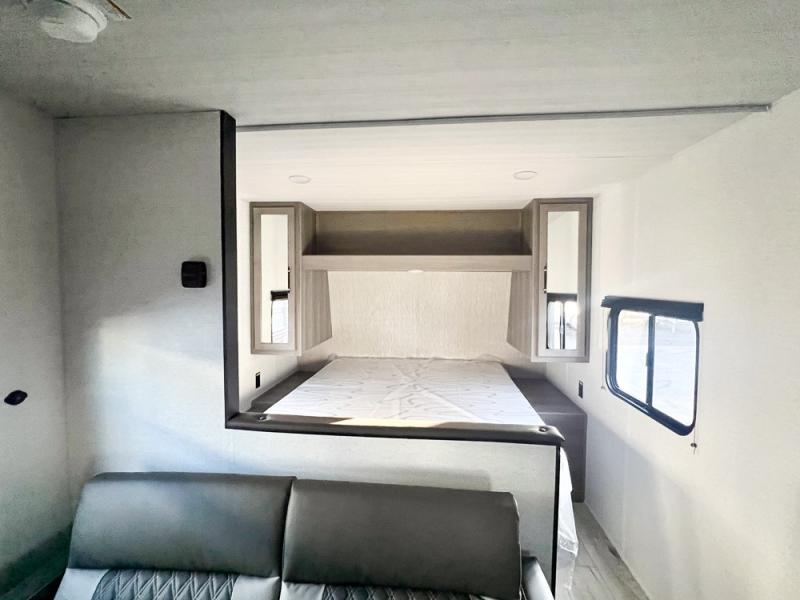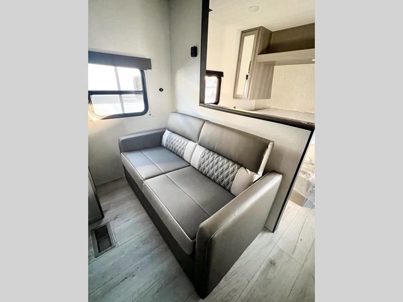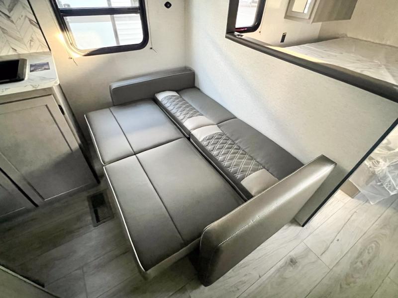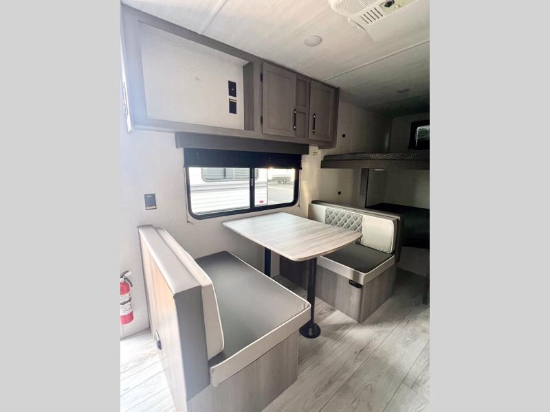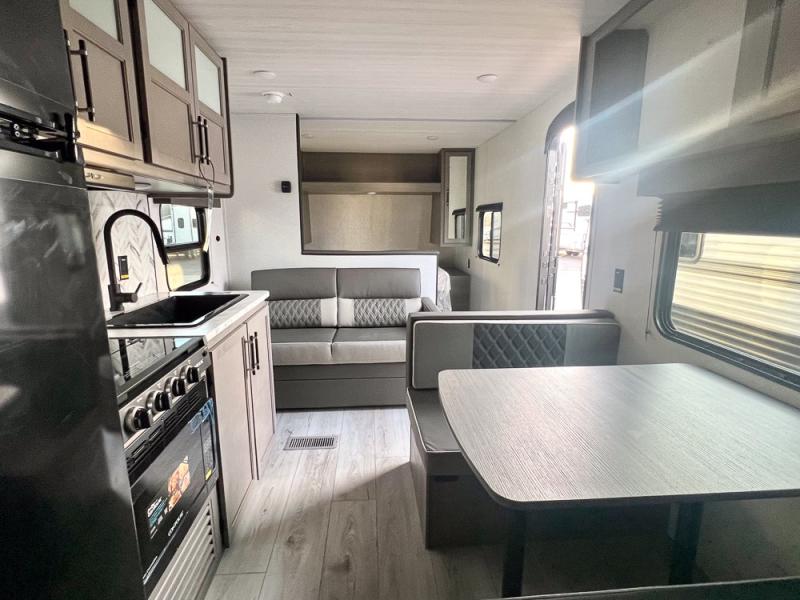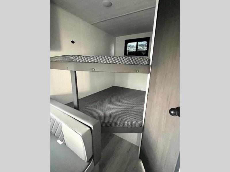 If you're looking for a travel trailer with a little more sleeping space, look no further than this unit! There are double-size bunks with inside and outside storage, a walk-around queen bed in the front bedroom, plus a sofa and booth dinette for even more sleeping space. The kitchen comes with a cooktop to cook meals on, a sink for clean up, and a 10 cu. ft. 12V refrigerator to store the milk and eggs. You will also find TV prep in this model if you enjoy movie nights while at the campground.