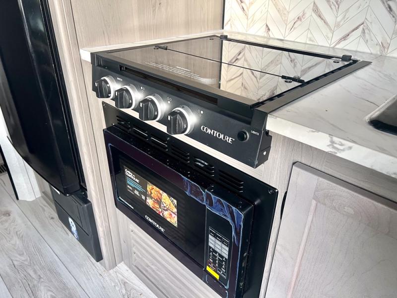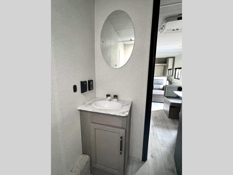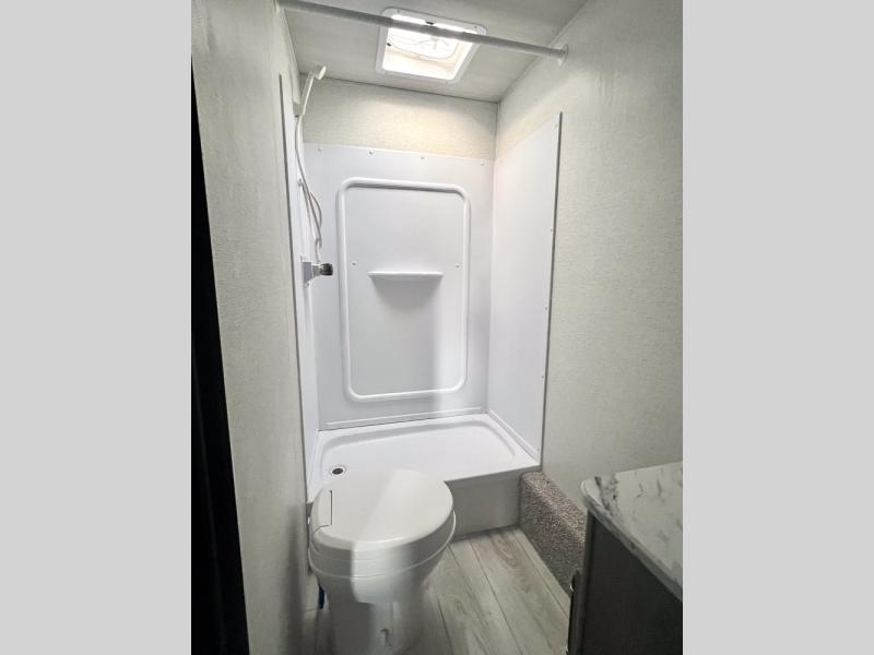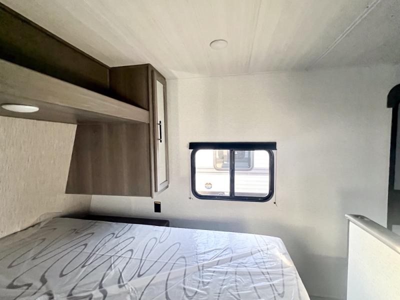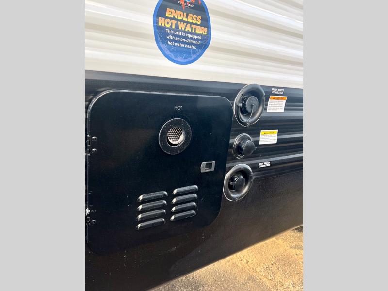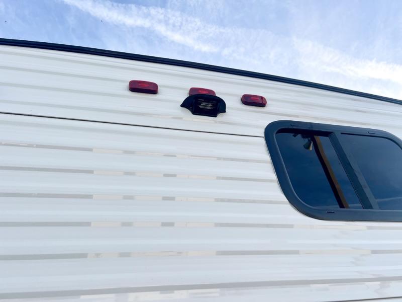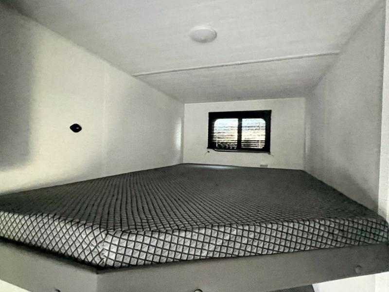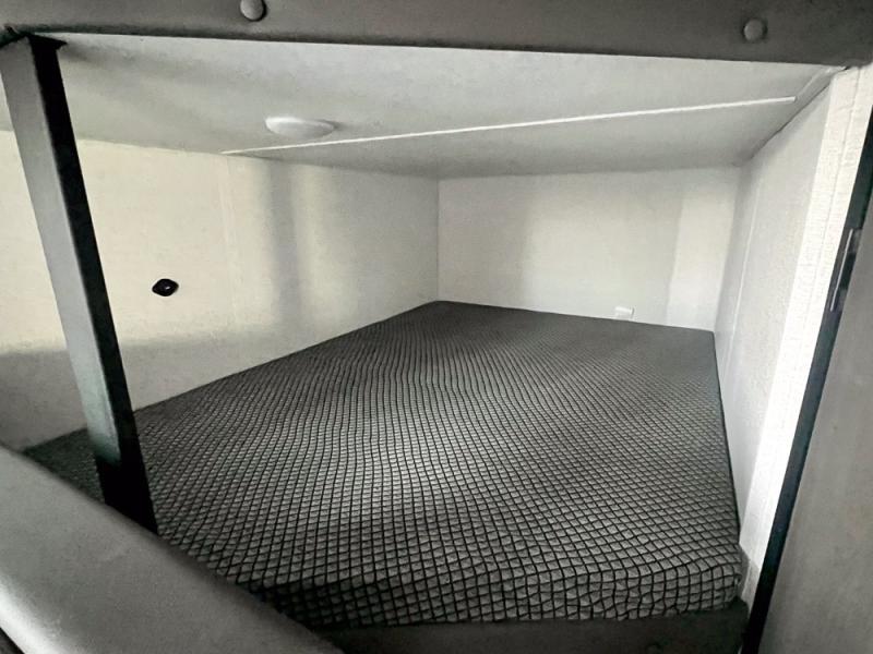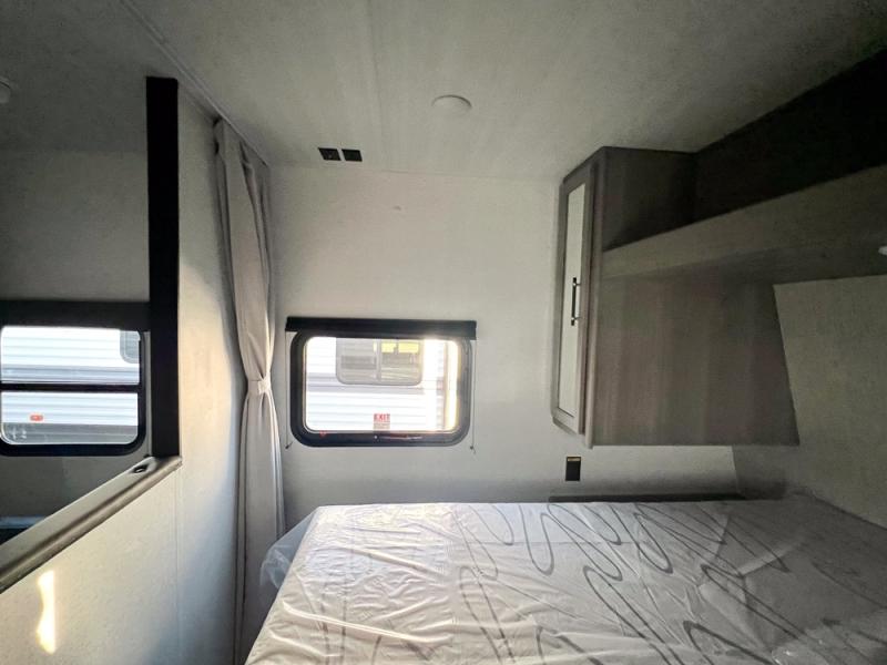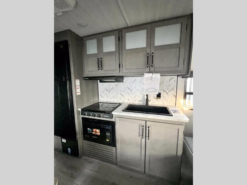 If you're looking for a travel trailer with a little more sleeping space, look no further than this unit! There are double-size bunks with inside and outside storage, a walk-around queen bed in the front bedroom, plus a sofa and booth dinette for even more sleeping space. The kitchen comes with a cooktop to cook meals on, a sink for clean up, and a 10 cu. ft. 12V refrigerator to store the milk and eggs. You will also find TV prep in this model if you enjoy movie nights while at the campground.