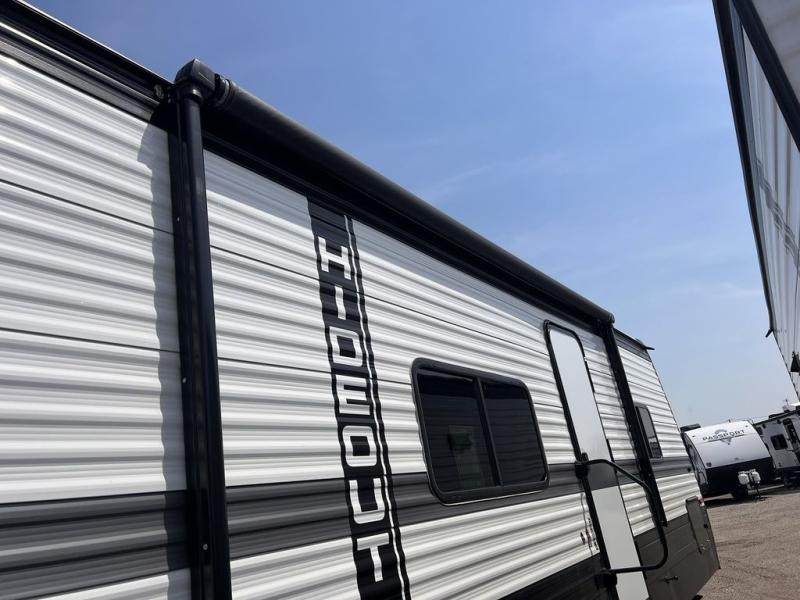 With any Hideout Sport Double Axle travel trailer by Keystone you will enjoy simplified camping solutions that won't break the bank! Each model is constructed with a durable aluminum exterior, tinted safety glass windows, a walkable roof, and an I-beam frame. There are power tongue jacks and heavy duty stabilizer jacks that will make it easier than ever to hitch up and go. An XL entry assist handle will also provide convenience, along with a power awning that will provide much wanted shade during the day. You will feel right at home inside with stylish decor, blackout night shades, and cozy queen bed with storage underneath!