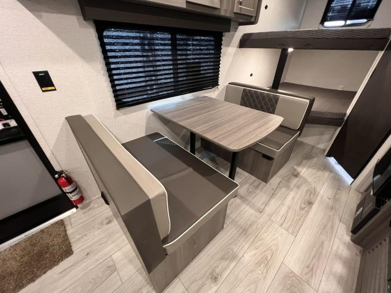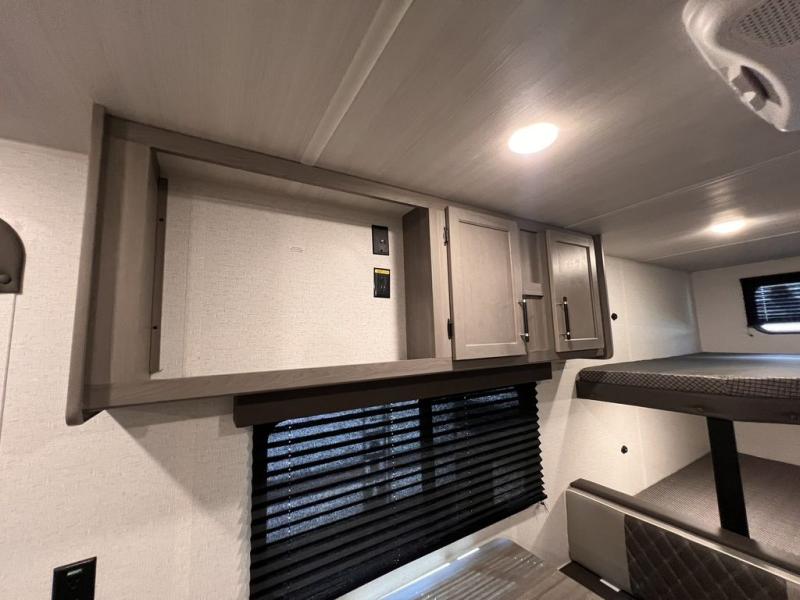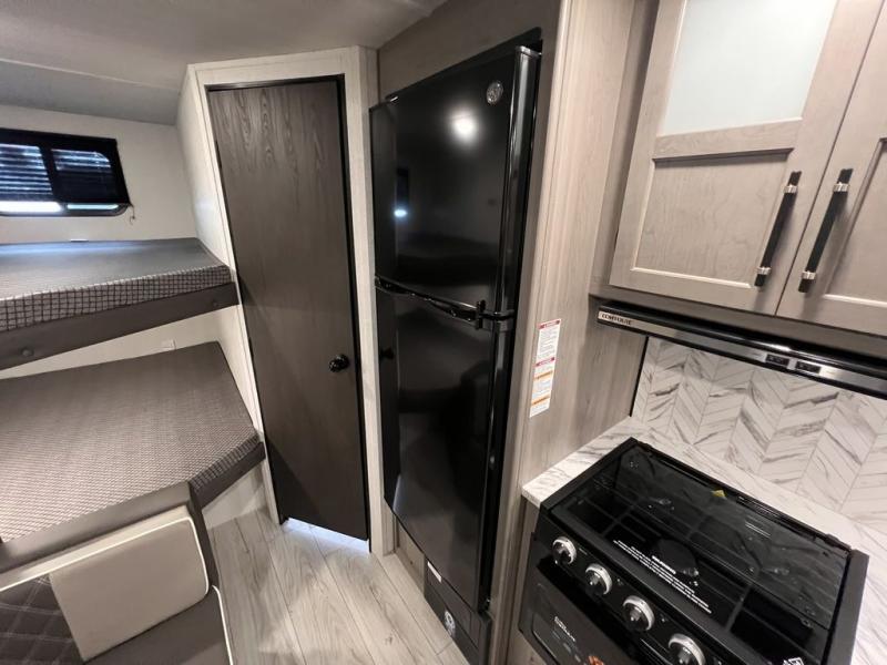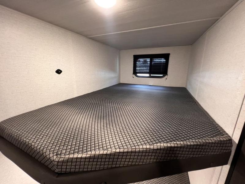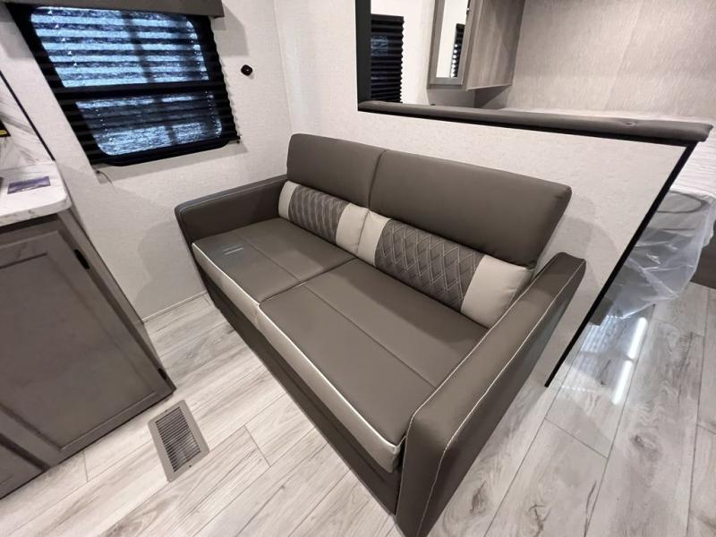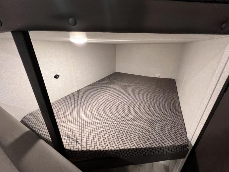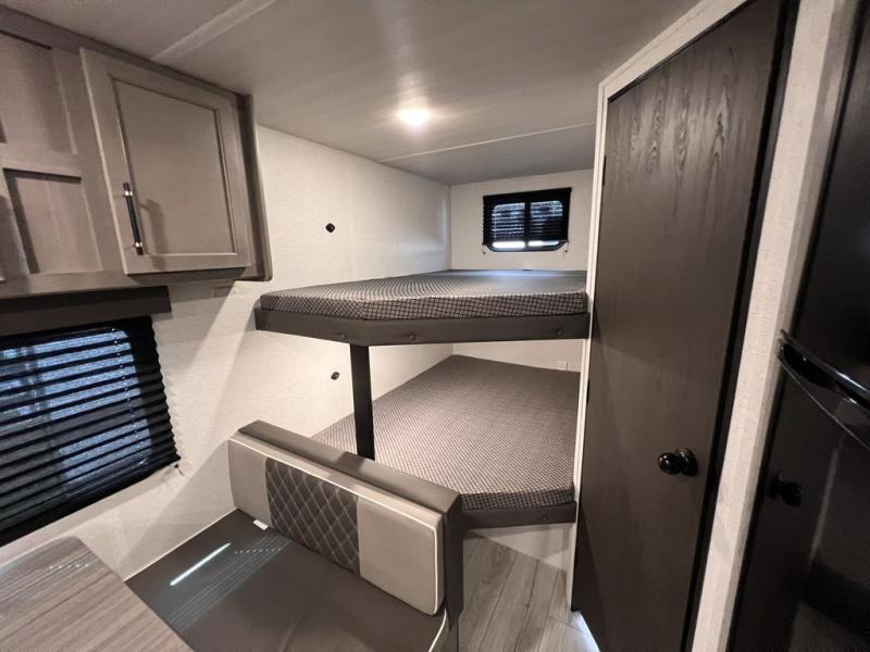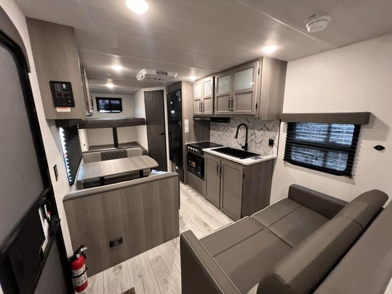If you're looking for a travel trailer with a little more sleeping space, look no further than this unit! There are double-size bunks with inside and outside storage, a walk-around queen bed in the front bedroom, plus a sofa and booth dinette for even more sleeping space. The kitchen comes with a cooktop to cook meals on, a sink for clean up, and a 10 cu. ft. 12V refrigerator to store the milk and eggs. You will also find TV prep in this model if you enjoy movie nights while at the campground.
