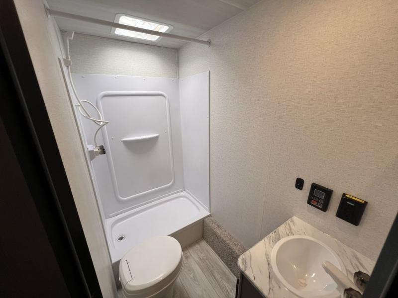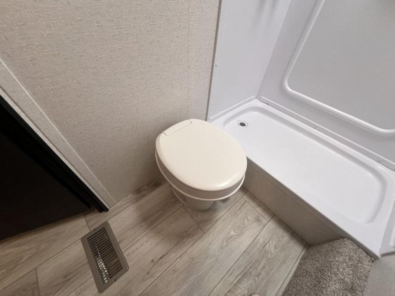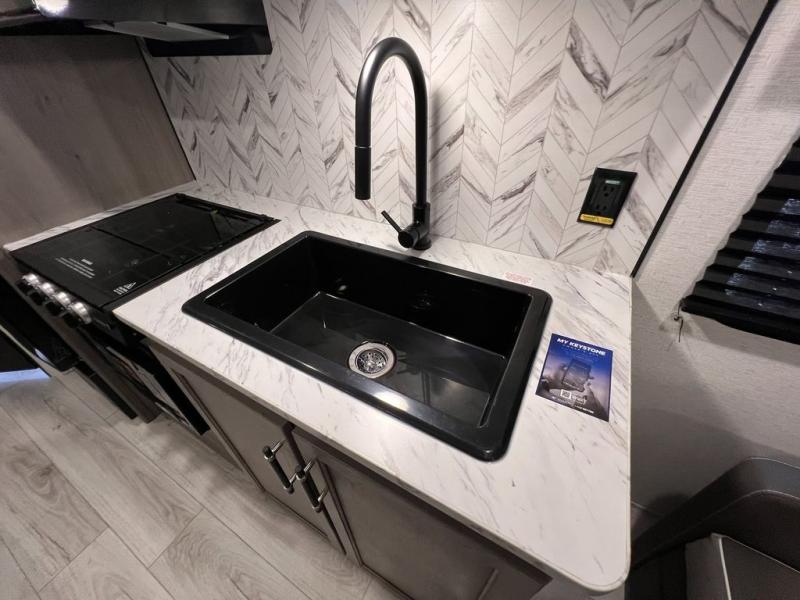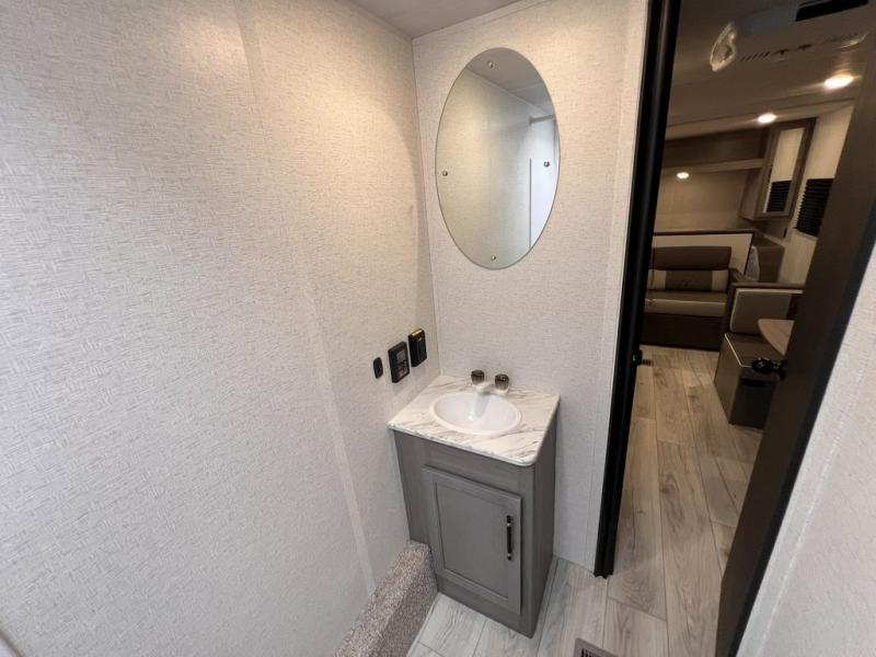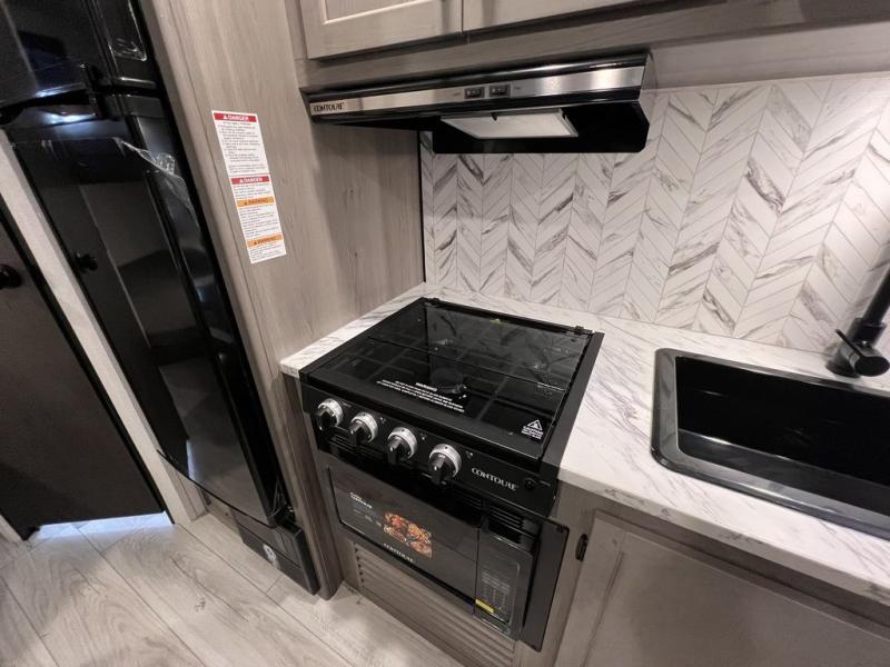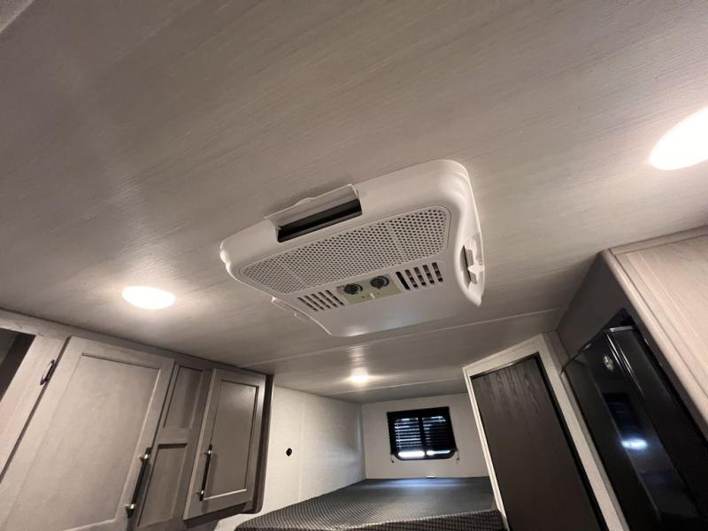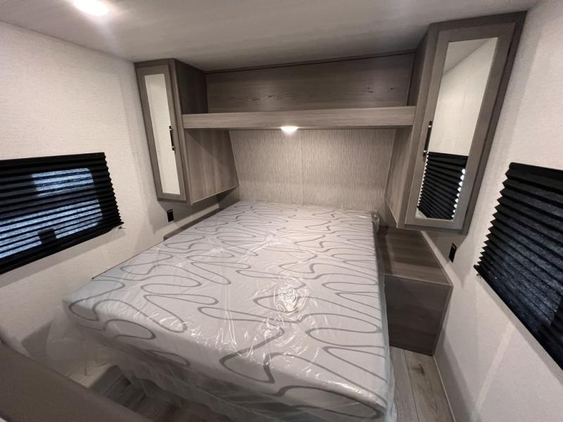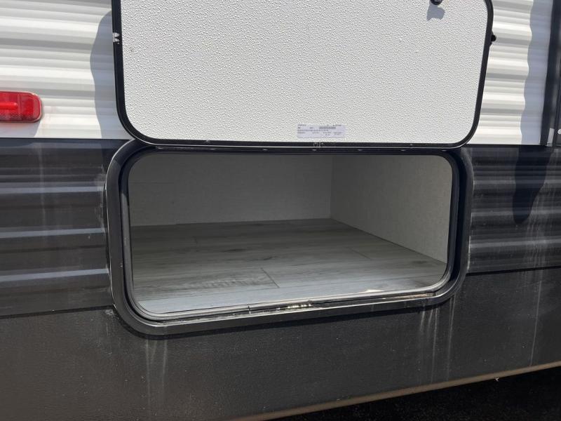 If you're looking for a travel trailer with a little more sleeping space, look no further than this unit! There are double-size bunks with inside and outside storage, a walk-around queen bed in the front bedroom, plus a sofa and booth dinette for even more sleeping space. The kitchen comes with a cooktop to cook meals on, a sink for clean up, and a 10 cu. ft. 12V refrigerator to store the milk and eggs. You will also find TV prep in this model if you enjoy movie nights while at the campground.