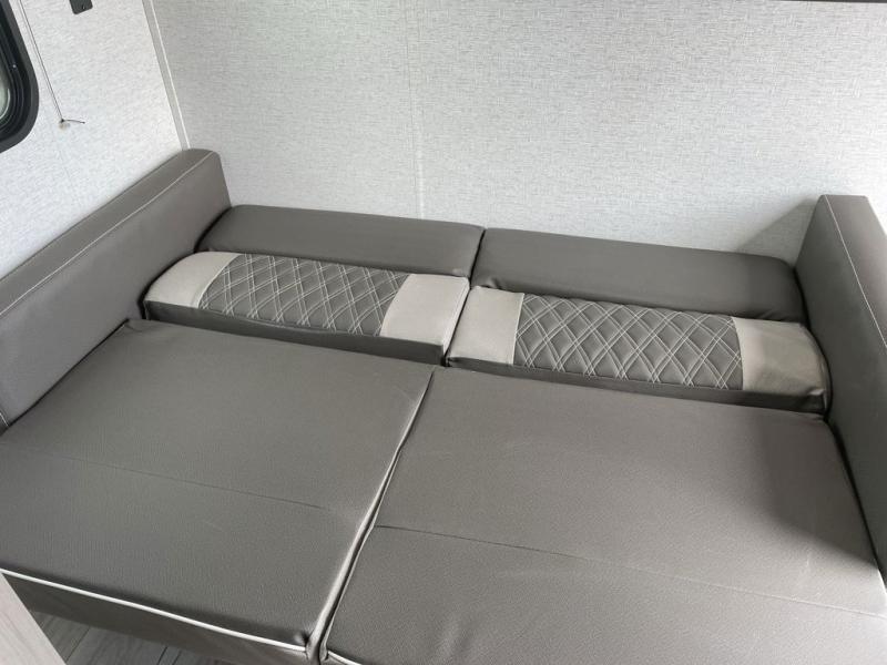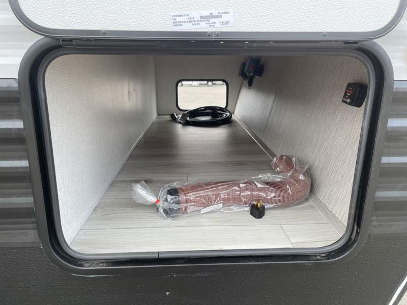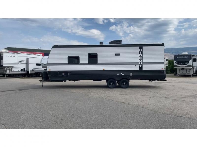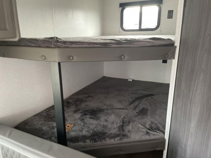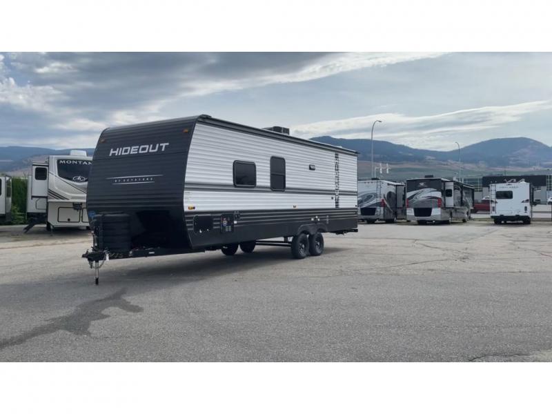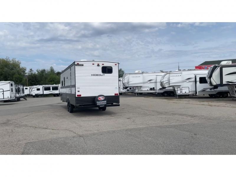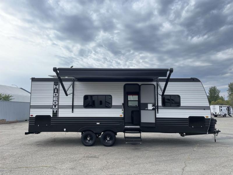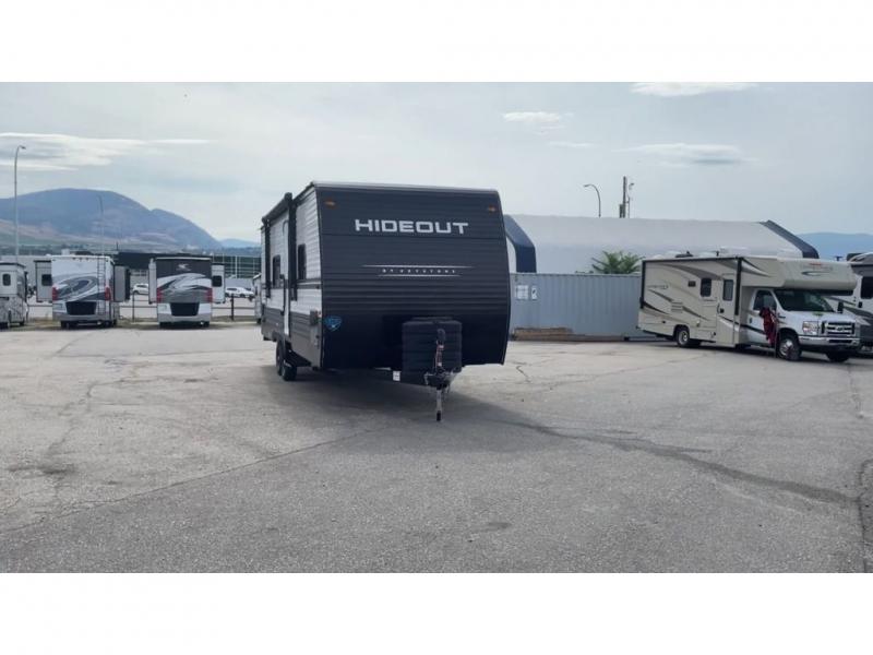 If you're looking for a travel trailer with a little more sleeping space, look no further than this Hideout Sport! There are double-size bunks with inside and outside storage, a walk-around queen bed in the front bedroom, plus a sofa and booth dinette for even more sleeping space. The kitchen comes with a cooktop to cook meals on, a sink for clean up, and a 10 cu. ft. 12V refrigerator to store the milk and eggs. You will also find TV prep in this model if you enjoy movie nights while at the campground.