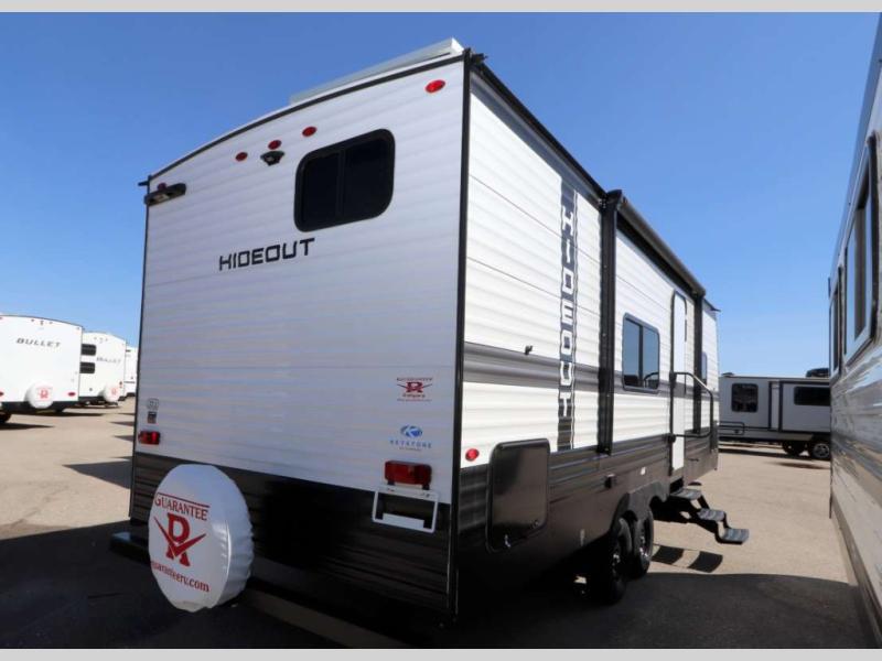 If you're looking for a travel trailer with a little more sleeping space, look no further than this Hideout Sport! There are double-size bunks with inside and outside storage, a walk-around queen bed in the front bedroom, plus a sofa and booth dinette for even more sleeping space. The kitchen comes with a cooktop to cook meals on, a sink for clean up, and a 10 cu. ft. 12V refrigerator to store the milk and eggs. You will also find TV prep in this model if you enjoy movie nights while at the campground.
