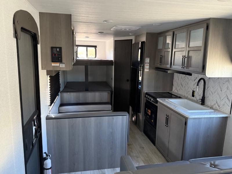 If you're looking for a travel trailer with a little more sleeping space, look no further than this Hideout Sport! There are double-size bunks with inside and outside storage, a walk-around queen bed in the front bedroom, plus a sofa and booth dinette for even more sleeping space. The kitchen comes with a cooktop to cook meals on, a sink for clean up, and a 10 cu. ft. 12V refrigerator to store the milk and eggs. You will also find TV prep in this model if you enjoy movie nights while at the campground.