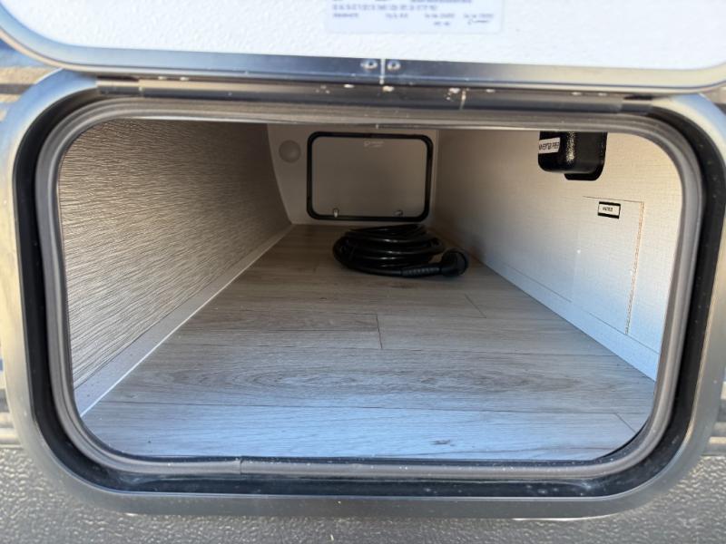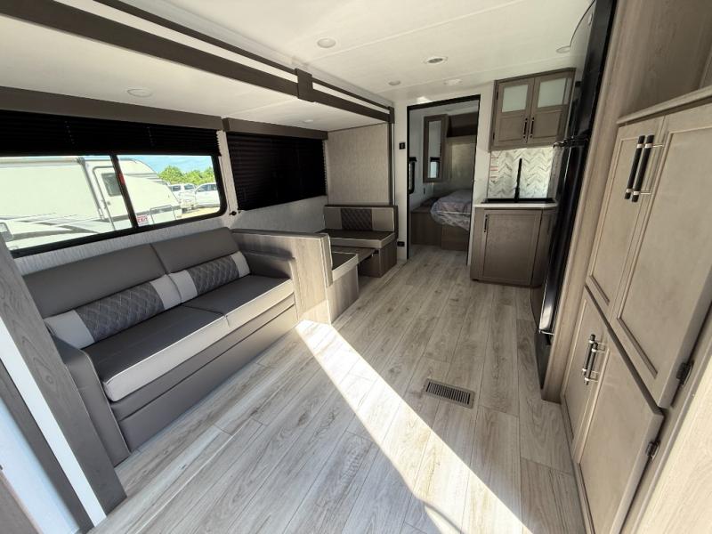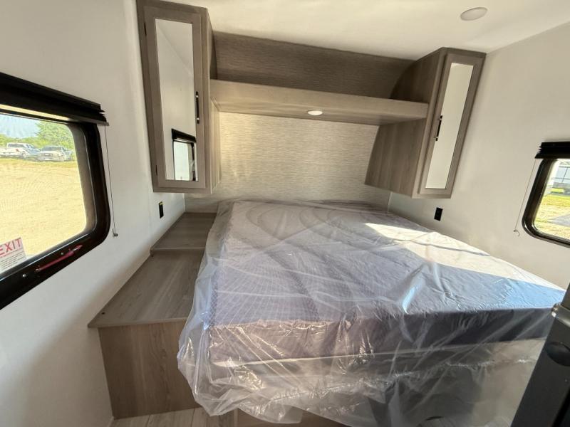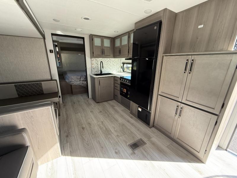 You'll feel right at home wherever you decide to camp in this travel trailer. The large slide out in the combined kitchen and living area gives your crew plenty of space to move about, plus there is a booth dinette and sofa for comfy seating and sleeping spaces. A full kitchen, compete with three burner cooktop and 10 cu. ft. 12V refrigerator will let you cook and store food for the whole week. Head to the full rear bath that includes a spacious vanity, a shower, toilet, and linen closet for clean towels. And when you're ready to catch some zzz's, the queen bed in the front private bedroom is sure to bring comfort!