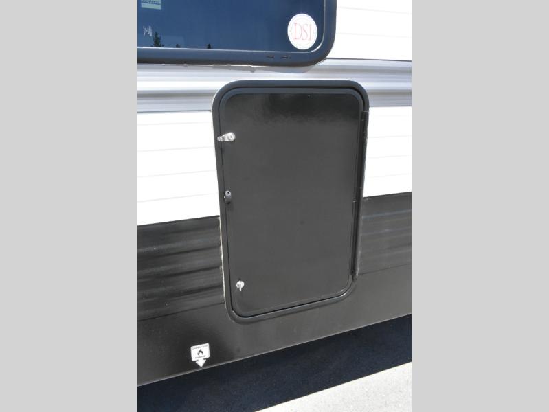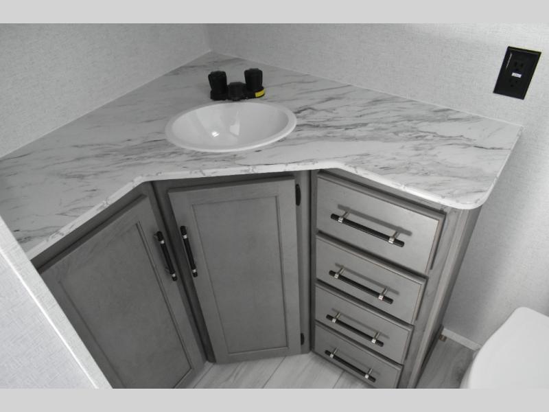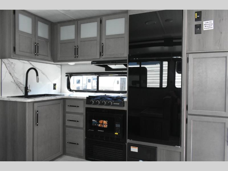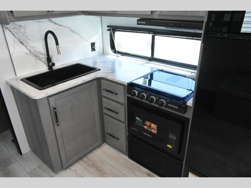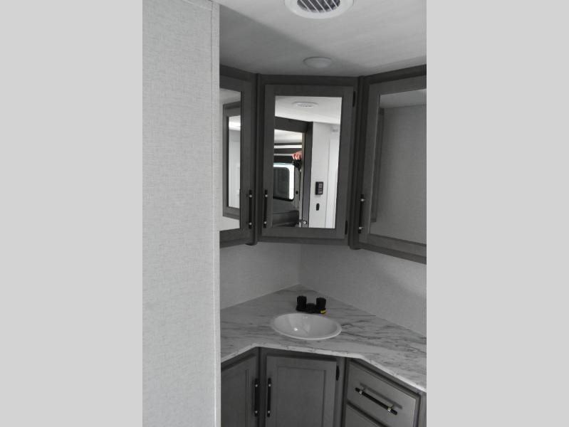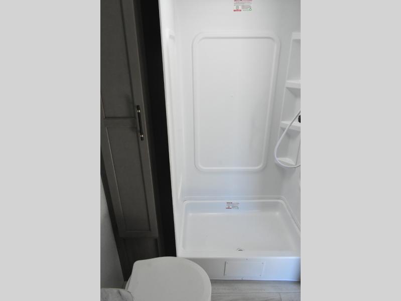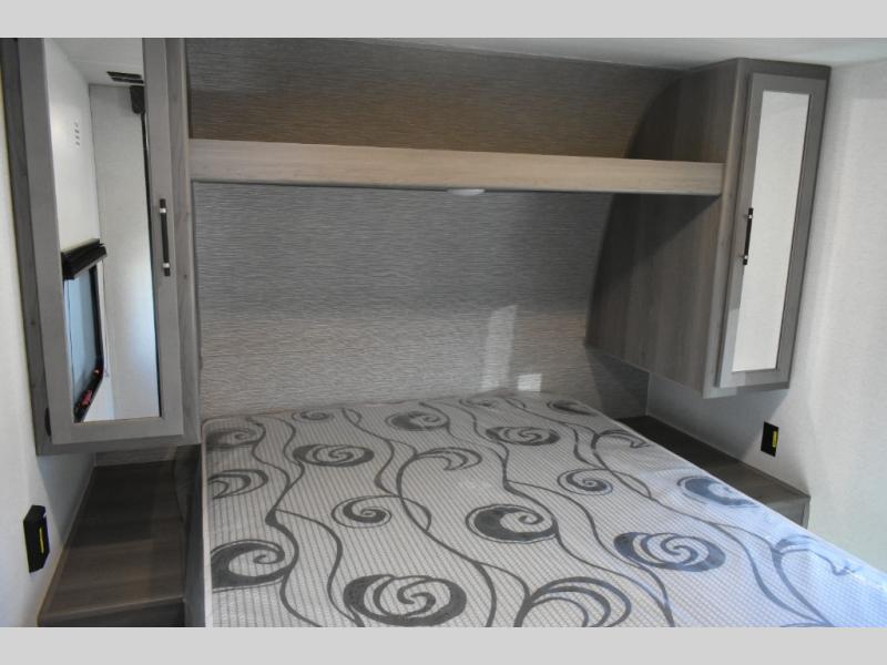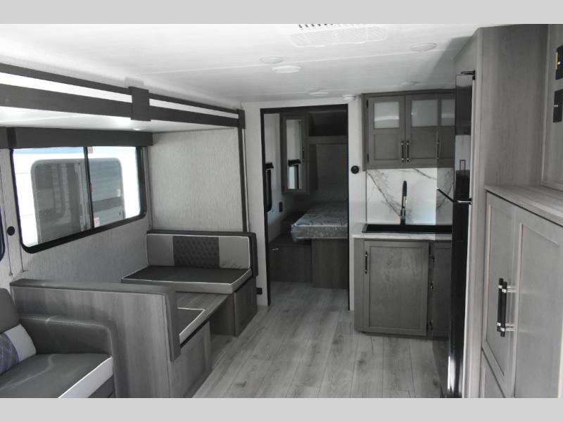 You'll feel right at home wherever you decide to camp in this travel trailer. The large slide out in the combined kitchen and living area gives your crew plenty of space to move about, plus there is a booth dinette and sofa for comfy seating and sleeping spaces. A full kitchen, compete with three burner cooktop and 10 cu. ft. 12V refrigerator will let you cook and store food for the whole week. Head to the full rear bath that includes a spacious vanity, a shower, toilet, and linen closet for clean towels. And when you're ready to catch some zzz's, the queen bed in the front private bedroom is sure to bring comfort!