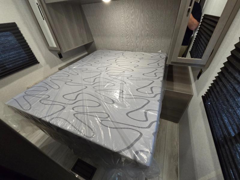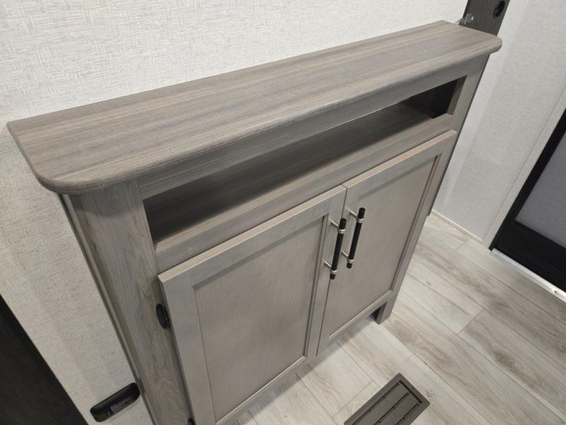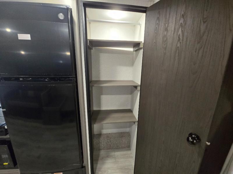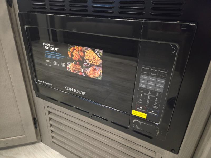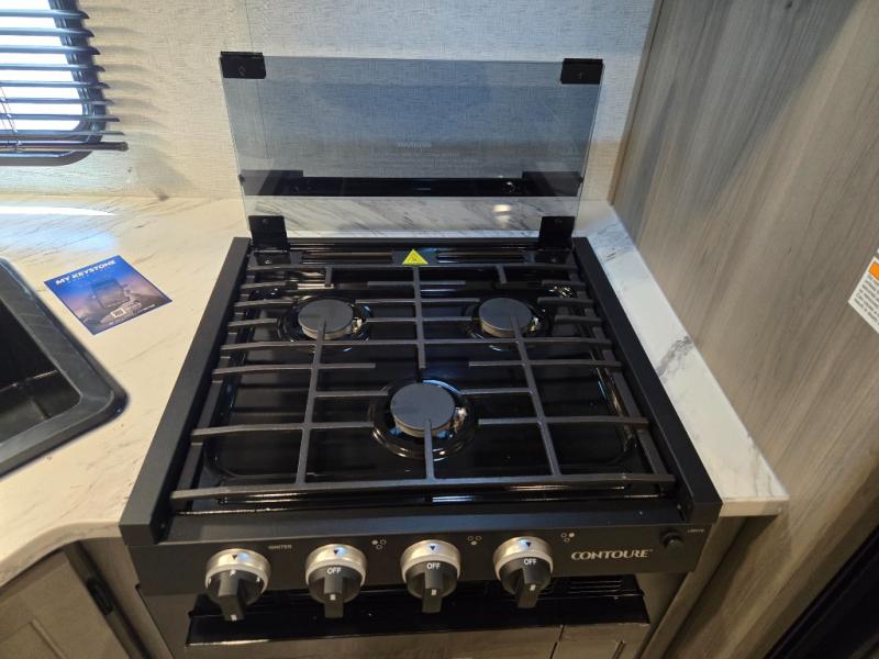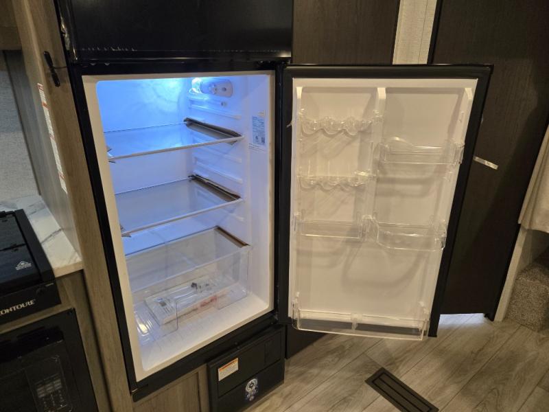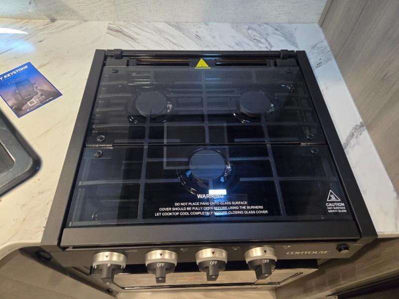 Meal prep is simple with a 3-burner cooktop, oven, microwave, and a spacious double-door refrigerator. Generous cabinet storage and counter space mean you’ll have everything you need for cooking at the campground or off the grid.