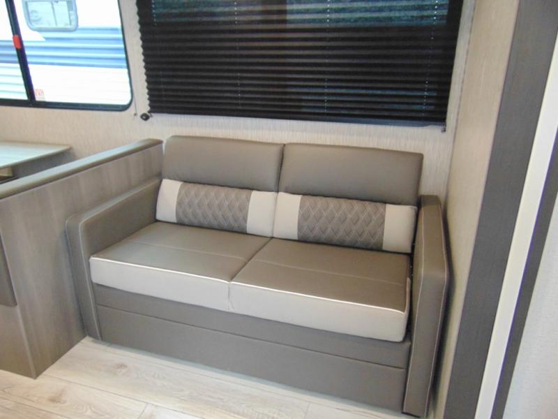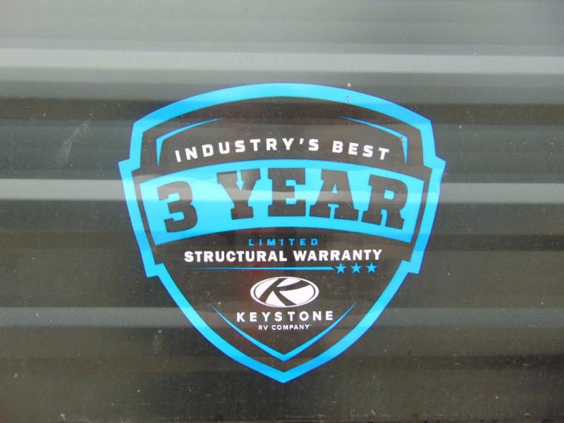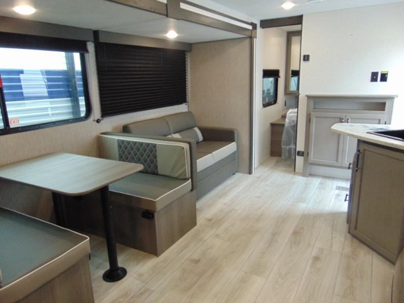 Pack your bags and head for the lake or woods in this spacious trailer! You can comfortably sleep nine to ten with the double-size bunks and the queen bed in the front private bedroom, plus the booth dinette and sofa in the main living area. There is even TV prep here if you want to add a television to the entertainment center for movie nights. The kitchen includes a 10 cu. ft. 12V refrigerator and an extra large pantry for food storage, plus a cooktop to prepare meals each day. The full bath included will let you clean up after a day of exploring outdoors, and you'll find the second entry door here for convenience!