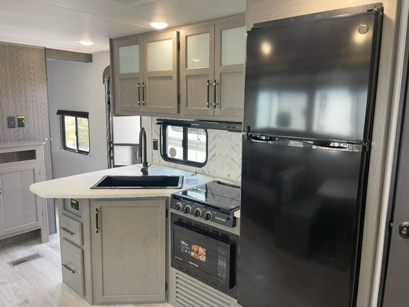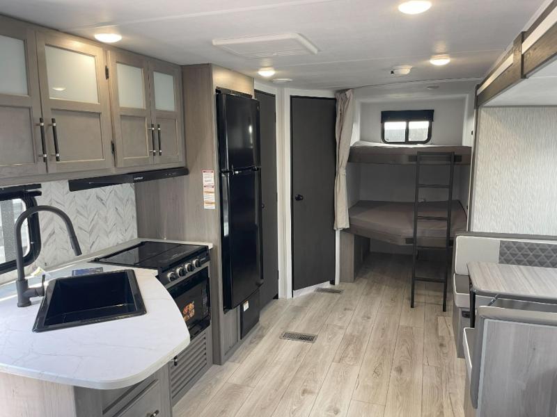 Pack your bags and head for the lake or woods in this spacious trailer! You can comfortably sleep nine to ten with the double-size bunks and the queen bed in the front private bedroom, plus the booth dinette and sofa in the main living area. There is even TV prep here if you want to add a television to the entertainment center for movie nights. The kitchen includes a 10 cu. ft. 12V refrigerator and an extra large pantry for food storage, plus a cooktop to prepare meals each day. The full bath included will let you clean up after a day of exploring outdoors, and you'll find the second entry door here for convenience!