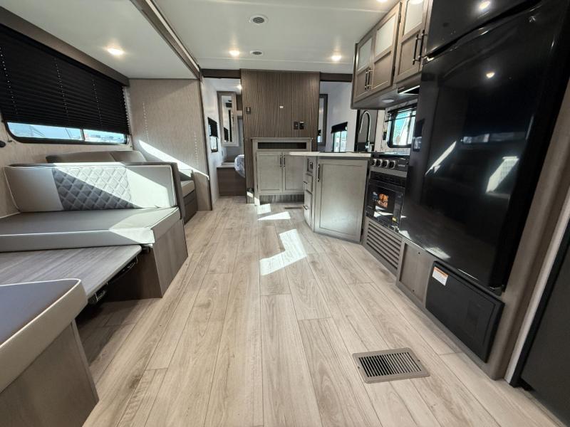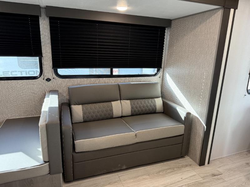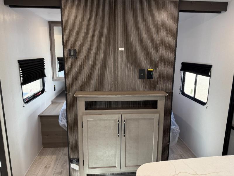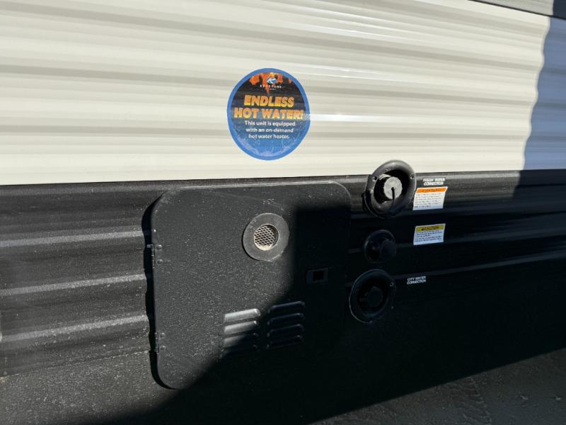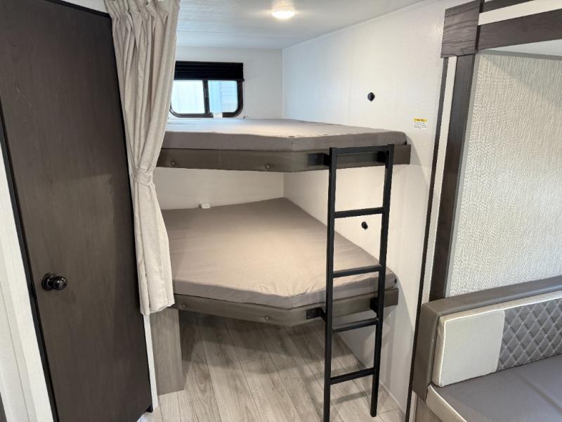 Pack your bags and head for the lake or woods in this spacious trailer! You can comfortably sleep nine to ten with the double-size bunks and the queen bed in the front private bedroom, plus the booth dinette and sofa in the main living area. There is even TV prep here if you want to add a television to the entertainment center for movie nights. The kitchen includes a 10 cu. ft. 12V refrigerator and an extra large pantry for food storage, plus a cooktop to prepare meals each day. The full bath included will let you clean up after a day of exploring outdoors, and you'll find the second entry door here for convenience!