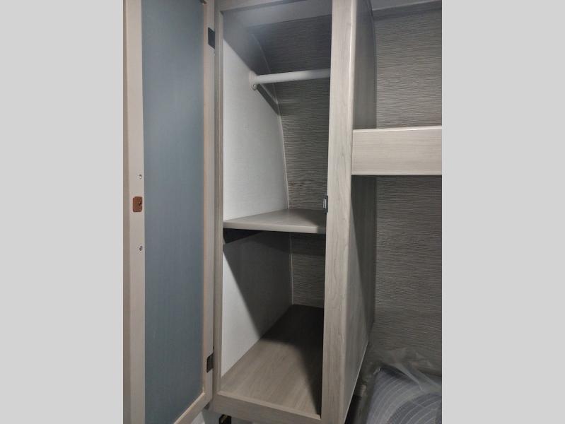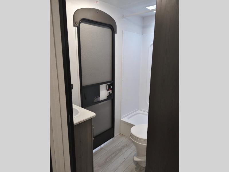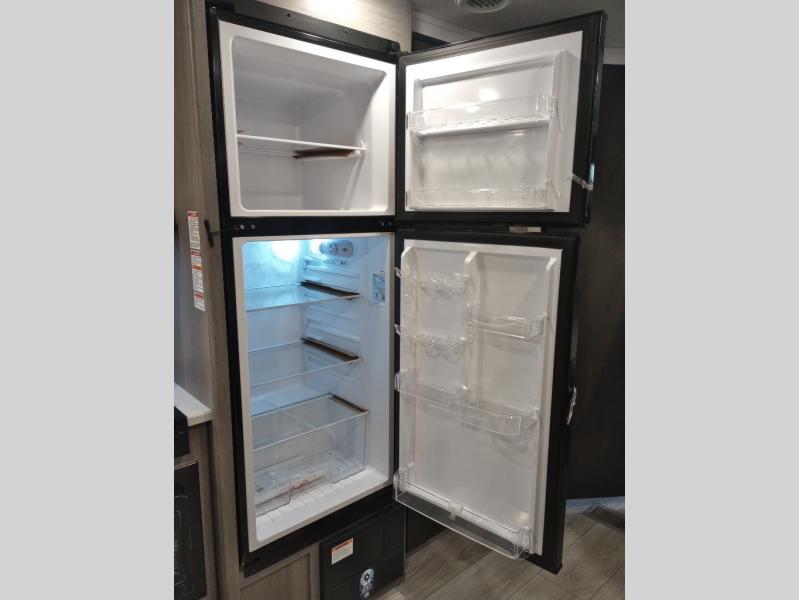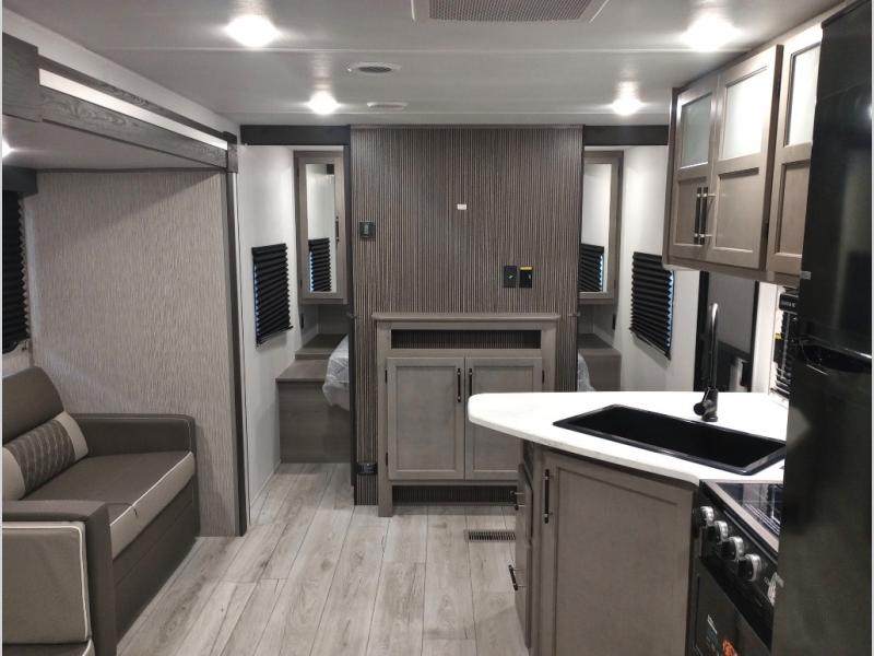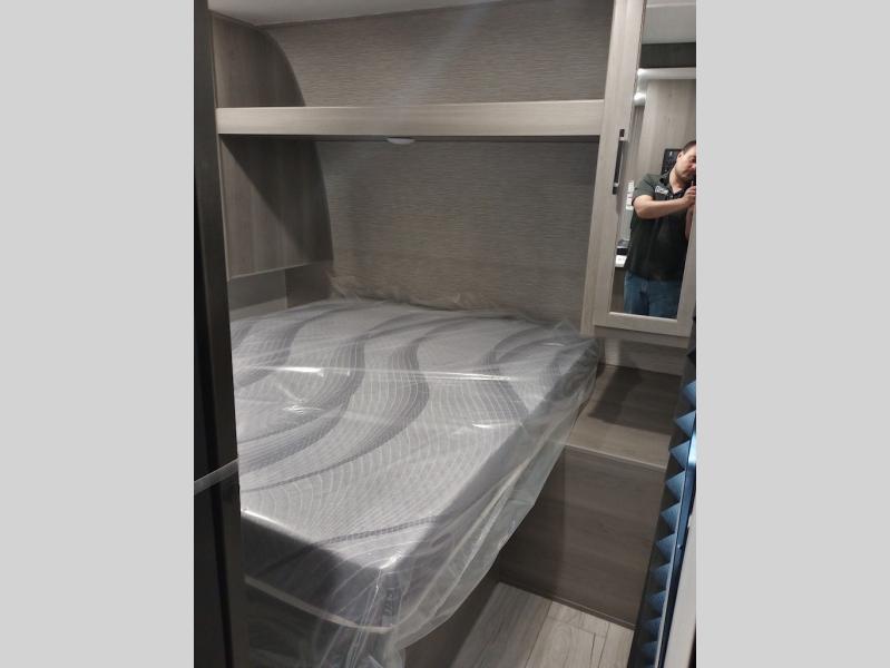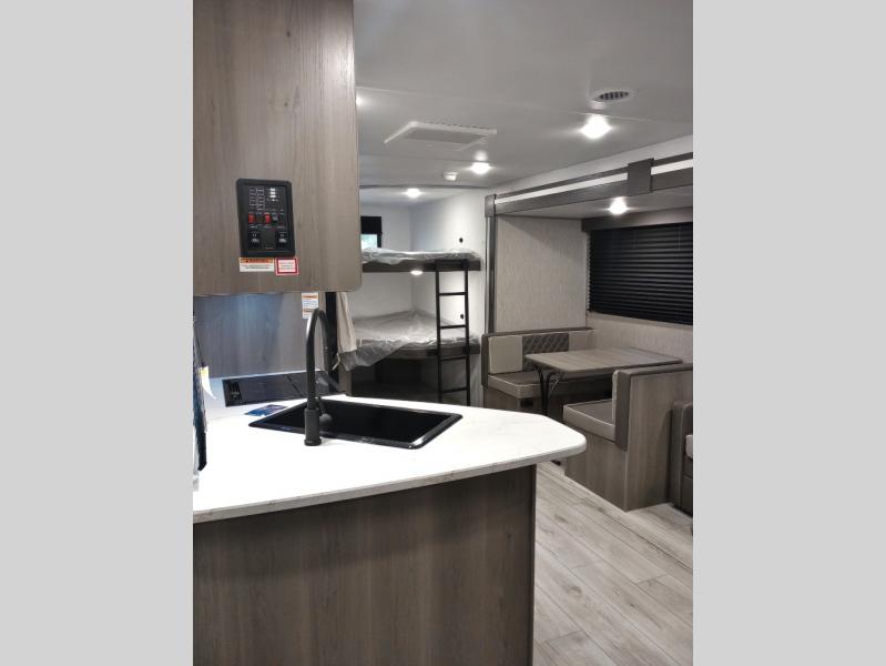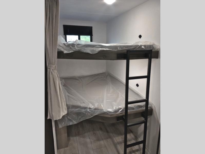 Pack your bags and head for the lake or woods in this spacious trailer! You can comfortably sleep nine to ten with the double-size bunks and the queen bed in the front private bedroom, plus the booth dinette and sofa in the main living area. There is even TV prep here if you want to add a television to the entertainment center for movie nights. The kitchen includes a 10 cu. ft. 12V refrigerator and an extra large pantry for food storage, plus a cooktop to prepare meals each day. The full bath included will let you clean up after a day of exploring outdoors, and you'll find the second entry door here for convenience!
