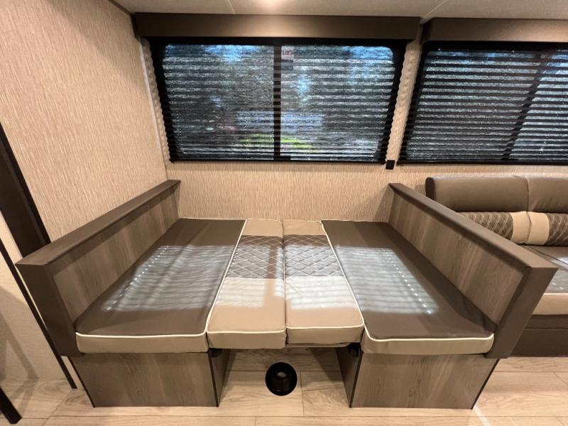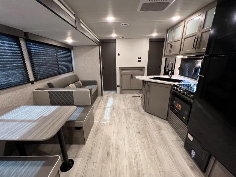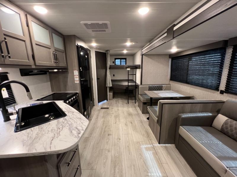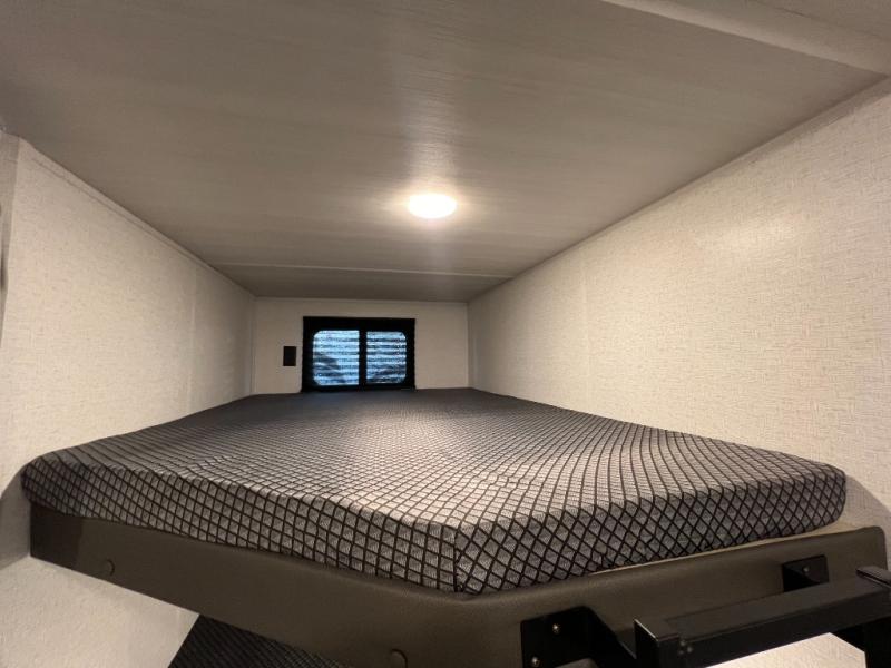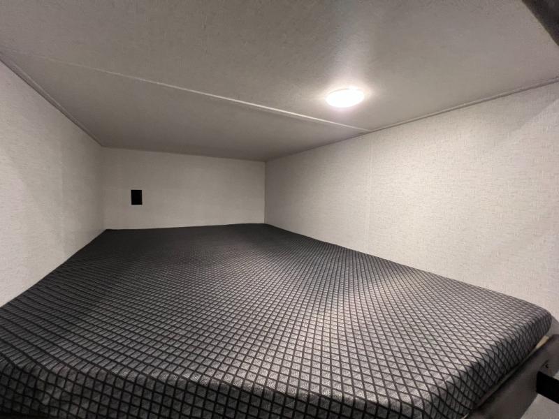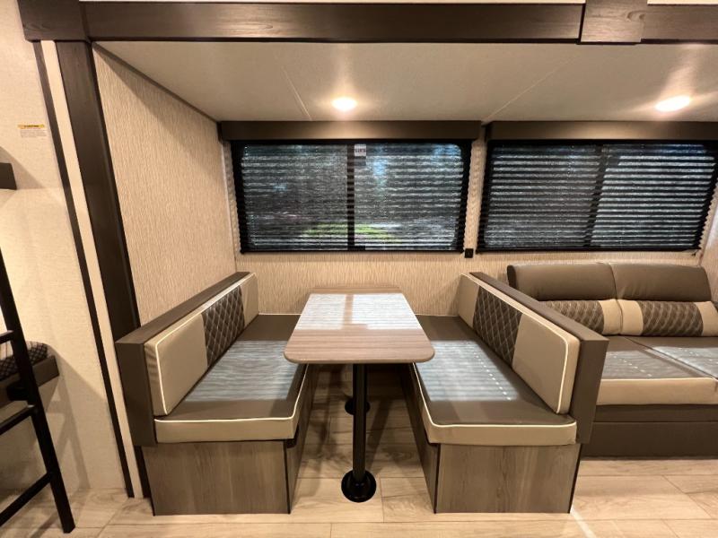 Pack your bags and head for the lake or woods in this spacious trailer! You can comfortably sleep nine to ten with the double-size bunks and the queen bed in the front private bedroom, plus the booth dinette and sofa in the main living area. There is even TV prep here if you want to add a television to the entertainment center for movie nights. The kitchen includes a 10 cu. ft. 12V refrigerator and an extra large pantry for food storage, plus a cooktop to prepare meals each day. The full bath included will let you clean up after a day of exploring outdoors, and you'll find the second entry door here for convenience!